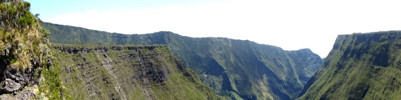 A gauche : Le Petit Bras Magasin et la Cascade du Bras MagasinAu centre : Le Piton Dorseuil, la Vallée de la Rivière des Marsouins et celle du Bras Cabot.