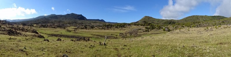 A gauche : Les prairies de BiberonAu centre : Le Piton de la Source et le Piton Rouge. La Fournaise derrière le nuage