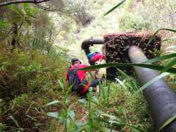 Il faut, pour admirer la vallée et les cascades, remonter la canalisation de la Ravine des Fleurs Jaunes dans le cirque de Salazie. Le point de vue se situe au cassé de la Rivière des Fleurs Jaunes.