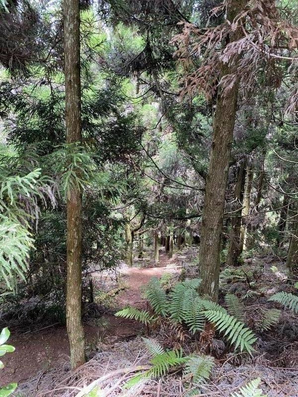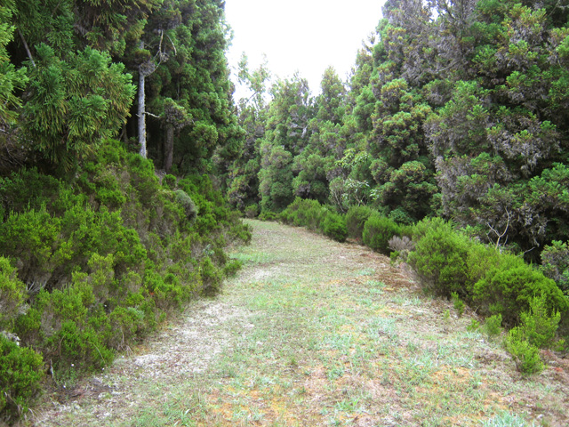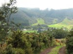 Deux solutions possibles à partir de l'oratoire : revenir sur ses pas vers le réservoir repéré en début de piste ou bien dégoter dans les branles verts proches de l'autel le petit sentier qui plonge dans sa trouée (Photo 9). Le mot plongée s'applique très bien à ce départ dans les branles verts et les fougères sur un sol glissant, certainement dangereux par temps de pluie. On a vite fait de voir, en s'accrochant aux branches qu'il ne comportera pas de lacets pour se reposer. Heureusement il est court car on sait bien que le piton ne dépasse que d'une centaine de mètres au-dessus des prairies. Il traverse branles et bois de couleurs (Photo 10) avant d'effectuer quelques lacets dans la forêt de cryptomerias (Photo 11). La descente est sérieuse et le sentier bien marqué. En arrivant à un minuscule oratoire également dédié à la Vierge, on comprend pourquoi il semblait être régulièrement pratiqué (Photo 12). Le sentier surgit sur une piste herbeuse au milieu des vieux cryptomerias (Photo 13).