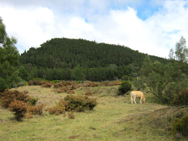 La randonnée peut débuter n'importe où mais il est plus facile de se garer près de la station de pompage décrite dans l'itinéraire ci-dessous. Près du bloc et son Gouzou, partir sur la petite route en longeant les prairies dominées au loin par le Piton Rouge (Photo 1). La route se transforme en piste toujours bordée de prés envahis d'acacias noirs qui abritent les troupeaux (Photo 2). Plus haut, à l'approche d'une réserve d'eau sur la droite, ce sont les ajoncs d'Europe qui ont pris possession des prairies situées au pied du Piton Dugain, tout proche (Photo 3). On s'approche d'un château d'eau sur la gauche, juste en face des dernières clôtures gardant les troupeaux (Photo 4). Laisser la piste continuant vers la gauche et commencer la montée par celle de droite. La courte ascension de 50 m de dénivelé commence sous les cryptomerias. On rencontre même quelques bois de couleurs et des pins d'Oregon qui laissent passer le regard vers la Plaine des Cafres (Photo 5). La piste effectue une longe boucle vers la gauche en poursuivant la montée et se termine sous les pins d'Oregon laissant au sol leurs aiguilles rougies (Photo 6). On arrive très vite au sommet occupé par un grand oratoire victime des intempéries qui le grisonnent un peu (Photo 8). Une niche abrite une Vierge devant une croix blanche qui ne se voit guère de loin en raison de la taille des arbres. L'édifice comporte même un autel pour sans doute y faire des messes.