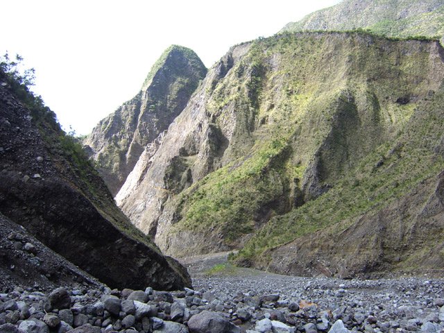 Première journée d'une sortie sur deux jours à Grand Bassin : la descente depuis Bois Court jusqu'au voile de la mariée ne se présente plus, elle est toujours aussi agréable, grand matin, entre forêt des hauts au début jusqu'à la semi-sèche tout en bas, et des vues toujours aussi remarquables. J'ai bien trouvé la petite ravine pour le "raccourci acrobatique" décrit sur la fiche, mais j'ai préféré assurer, étant tout seul et peu habitué à être "encordé"!, en prenant le sentier officiel pour rattraper le bras des Roches Noires. Je ne suis allé "que" jusqu'au lieu-dit Les Meules, après avoir fait un détour par l'îlet Commandeur : n'ayant pas prévenu le propriétaire des lieux (avec qui nous partageons des camarades en commun), et ne voulant pas du tout le gêner si il y était, j'ai fait demi-tour une fois arrivé sur le plateau. L'endroit est très beau, avec un intérêt écologique particulier, il est donc bien normal de respecter le lieu et l'habitant qui "la met' a li en lèr !". Quoiqu'il en soit, je confirme les dires de Christian, il fait très chaud dans cette vallée extraordinaire, les innombrables galets (noirs au début, puis blancs !) roulent parfois sous les pieds, l'eau est délicieuse pour se rafraîchir, on se sent seul au monde... et les genoux sont mis à l'épreuve ! Mais j'y retournerais sous peu pour aller jusqu'à La Pompe (voire même explorer, comme le propose Christian, en direction de l'îlet Malabars ?).