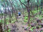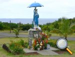 La randonnée débute ici à l'ancien emplacement de la Vierge au Parasol. Cette statue de la Vierge munie d'un grand parasol, vandalisée et déplacée maintes fois, a quitté depuis longtemps son piédestal du Grand Brûlé mais le lieu demeure ainsi qu'un arrêt de bus jamais supprimé. C'est la solution choisie pour refaire cette fiche afin d'éviter un aller-retour par le sentier et ne pas emprunter la trop longue Route des Laves. Près d'un oratoire rouge dédié à Saint-Expedit débute la piste forestière du Quai de la Vierge qui se dirige vers la mer (Photo 1). Elle ondule entre filaos et bois de chapelets en pente douce sur un terrain de gratons tassés bordé d'orchidées bambou (Photo 2). On arrive rapidement au départ du Sentier des Laves. Lorsque l'on entend les vagues battre les falaises basaltiques, ne pas hésiter à s'en approcher par le sentier escarpé qui file droit pour apprécier le côté sauvage de l'endroit prisé par les pêcheurs. Revenir au départ du Sentier des Laves qui débute dans les fougères. La trace est discrète mais visible. Le sol est immédiatement recouvert de nombreuses racines, puis, plus loin de quelques roches qu'il faut éviter (Photo 3). La trace, balisée de bleu, est facile à suivre même lorsque les invasives tentent de reprendre leur place (Photo 4). Ne pas manquer la petite grotte sur la droite avant d'effectuer la première descente en direction de la mer bordée de beaux filaos (Photo 5). On aura ainsi de nombreuses possibilités de s'approcher du bord proche ou accessible par des sentes de pêcheurs. Les premiers goyaviers font leur apparition mais ne gênent pas la progression malgré leur nombre et leur taille (Photo 6). Moins de trente minutes après le départ, on arrive à la coulée de 2002. Vingt ans après son écoulement vers la mer, elle se couvre lentement de lichens et se traverse sur un sentier tracé dans les laves (Photo 7). La végétation change encore pour être remplacée par de l'herbe sous les filaos (Photo 8). Très vite, après avoir plongé sous le couvert de la végétation, le sentier s'approche de la Piste forestière du Quai Neuf. Avant de poursuivre, ne pas hésiter à se rendre sur cette longue surface basaltique créée en 2004 par une éruption assez importante. On peut facilement marcher là où se rassemblent les pêcheurs pour y admirer la mer démontée ou les baleines à la saison. Remonter vers la piste en délaissant une tombe ainsi qu'un bloc de béton et marcher 200 mètres avant de retrouver le sentier repartant sur la gauche (Photo 9). Après une courte descente, le sentier s'approche de la coulée de 2004, plus facilement reconnaissable à ses larges plaques de lave lisse (Photo 10). Cette coulée est criblée de tunnels de lave de plus en plus difficile à trouver à travers les filaos. Le panneau de départ prévoit une altitude de 83 m, la coulée à 31 m, alors que l'on a descendu moins de 4 m. En moins de 5 minutes on traverse la coulée qu'on retrouvera un peu plus loin après avoir franchi quelques sous-bois verdoyants (Photo 11). Le sentier n'est plus très large mais toujours aussi bien tracé dans les filaos et les fougères (Photo 12). La marche n'est jamais monotone puisque le terrain monte et descend constamment sur un sentier qui ondule pour éviter quelques reliefs du terrain. Il part à la rencontre d'une végétation très variée où circulent des centaines d'énormes achatinesEspèce d'escargot à la coquille allongée pouvant atteindre 15 cm pour 200 g qu'on bouscule facilement du pied. Il traverse aussi une importante étendue de manioc, de tabac marron (Photo 13) puis de pandanus (vacoas) lorsqu'il passe au plus près des vagues (Photo 14). On traverse bientôt une nouvelle coulée de 2002, la troisième depuis le rempart de Bois Blanc et la deuxième de cette randonnée. En 20 ans, les fougères remplacent les lichens et les filaos y sont déjà grands par endroits (Photo 15). Le terrain devient plus chaotique avec des ornières, des roches, des fissures à travers les goyaviers (Photo 16). On remarque même sur la droite du sentier, une entrée de tunnel de lave. Rien d'extraordinaire dans ce court boyau qui peut représenter une pause ludique à 2h30 du point de départ (Photo 17). Compter encore trente minutes de goyaviers, ornières et fissures ou filaos brûlés avant de s'approcher de la coulée de 2007 (Photo 18). Le sentier effectue même une longue incursion vers l'ouest pour arriver à la fin de la route forestière venant de la RN2. Il aura fallu attendre 15 ans pour pouvoir traverser ces laves qui ont mis longtemps à refroidir. Un sentier net et bordé de pierres de lave a été créé et atteint la nouvelle plage du Tremblet après une agréable marche offrant de superbes panoramas sur la totalité de la coulée (Photo 19). Ce sentier original serpente entre les aspérités du terrain (Photo 20). Les poteaux de l'ONF déconseillent de sortir de ce sentier mais il serait difficile d'y parvenir sans se blesser sur les blocs acérés empilés sur plusieurs mètres de hauteur (Photo 21). Des travaux de terrassement ont même été exécutés pour franchir les endroits les plus sensibles (Photo 22). Il faut compter près de 30 minutes pour parvenir à la nouvelle plage du Tremblet qu'on domine par de beaux points de vue (Photo 23). Le balisage bleu se poursuit le long de la falaise dominant la plage, là où coulent parfois d’éphémères cascades (Photo 24). Par forte houle, la plage recouverte d'olivine peut être dangereuse (Photo 25). On devine au loin la carcasse déchirée du Tresta Star qui semble avoir pris racine pour de longues années (Photo 26). On la distingue depuis le Quai de Sel servant de point de départ au sentier remontant le rempart en direction du Tremblet ou du sentier vers Saint-Philippe (Photo 27). La fin de cette sortie s'effectue en montée sur une route étroite, bordée de verdure (Photo 28). A la RN2, repartir à droite p