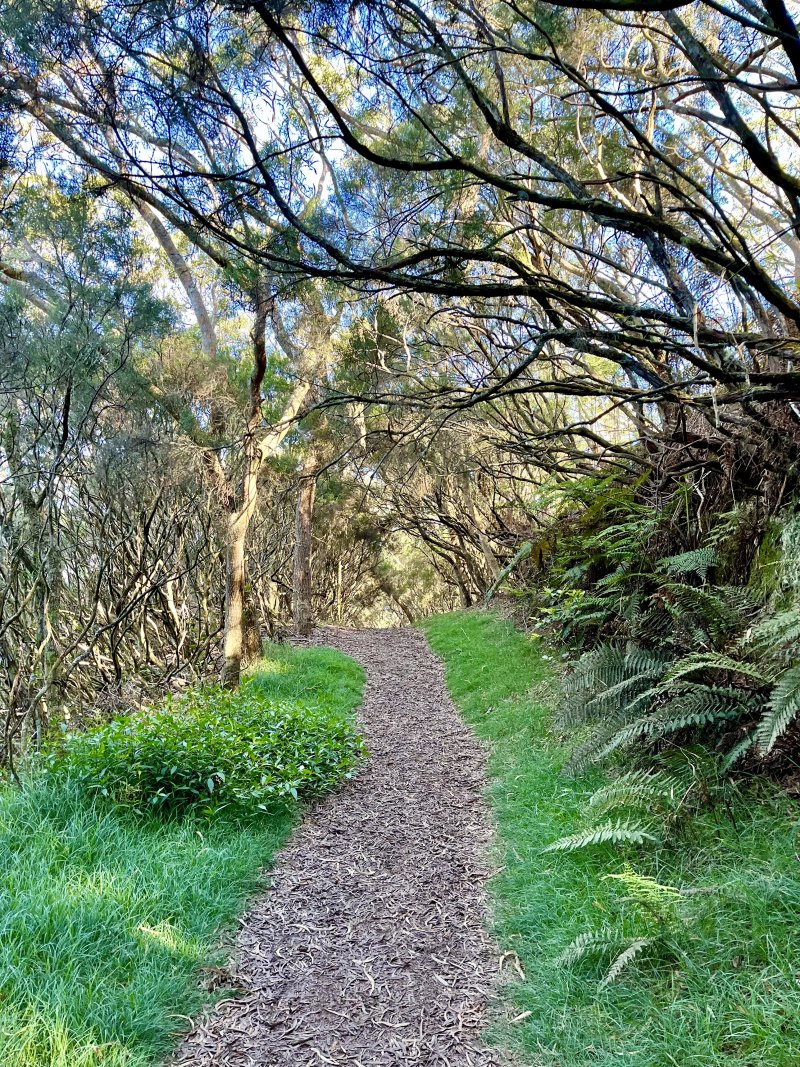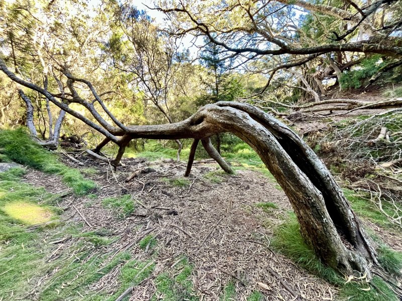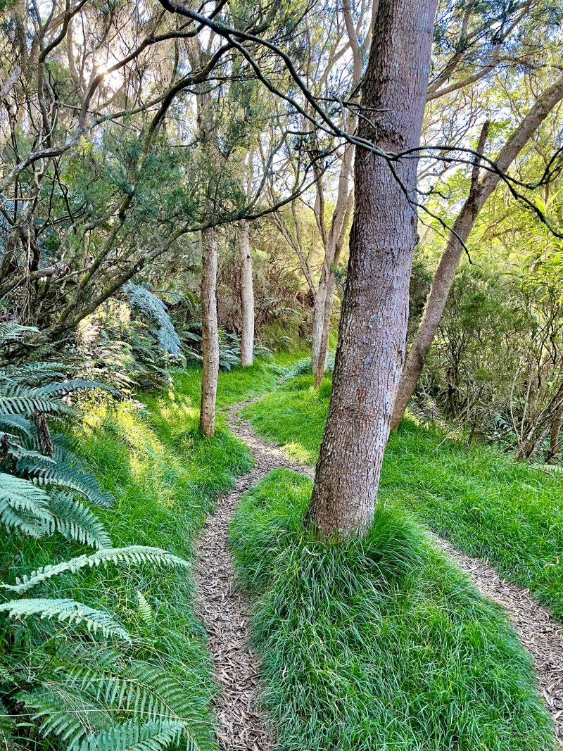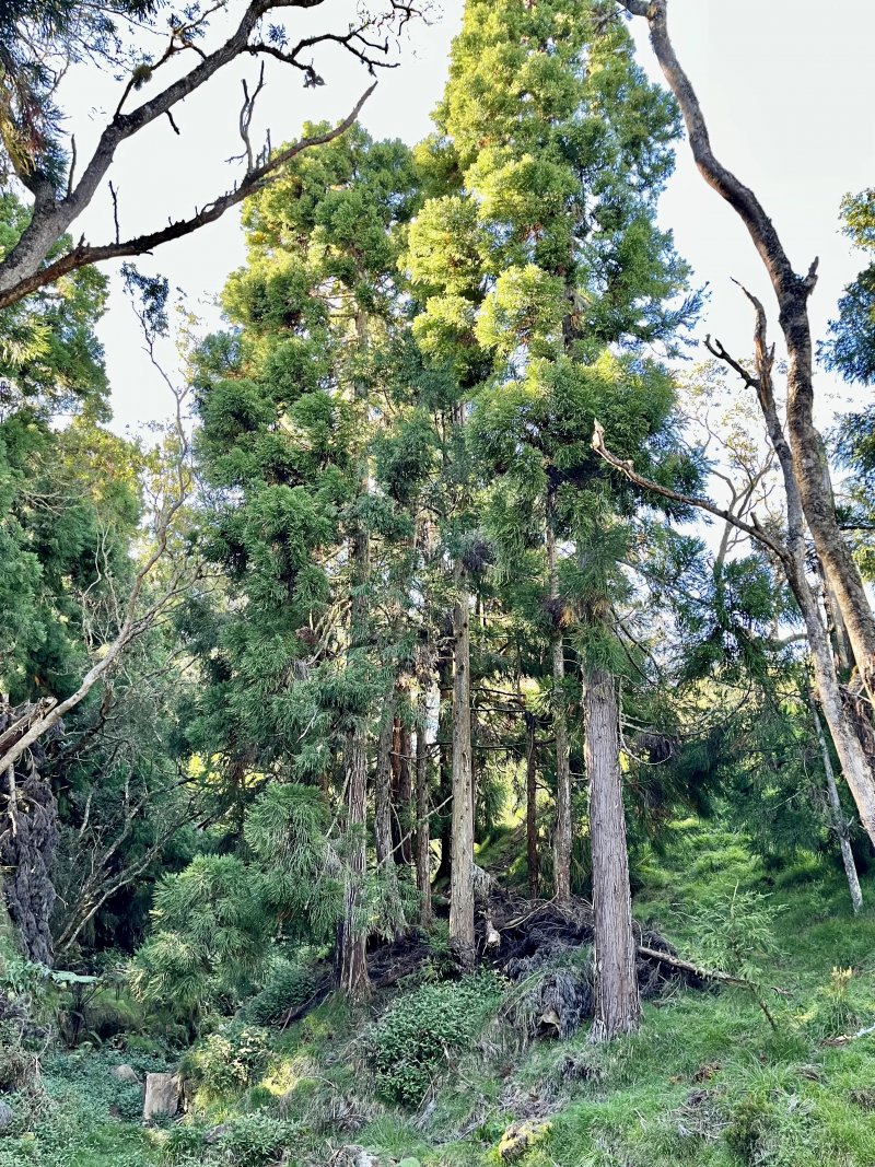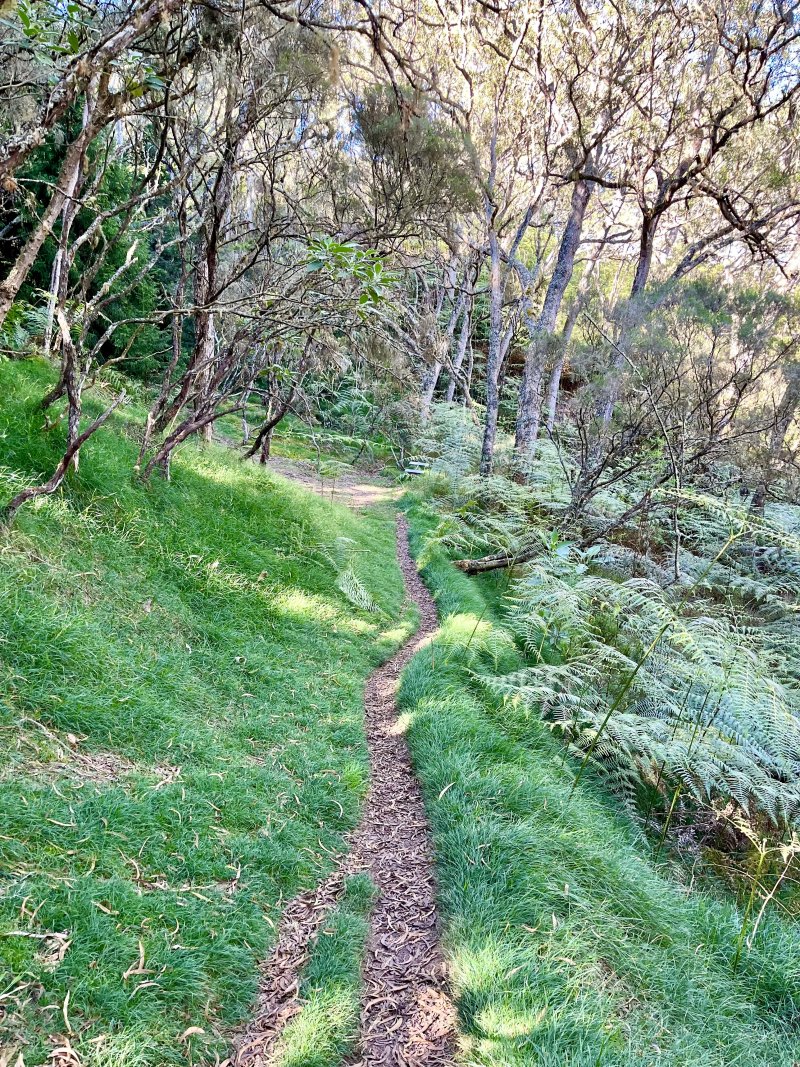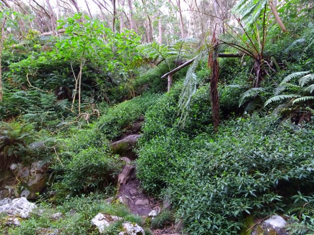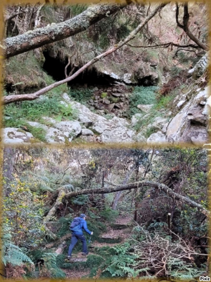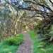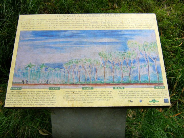 Le sentier, le plus souvent herbeux, est tout au long de la boucle d'excellente qualité pour y cheminer sans effort. Il débute sous quelques cryptomerias où les premiers tamarins ont du mal à pousser en raison du manque de lumière (Photo 2). Il se poursuit dans les jouvences en longeant au plus près la route forestière (Photo 3). Les tamarins sont de plus en plus nombreux. La marche s'effectue sur un sentier bien marqué et couvert de feuilles et d'herbe (Photo 6). Il se poursuit dans une zone envahie de branles et de fougères (Photo 7). On se retrouve régulièrement devant les supports des anciennes pancartes pédagogiques qui attendent patiemment que des nouvelles y soient fixées (Photo 8). A l'époque où elles étaient encore en place, on pouvait y voir des images et y lire de passionnants textes expliquant diverses étapes de plantation, d'extraction ou d'utilisation du bois (Photo 9). On franchit à plusieurs reprises des ravines plus ou moins profondes et les efforts se comptent en secondes et non en minutes pour arriver sur l'autre rive (Photo 10). Ces courtes portions sont consolidées par des marches en rondins ou planches de tamarins et peuvent comporter des rambardes lorsque la pente est très forte (Photo 11). Quelques clôtures se franchissent par des escaliers qui ont beaucoup souffert des intempéries. Des marches sont même manquantes ou bringuebalantes (Photo 12). On rencontre régulièrement des tamarins ayant subi les assauts des cyclones et continuant leur existence penchés vers le sol (Photo 13) ou le touchant carrément (Photo 14). Deux grottes se rencontrent lors du franchissement d'une ravine à peine marquée (Photo 16). Mais le but de ce sentier de découverte est de venir à la rencontre du magnifique arbre endémique qui pousse sur des km² dans la région du Maïdo. Il y en a de vénérables isolés (Photo 17), d'autres vivant en colonies plus touffues (Photo 18) ou de jeunes plantations réalisées par le service de l'office des Forêts (Photo 19). C'est la Ravine la Source qui représente la portion la plus "sportive" de la boucle. La descente s'effectue sur les marches plus nombreuses qu'ailleurs et sur une pente assez forte (Photo 21). Le seul danger peut provenir des rochers ou plaques de basalte humides lors de la traversée de la ravine (Photo 22). Le sentier s'approche de la route et s'en éloigne à nouveau pour poursuivre la boucle vers le sud à travers les fougères (Photo 24). Puis il remonte rapidement vers le nord et se rapproche toujours de la route forestière. Pas d'inquiétude à avoir si le sentier est moins bien marqué par endroits car il est difficile de se perdre en raison de la proximité de la route. Le retour au parking est le plus agréable car le sentier est plat, propre, herbeux et chemine entre de magnifiques tamarins (Photo 25). Ne pas manquer un ancêtre couché au sol peu avant de terminer le circuit (Photo 27). Le sentier passe à un moment au plus près de la route et se poursuit en frôlant le pont pour franchir la ravine (Photo 28). Des variantes sont possibles à la rencontre de sentiers plus ou moins marqués. Il est même possible d'effectuer de courts tronçons par la route forestière. C'est toujours sur le même type de parcours qu'on parvient en moins d'une heure au parking, surtout que la marche n'est pas ralentie par la lecture des panneaux.