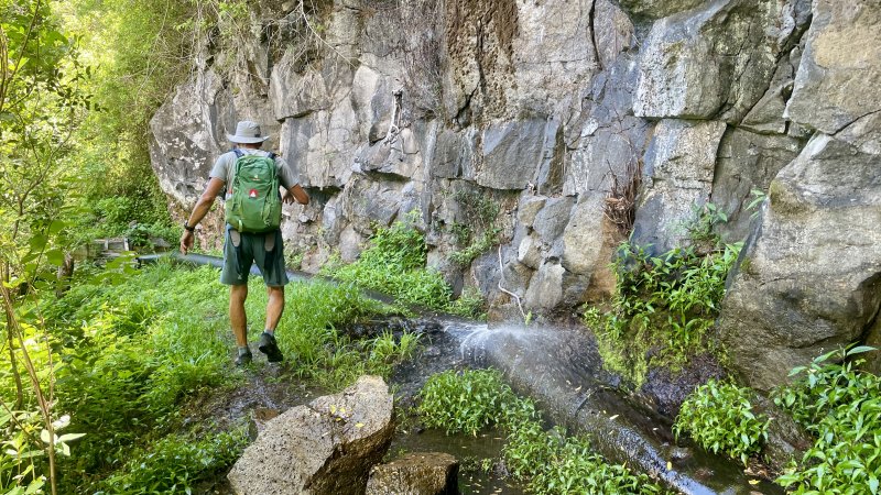 La randonnée débute à Bois Court et emprunte la très connue descente vers Grand Bassin. On peut partir du sentier proche du belvédère ou comme ici au Chemin Thomas Payet. Le premier longe le rempart, l'autre emprunte un sentier qui file droit au rempart. Les deux se rejoignent en début de descente. La pente est immédiate sur escaliers en béton, terre humide, roches et marches en pierre. Quelques rambardes sommaire protègent les parties un peu vertigineuses ou un ancien éboulis (Photo 2). Dans le fond de la vallée, on voit une partie du village de Grand Bassin, le bassin et la cascade du Voile de la Mariée et le Bras des Roches Noires (Photo 3). Après une série de lacets serrés (Photo 4), le sentier oblique sur la droite sur une pente beaucoup plus douce épousant la courbe de niveau. Après un oratoire sur la droite, il descend un peu plus en direction de la station de pompage. On rencontre les premières tuyauteries changées en 2018 par d'importants travaux. Franchir les installations sur des caillebotis métalliques ou des échelles. Les panoramas sur les remparts en face sont sauvages et magnifiques mais on les verra bien mieux dans quelques minutes (Photo 5). La pente s'intensifie sur de nouveaux lacets vers le Petit Coteau. Ne pas manquer, sur la gauche, le sentier qui part en direction de la canalisation des Hirondelles. La jonction jusqu'à la porte qui en interdit l'accès est très rapide. Elle semble impossible à franchir mais comporte sur la gauche des ferrailles soudées afin de constituer une échelle comme pour justement inciter à passer ! Une fois l'obstacle franchi on cheminera durant 6 kilomètres sur un large chemin creusé à même le roc depuis de nombreuses décennies. La pente est pour ainsi dire totalement inexistante et c'est sans effort qu'on chemine sur le flanc de la falaise (Photo 6). Un énorme pied d'ananas du pauvre (Monstera délicieux) recouvre quelques rochers à flanc de falaise (Photo 7). La vallée est étroite et les pitons en rive droite du Bras de la Plaine semblent tout proche (Photo 8). On s'arrête très souvent pour admirer les nombreux panoramas sur la région ; c'est tout d'abord Grand Bassin, ses rivières et cascades, ses vallées encaissées (Photo 10) et tous les pitons alentour. Les virages imposés par la montagne permettent de voir parfois la canalisation au loin et les importants travaux qu'il a fallu réaliser pour alimenter toute une population en eau (Photo 11). Certains travaux ont nécessité de cacher la tuyauterie dans des coffrages bétonnés pour les protéger des chutes fréquentes de roches (Photo 12). D'autres, très impressionnants ont permis son passage sous de hautes cascades (Photo 13). Le sentier bétonné est étroit et très vertigineux (Photo 14). Le moindre faux pas peut être fatal mais, objectivement, la largeur est suffisante pour passer, même pour les jambes flageolantes de certains marcheurs. C'est 300 mètres avant d'y arriver que ce passage fait peur quand on aperçoit la hauteur de la faille, fort heureusement toujours à sec (Photo 15). Une fois cet écueil passé, le parcours est toujours le même sur un sol plat en longeant la canalisation (Photo 16) qui laisse partir parfois des milliers de litres d'eau s'échappant d'une fissure crée par une chute de pierre depuis la falaise. Dans ce cas, le franchissement doit se faire toujours du côté de la canalisation et surtout pas de celui du vide. En face, la très haute faille de la Ravine Mal au Ventre peut abriter de belles cascades en cas de fortes pluies (Photo 19). En fonction des directions imposées par les virages, on a constamment sous les yeux les magnifiques paysages autour de Grand Bassin (Photo 19) ou vers l'aval de la rivière. Peu après la haute cascade à sec, on se retrouve en face de l'Îlet Marron (Photo 20). On distingue très bien le plateau qui abrita cet îlet reculé et surtout le rein dangereux par lequel y on arrive depuis l'Entre Deux (Photo 21). Si l'îlet Marron est depuis longtemps abandonné, il en est autrement des quelques uns qu'on peut deviner au plus près du Bras de la Plaine en les repérant à leur toiture (Photo 22). Plus loin, la vallée entière permet d'en chercher d'autres en amont du barrage qu'on dominera bientôt (Photo 23). L'Îlet Aurélien Dijoux semble très proche quand on le surplombe alors qu'il est situé 400 m plus bas (Photo 24). On rencontre quelques trouées dans la falaise ou d'autres ouvrages bétonnés sans qu'on devine immédiatement leur utilité (Photo 25). Peu après, la canalisation est fixée à la falaise et le sentier disparaît pour être remplacé par une longue passerelle pouvant occasionner certaines appréhensions pour les moins habitués (Photo 26). Cette passerelle souffre régulièrement des chutes de pierre et il faut l'éviter par temps de pluie qui favorise ces chutes (voir ci-dessous le commentaire et photos de Martial le 26/11/2018). La fin du trajet aérien arrive rapidement par le franchissement de la porte grillagée avertissant d'ailleurs des dangers possibles sur le trajet (Photo 27). Plus haut, dans un lacet du Chemin Henry Cabeu, deux grands réservoirs récupèrent l'eau de la canalisation. Si aucun véhicule n'a été prévu près des réservoirs, on peut regagner Bois Court par le Chemin Henry Cabeu qui se termine longtemps plus tard sur la D70, en direction de Bois Court. Cette remontée est un peu longue mais s'effectue entre champs et prairies avec très peu d'habitations.