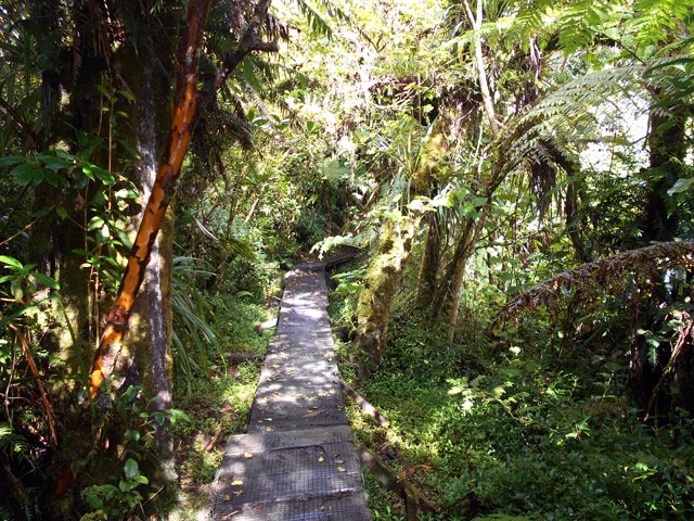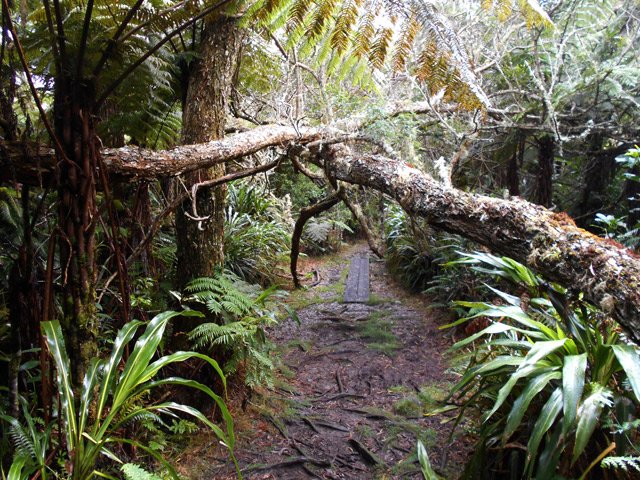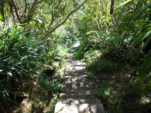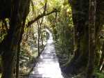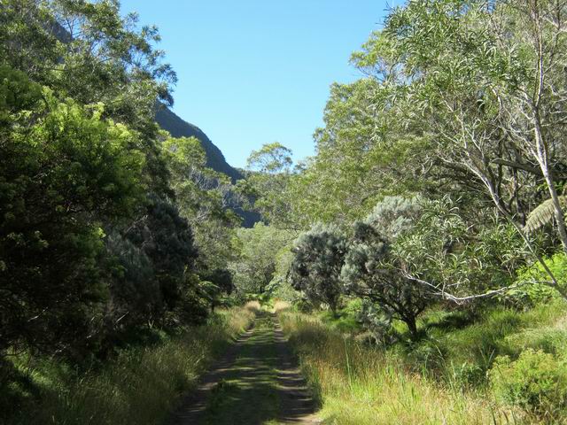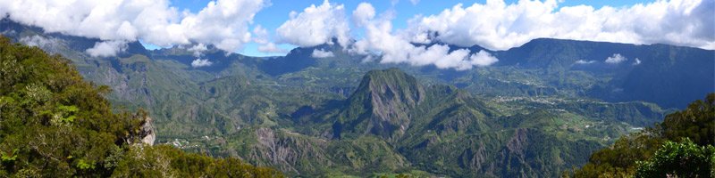 La randonnée débute à la fin de la route de Bélouve, au parking du gîte. On se dirige tout d'abord vers le gîte par la piste ou ses raccourcis pour arriver à un charmant endroit entouré de fleurs (Photo 1). Profiter, avant d'affronter la boue, du splendide panorama sur le Cirque de Salazie à partir d'un grand belvédère aménagé derrière les bâtiments. Il vaut mieux admirer le cirque le matin plutôt que lorsque les nuages auront envahi l'horizon. Ne pas manquer le petit musée du téléphérique, sur la gauche en se rendant au belvédère. Revenir sur ses pas pour prendre le sentier du Trou de Fer repéré près du Gîte, entre deux grands pieds d'azalées, et qui débute par un bel escalier. On suit sous les grands tamarins le sentier qui emprunte parfois des escaliers aux planches de bois de tamarin. Les montées sont faibles et rares et le sentier est de bonne qualité (Photo 2). Il passe entre deux bassins d'eau sombre de la Ravine Fleurs Jaunes dont un qui est traversé par des troncs d'arbres couchés par le vent. Il rejoint très vite la Piste Forestière des Fleurs Jaunes par une portion comportant de grandes marches et traversant plus loin un beau sous-bois de tamarins (Photo 3). Après quelques passages techniques sur roches ou racines, bifurquer à gauche sur la piste qui est large, plate et très agréable après ces premières courtes portions déjà un peu boueuses. La Reine des Tamarins est couchée à une centaine de mètres de là, continuant à vivre tranquillement dans son écrin de verdure (Photo 4). Un petit sentier sur la droite permet d'aller à l'arrière de l’ancêtre et de grimper facilement sur son dos. La visite ne prend que 5 minutes. On retrouve la piste rectiligne entre tamarins, fleurs jaunes et grandes fougères arborescentes (Photo 5). Un peu plus loin, il faut quitter la piste pour prendre à gauche le sentier du Trou de Fer en direction du point de vue. Il débute par un plancher de bois de tamarin vieillissant qui, très vite, fait place à la terre, si elle n'est pas transformée en boue dans les parties creuses. Il faut chaque fois repérer où poser les pieds, le plus souvent sur les racines ou les rondins qui dépassent (Photo 6). En période de pluies fréquentes, les morceaux de bois jetés sur la boue sont salutaires mais glissants (Photo 7). Les milliers de contournements ont parfois créé un sentier large qui a dénudé les racines des bois de couleurs (Photo 10). Heureusement, quand on ne regarde pas ses pieds, on peut admirer la forêt primaire de chaque côté (Photo 11). Malgré quelques ralentissements dus à des arches végétales de tamarins tombés au sol, des racines saillantes, des plaques boueuses ou des planchers grossiers de troncs, on parvient sans encombre au croisement du sentier de l'Ecole Normale. Prendre à gauche et entamer la descente qui mènera au belvédère. C'en est fini de la boue. Le sol est recouvert de très longs planchers grillagés entre les arbres moussus (Photo 13). Certaines portions sont si pentues qu'il a fallu y construire des escaliers. On parvient assez rapidement au belvédère. Il est large, constitué d'un grand plancher sur plusieurs niveaux et peut supporter des dizaines de marcheurs. Il est d'ailleurs très fréquenté depuis son aménagement. De la rambarde, profiter de ce panorama unique sur une des grandes cascades du Trou de Fer. Le Bras de Caverne qui passe près du gîte, se précipite par une première cascade sur la gauche du cirque profond mais on ne distingue bien que le bassin (Photo 15). Le Trou de Fer porte bien son nom. La plus haute chute, qu'on distingue très bien, tombe de plus de 100 mètres dans un puits sans fond (Photo 16). Les hélicoptères y font parfois la queue pour transporter les touristes au plus près de la cascade. Faire demi-tour sur le même itinéraire jusqu'au croisement avec le sentier de l'Ecole Normale où un banc humide permet de se reposer de la courte mais forte pente (Photo 17). Ne pas reprendre le sentier utilisé à l'aller mais poursuivre sur le sentier de l'Ecole Normale. On retrouve le même paysage végétal touffu sur un sol essentiellement constitué de planchers de bois (Photo 19). Ils vieillissent doucement et auront très vite besoin d'une réfection. Quand les planches semblent plus vermoulues que les autres, marcher sur l'emplacement de la poutre de soutien, plus solide. On parvient après un petit détour à une vaste clairière entourée de tamarins et comportant une immenses mare bordée de joncs (Photo 21). Faire le tour ou non de la Mare en fonction de la hauteur d'eau. Ce court trajet parfois aléatoire permet de s'approcher de ces magnifiques tamarins de Hauts (Photo 22). Poursuivre en direction de la piste Forestière des Mares en retrouvant des portions boueuses ou recouvertes de planches (Photo 23). Prendre à gauche en parvenant à la pite puis à droite en direction du gîte au milieu des tamarins (Photo 28). On retrouve facilement le sentier qui ramène au point de départ.