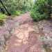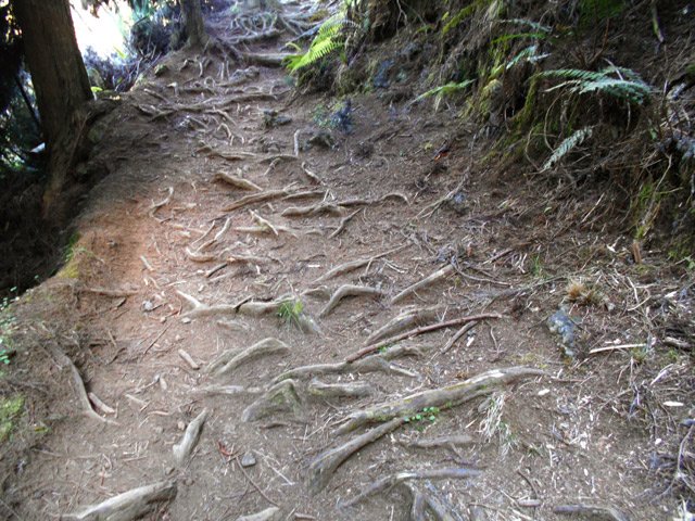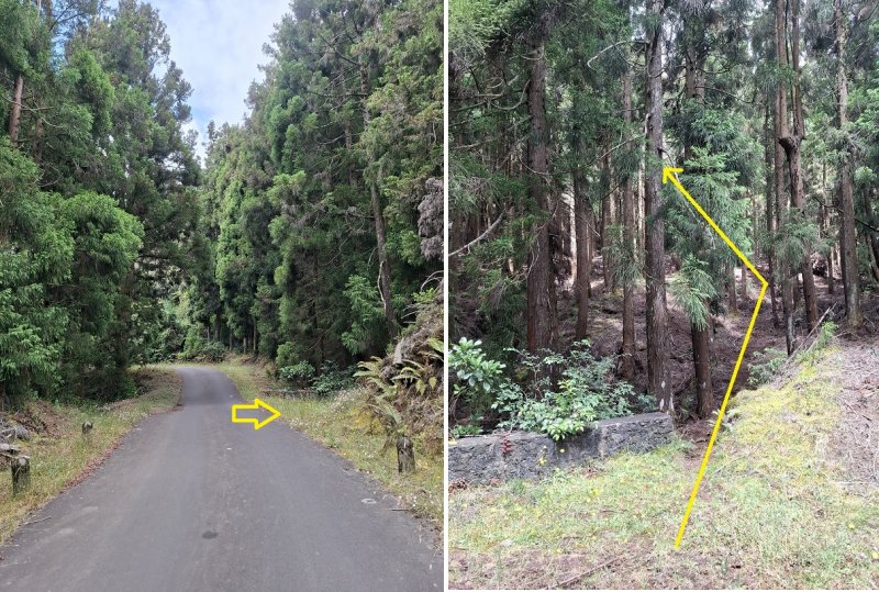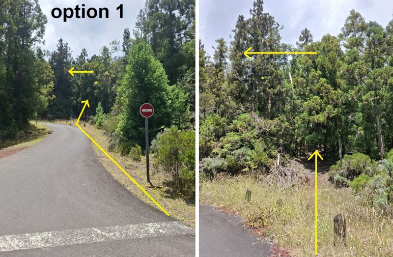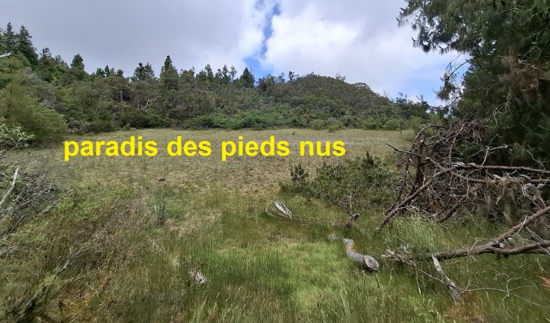 La randonnée débute près de ce petit kiosque érigé sur le premier grand parking rencontré après Bourg Murat (Photo 28). Les cryptomerias sont déjà très présents. Ils protègent du froid en hiver et de la chaleur en été malgré la pauvreté de leurs ramures maladives. Le jour où l'ONF décidera de couper ces arbres, le Piton Guichard prendra alors un bien triste aspect. Repérer, en aval, un sentier qui monte assez fortement vers une table d'orientation sous de beaux pins d'Oregon (Photo 1). Avant de partir, marcher 50 mètres sur la route pour profiter des deux beaux tamarins entourés d'arums dans la prairie (Photo 2) ou de la verdure de la prairie elle-même qui se recouvre doucement d'ajoncs d'Europe (Photo 3). On peut ensuite monter à la table d'orientation par une petite piste cavalière peu utilisée ou prendre le sentier repéré au parking. Ce sentier longe la prairie en dominant la route du Volcan et les prairies entourant la Grande Ferme (Photo 4). Sur la droite, c'est plutôt le Piton Dugain qui dépasse des pâturages (Photo 5). Les premiers cryptomerias apparaissent le long du barbelé et le sentier, étroit et plat, se poursuit de manière rectiligne (Photo 6). Ils sont de plus en plus nombreux et l'herbe disparaît (Photo 7). On retrouve quelques pieds de pins d'Oregon, moins nombreux que les cryptomerias (Photo 8). Sur la gauche, les prés se couvrent de branles verts qui ne tarderont pas à les transformer en friches (Photo 9). Quelques taches sont créées par le blanc des touffes d'arums ou le jaune des grands ajoncs d'Europe près de tamarins esseulés (Photo 10). Le sentier ombragé se poursuit, toujours aussi droit sur les racines des conifères (Photo 11). Ne pas prendre le sentier rencontré sur la gauche ; Il se dirige vers le Piton Dugain sur un très bel itinéraire rejoignant Bourg Murat (Photo 13). Poursuivre sur le même type de sentier vers le Piton Rouge qu'on aperçoit tout près (Photo 14). La balade se poursuit le long des prairies qui vont bientôt disparaître à l'approche des nombreux affluent s de Bras de Pontho (Photo 15). Bifurquer à droite pour remonter sur les racines vers les nombreuses zones de pique-nique bordant la route sinueuses qui traverse la forêt de cryptomerias (Photo 16). Le sentier qui partait sur la gauche et suivait le fond basaltique du Bras de Pontho existe toujours mais il est devenu difficile à suivre en raison de quelques arbres tombés en travers. Il avait, à l'époque, été intégré à la précédente fiche pour rallonger un peu la boucle. A partir de ce croisement, les amateurs de racines de cryptomerias seront comblés car il y en aura partout (Photo 17 et 18). La montée ombragée est régulière et sans difficulté (Photo 19). Le sentier, usé par les semelles et les pneus est large sous les conifères jaunissants (Photo 21). Par endroits, il est creusé profondément dans le sol (Photo 22). Il coupe un peu plus haut la belle route qui effectue des petites boucles sur le piton (Photo 23). On peut même envisager, à la fin ce cette boucle, de repartir par la route pour s'en créer une autre aussi originale. Les kiosques sur la gauche (Photo 25) et les voitures sur les parkings indiquent que la route du Piton Sec est proche. Marcher jusqu'à la route et tourner immédiatement à droite pour emprunter le sentier qui descend, toujours sur des racines, vers la fin de la boucle (Photo 26). Le sentier descend plus fortement qu'ailleurs. Attention, les passages de VTT ont créé plusieurs petites pistes mais il n'y a pas de difficulté pour suivre la plus visible qui arrive près d'un petit pont (Photo 27). Le sentier se termine près du croisement des deux routes. De cette bifurcation, on voit à droite le parking et le véhicule qu'on rejoint en quelques secondes (Photo 28).