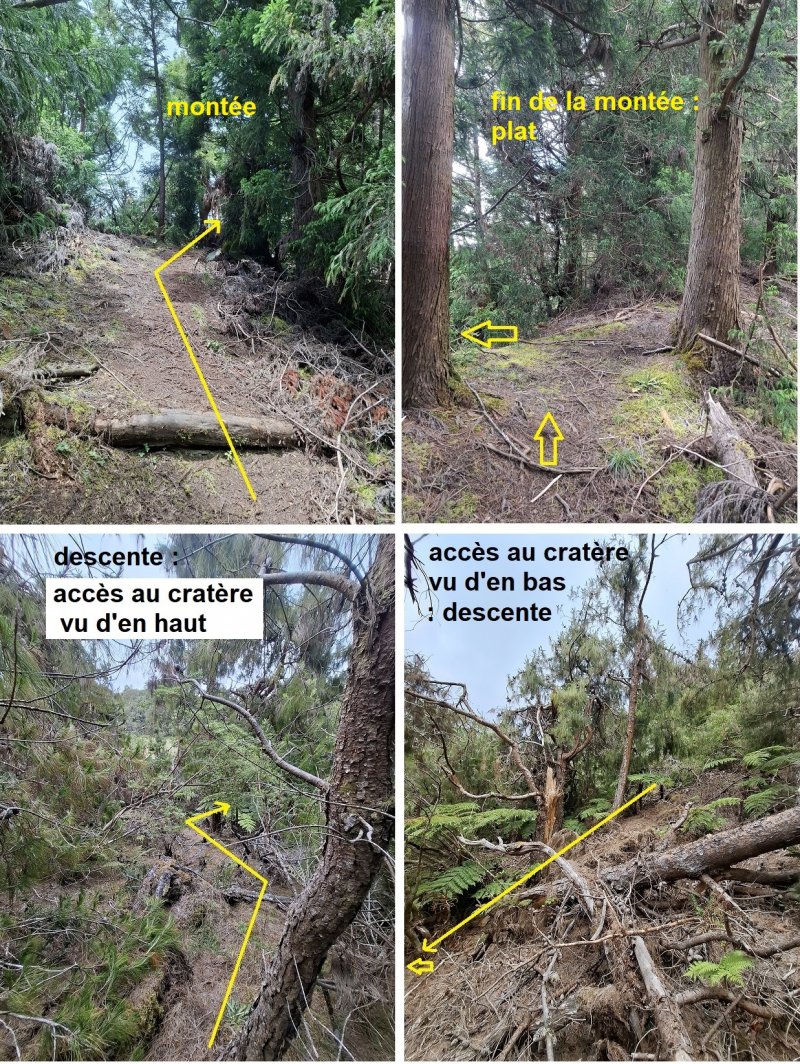 Cette courte randonnée familiale, sans danger, s'effectue en partie sous les cryptomerias. Contrairement à d'autres forêts de ce type à la Réunion, dont celle de la Grande Ferme toute proche, les arbres sont ici jaunes ou orange et semblent souffrir de maladies ou de la pauvreté du sol. Ils n'en demeurent pas moins agréables à regarder, donnant l'impression d'être en automne métropolitain. Le sentier, toujours agréable et de bonne qualité, suit au début des prairies parsemées de beaux spécimens de tamarins des Hauts et pénètre ensuite sous le couvert ombragé de la petite forêt de cryptomerias. Le sentier qui redescend en face sud n'est pas marqué sur la carte mais il est impossible à manquer. Il est régulièrement utilisé par les vététistes qui ont créé plus bas plusieurs sentes sur les racines. N'importe laquelle d'entre elles ramène sans hésitation à la route qui sillonne la zone.