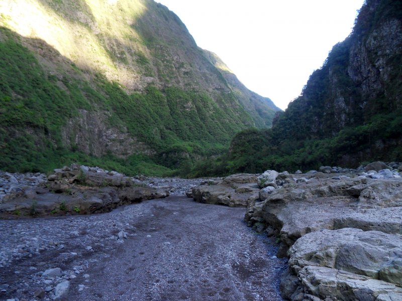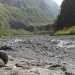 Le sentier débute à St-Joseph en se rendant vers les concasseurs du fond de la Rivière des Remparts. L'itinéraire le plus fréquenté rejoint ces concasseurs par la route utilisée par les dizaines de camions qui la sillonnent chaque jour mais la meilleure solution consiste à rejoindre la rivière à sec en marchant sur la piste de l'Ilet Delbon. Suivre les indications du § itinéraire pour se rendre au départ du premier sentier en suivant quelques rues de la ville. Le sentier descend et rejoint une piste qui traverse un immense verger de letchis et manguiers. Ces deux kilomètres dans la verdure et en bordure de rempart sont beaucoup plus agréables que l'itinéraire qui emprunte le lit de la rivière. On longe un immense verger de letchis dont certains ont un âge respectable (Photo 1). La piste est large et en pente très douce jusqu'au lit de la rivière (Photo 3). On peut traverser la rivière des Remparts constituée de larges plaques de lave sculptées par les eaux, souvent à sec, en amont de beaux bassins à repérer pour les saisons pluvieuses. Il est également possible de remonter dans un ancien bras plus verdoyant et moins bruyant (Photo 5). La piste n'est qu'à quelques dizaines de mètres et on la rejoint très vite (Photo 6). Prendre à droite et rejoindre en marchant au plus facile la large piste poussiéreuse qu'on ne quittera qu'à Roche Plate. La vallée est large et peu encaissée (Photo 7). Les cinq premiers kilomètres dans la vallée ne présentent aucun intérêt tant les camions de transport de pierre et le bruit des excavateurs sont désagréables. C'est le royaume des galets même si les excavations sont constantes (Photo 8). Il est d'ailleurs préférable de choisir un dimanche pour cette sortie car il y a moins de bruit mais surtout moins de poussière. Les paysages eux-mêmes ne sont pas extraordinaires excepté certains pitons qui longent le lit comme la Cap Edouard (Photo 10). La montée est faible mais longue et constante jusqu'au Bras de Mahavel. Quand on marche à la verticale de Grand Coude, on reconnait des passages déjà fréquentés qui montent vers Jean Petit, vers la Petite Plaine ou vers Grand Coude aux alentours de l'Îlet Dimitile. La vallée est toujours très large et la piste épouse à peu près ses méandres. C'est près de 15 kilomètres après le départ qu'on rencontre la vallée de Mahavel et ses cailloux acérés, pas encore usés depuis le grand effondrement. A partir de ce point, on peut rejoindre Roche Plate par plusieurs sentiers ou chemins. La solution la plus rapide consiste à escalader le Barrage de Mahavel, seul vestige encore visible de la catastrophe de 1965 (Photo 11). Les curieux remonteront la rivière sur une centaine de mètres pour apprécier l'épaisseur de terre et de roche qui avaient créé à l'époque un barrage qui inquiéta la population. L'érosion effectue lentement son œuvre (Photo 12). Un sentier permet de remonter de quelques mètres et rejoindre le bois de filaos qui sépare des premières habitations de Roche Plate. Il présente l'avantage de procurer un peu de fraîcheur après ces kilomètres sous le soleil et sur les gros galets du fond de la Rivière des Remparts. Hélas, les 4x4 creusent le sol et la pluie remplit les ornières créant de longues portions boueuses qu'il faut contourner en marchant entre les arbres. Prendre son temps pour traverser ce village isolé et pourquoi ne pas prendre un verre à l'un des gîtes (Photo 13)? Passé Roche Plate, le sentier devient de plus en plus raide et le sol de plus en plus dur. On suit tout d'abord le sentier bordé de belles murailles de pierre sèche avant de trouver la bifurcation vers le Plateau des Sources (Photo 14). Prendre à gauche le sentier officiel, mais si on n'a jamais visité cette région, ne pas hésiter à prendre à droite, surtout si le sentier est nettoyé ; le détour ne fera perdre que 15 minutes. On passe tout d'abord des ruines (Photo 15) avant de se rapprocher de la ravine déchiquetée du Bras Caron pour terminer au toboggan et au bassin de Fond de Sonje pour une belle occasion de se rafraîchir les pieds. Pas le temps de pêcher la truite même si on en aperçoit partout car il reste encore une longue montée. Reprendre alors en rive droite du Bras Caron et rejoindre en moins de 200 mètres le sentier officiel de la Rivière des Remparts. La montée sera un peu raide jusqu'à la Cascade Davedinde, à sec, et son arche naturelle difficile d'accès (Photo 16). A partir de ce canyon étroit, le terrain s'assagit mais monte tout de même. La pente s'accentue graduellement jusqu'à l'Îlet Citron Galet puis grimpe de plus en plus dans les goyaviers et sur des plaques de basalte glissant. Quelques rares portions plates ne suffisent pas à reposer les jambes (Photo 17). Cette région renferme de très originales curiosités qui doivent faire l'objet d'une randonnée spécifique. Les falaises deviennent de plus en plus verticales en s'approchant du Nez de Bœuf. Des cascades coulent de ces remparts mais s'atteignent difficilement (Photo20). On s'approche ainsi du rempart dans une belle forêt de bois de couleurs humide, point de départ de la magnifique randonnée souterraine. Le sentier qui remonte rejoindre la Route Forestière du Volcan est proche et représente la vraie difficulté du trajet. On grimpe sur un sentier étroit (Photo 21), comportant parfois de grandes marches (Photo 24), caillouteux ou boueux dans les brandes, et où de nombreux lacets évitent les trop fortes pentes. Profiter des points de vue pour admirer la vallée et voir le trajet déjà effectué (Photo 25). Après un dernier coup de collier, on arrive enfin à la route forestière du Volcan où peut fort bien attendre un véhicule s'il a été programmé. Le Nez de Bœuf n'est qu'à quelques centaines de mètres en suivant le rempart d'où l'on aperçoit très bien Roche Plate et le sentier parcouru (Photo 28). C'est un peu plus loin, le long de cett
