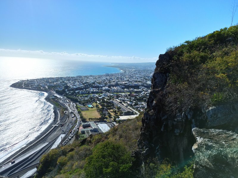 La randonnée débute au croisement du Chemin de la Vigie et du Chemin Cap Bernard. Un poteau de l'ONF attire l'attention. Le sentier débute sa descente et rencontre un peu plus bas une autre entrée qui pourra être utilisée en fin de parcours. Le cheminement s'effectue principalement dans les herbes et de petits rochers qui encombrent le sentier (Photo 1). La végétation est assez pauvre excepté quelques beaux filaos. La progression est facile et le regard porte tantôt sur le sol pour éviter les cailloux, tantôt sur le chef-lieu pour de superbes panoramas. On utilise des portions herbeuses à plat (Photo 2) ou très rocheuses où il faut ralentir le pas, surtout en descente (Photo 3). Laisser sur la droite et pour la fin de la balade le sentier étroit pris par les alpinistes ou adeptes de la varappe. On marche toujours dans les grandes herbes où poussent ça et là quelques chocas, filaos ou faux poivriers qui ont du mal à atteindre des tailles respectables en raison de l'aridité du sol. Ces grosses roches créent parfois de hautes marches qui empêchent ce trajet d'être effectué par tous (Photo 4). A tout moment, de magnifiques panoramas sur la ville de Saint-Denis imposent de s'arrêter (Photo 5). Un bois de filaos procure juste assez d'ombre pour rafraîchir un peu mais il faut de toute manière amener de la boisson car la sortie est chaude même si elle est courte (Photo 6). La descente se termine sur une aire de pique-nique comportant plusieurs emplacements dont deux couverts (Photo 7). Une grande table d'orientation, posée au sol, donne tous les détails sur la ville de Saint-Denis au pied du rempart (Photo 8). Pour une fois, la table n'est pas rectangulaire mais a la forme de la côte qu'elle représente. C'est donc tout à loisir qu'on peut chercher le nom des bâtiments et curiosités de la ville en observant le paysage au pied de la falaise (Photo 9). Le regard porte également côté montagne en direction du Pic Adam (Photo 10). La sortie familiale cesse ici et le retour au point de départ s'effectue par le même sentier.