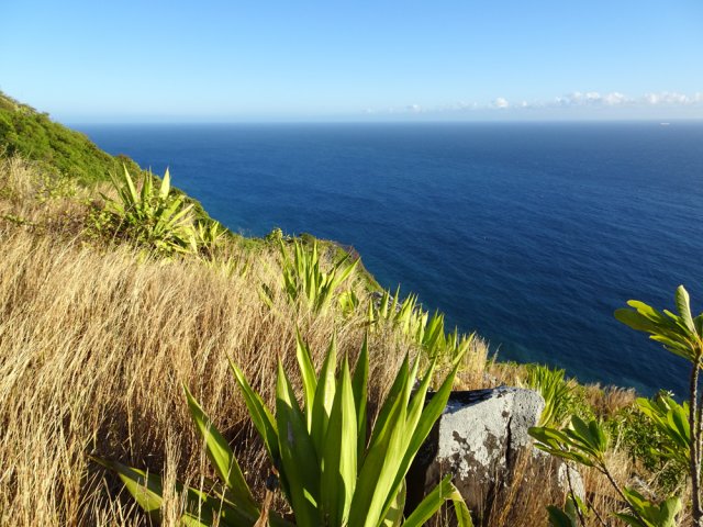 Pour corser un peu et rallonger le circuit, on peut pousser plus avant par des sentiers qu'on aperçoit un peu partout. Par exemple, en partant vers un flamboyant près d'une table de pique-nique (Photo 12) il est possible de rejoindre le bord du rempart par un sentier étroit mais sans danger. On se retrouve sur le promontoire rocheux qui domine la Nouvelle Route du Littoral pour de beaux points de vue sur le Quartier Lambert (Photo 13). Pour les plus aventureux, il est possible de partir vers la falaise et la longer pour rejoindre d'autres rochers qu'on repère de l'autre côté sur la gauche (Photo 14). Le plateau a été maintes fois parcouru par les cordistes en charge de maintenir les filets qui dominent la Route du Littoral et les sentiers utilisés sont bien visibles dans les herbes. Pour y parvenir, se rapprocher du kiosque proche d'une table et partir vers le fourré (Photo 15). Un sentier se divisant en deux débute ici. Prendre celui de droite et le suivre facilement dans les poivriers, chocas et herbes (Photo 16). Après une forte descente, on se rapproche des filets qui recouvrent le sol (Photo 17). Poursuivre vers l'ouest sur un terrain recouvert d'herbe et de chocas avec beaux points de vue sur l'océan (Photo 18). La trace est facile à deviner dans les herbes car elle semble régulièrement utilisée (Photo 19). On se rapproche de pierriers recouverts de poivriers (Photo 20) et la trace est plus difficile à trouver. On peut également en emprunter un autre qui rejoint la trace encore présente sur les cartes IGN, mais l'état le rend plus aléatoire. Retourner à la table d'orientation et prendre le chemin inverse pour revenir au point de départ. Après une remontée un peu plus pénible en raison des nombreuses pierres, on parvient au sentier partant sur la gauche vers les zones d'entrainement des grimpeurs (Photo 21). Le sentier, essentiellement constitué d'un amoncellement de roches est parfois périlleux le long des premières barres rocheuses (Photo 22). On parvient cependant assez vite aux spots équipés. Ils sont baptisés comme souvent de noms originaux inscrits sur la roche. On peut ainsi longer ces rochers sur un sentier abrupt et étroit et bénéficier à nouveau de points de vue sur le chef-lieu (Photo 23). De nombreux itinéraires déjà équipés de pitons demeurent dangereux et ne doivent être empruntés qu'avec du matériel d'alpinisme (Photo 25 et 26). Avec un peu de chance on pourra assister avant de repartir à une démonstration qui ne peut que donner envie de revenir équipé à condition d'être inscrit dans un club afin d'y acquérir la technique minimum pour cette activité beaucoup plus dangereuse que la randonnée (Photo 27). Avant de terminer la randonnée, ne pas manquer la courte jonction au superbe point de vue aménagé en aval sur le Chemin de la Vigie, sur la gauche de la route. Une rambarde, des lampadaires pour la nuit ou des bancs en font un lieu idéal de repos au retour, même si cette sortie est facile (Photo 28).