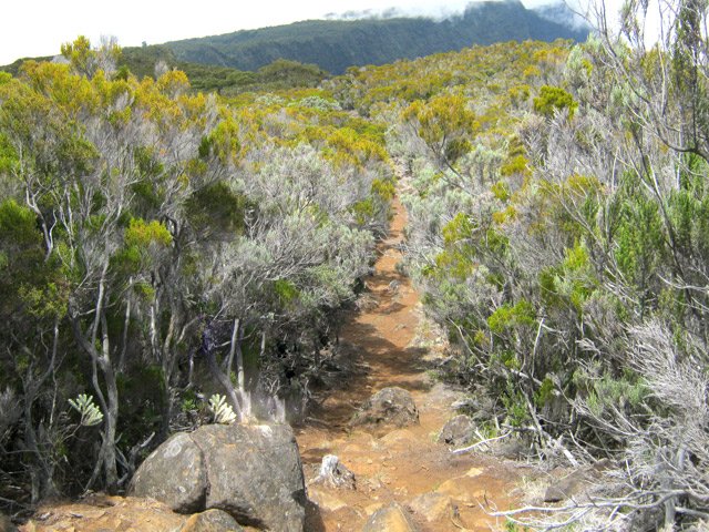 La randonnée débute par une montée sérieuse, parfois glissante par temps de pluie, vers le Dimitile par l’agréable sentier de la Chapelle qu'on trouve à gauche après la ravine de l'Argamasse, à sec, située après le parking. Pas de panorama dans cette végétation assez dense pour distraire du sentier déjà très boueux et couvert de feuilles en décomposition. Quelques marches (Photo 1) ou lacets à l'ombre des grands arbres permettent de s'élever rapidement pour atteindre un rein où la vue se dégage vers le Tampon. La végétation devient plus courte et les fougères envahissent les abords du sentier qui circule parfois à flanc de coteau sans pour cela devenir trop dangereux. La piste 4x4 est parfois très proche. Prendre à gauche à la rencontre d'une belle pierre gravée proche de la piste menant au sentier Mal au Ventre. Le sentier est parallèle à la piste sur quelques mètres en direction de la Chapelle. Nouveaux lacets, nouvelles portions glissantes sous les acacias qui ont pris le relais, distillant d'agréables odeurs à la saison de la floraison (Photo 2). Plus haut, la terre rouge qui recouvre le sentier peut parfois être glissante. On a devant les yeux le Dimitile et le Tampon en se retournant. On arrive au sommet en général trop tôt pour effectuer une visite au Musée du Marronnage mais on peut voir la modeste chapelle (Photo 3) et le petit cimetière des victimes d'un cyclone, entouré de fleurs, principalement des agapanthes. Le rempart de Cilaos est tout proche en suivant la piste, sans forcément monter au point de vue officiel qui propose un large belvédère. On le longe alors pour se régaler du lever de soleil sur les ilets du Cirque. De là, on distingue tout, de l'Îlet à Cordes à Palmiste Rouge (Photo 5). La pente est faible et le cheminement agréable, voire reposant après la courte montée vers la Chapelle. Les branles verts ont pris possession de l'ensemble du massif et on ne les quittera que beaucoup plus loin (Photo 6). La montée est longue mais jamais compliquée ni difficile. Les racines et les pierres sont rares et les points de vue nombreux même s'il faut parfois se rapprocher du bord. Plus on monte et plus le paysage rétrécit car on arrive à un goulet d'étranglement entre le Cirque de Cilaos sur la gauche et la profonde vallée de la Ravine des Roches Noires sur la droite (Photo 7). De là, on a une très belle vue sur le reste de la montée pour atteindre le Sommet de l'Entre Deux. Le sentier y est bien marqué mais on ne voit pas encore les nombreuses échelles qu'il faudra grimper (Photo 8). Le sentier effectue même une courte descente en direction du col étroit qui sépare les deux vallées (Photo 9). On parvient à une grande échelle presque verticale qui marque le début de certaines difficultés où les gens souffrant de vertige redoubleront de prudence et se forceront à l’arrêt pour profiter des splendides panoramas sur le cirque, le Piton des Neiges ou la Fournaise au-dessus de la Plaine des Cafres. Du haut de cette échelle, on a l'impression d'un plongeoir vers le Bonnet de Prêtre, 900 m en dessous (Photo 10). Elle est longue et aussi impressionnante vue du haut que du pied (Photo 11). A partir de cette grande échelle, le sentier poursuit sa descente à même le rein entouré de précipices impressionnants (Photo 12). On retrouve quatre échelles successives pour franchir assez facilement une haute barres rocheuse (Photo 13). Ce n'est que le début d'une succession d'échelles plus ou moins hautes qui permettront d'atteindre le Sommet de l'Entre Deux. Avant l'installation de certaines, il fallait escalader comme on pouvait certains rochers parfois glissants (Photo 14). La montée n'est jamais très forte mais comporte plus de roches qui chauffent au soleil. Le sentier traverse une zone dénudée et recouverte de joncs et d'herbe avant d'entamer la dernière montée vers le sommet qu'on distingue à peine (Photo 16). Du sommet de ce discret piton que le sentier effleure, on peut admirer à nouveau le cirque dans son ensemble (Photo 17). On voit également le Coteau Kerveguen et ses plaques marécageuses recouvertes d’herbes et de petites plantes ressemblant à du thym qui créent des trouées claires dans la végétation de la région essentiellement constituée de branles verts (Photo 18). Le sentier qui rejoint cette partie marécageuse débute sur un sol très caillouteux qui dénote de ce qui vient d'être parcouru mais qui est un excellent entraînement à ce qui suivra (Photo 19). Plus bas, il se perd dans la végétation, devient étroit mais ne quitte pas ses cailloux (Photo 20). Après cette descente assez rapide, on se retrouve sur le plateau à traverser des espèces de prairies comportant peu d'arbres (Photo 21). Au croisement avec le sentier venant de la Plaine des Cafres, le marécage se transforme en une série de quelques mares peu profondes qui se contournent aisément (Photo 22). Le sentier se remet à grimper entre les ruissellements et les cailloux de plus en plus nombreux. On s'approche du sentier descendant au village de Bras Sec qu'on aperçoit en s'approchant du bord (Photo 23). La montée du Coteau vers le Gîte de la Caverne Dufour, comme d'habitude, est très éprouvante pour les chevilles et les semelles (Photo 24). On saute de roche en roche quand on n’évite pas quelques courtes portions boueuses. De petites sentes mènent en quelques pas au bord du rempart pour profiter de merveilleux paysages sur le Cirque de Cilaos. La végétation, à cette altitude, a du mal à pousser sur ces lits de pierre (Photo 25). Si le chrono est encore bon, faire une petite halte au Gîte pour une boisson bien méritée ou une visite de la caverne avant de reprendre la longue descente vers le Plateau du Petit Matarum et le Bloc. La longue descente, maintes fois décrite, débute. Les lacets sont serrés, la pente assez forte et certaines marches sont très hautes. Quelques points de vue sur 