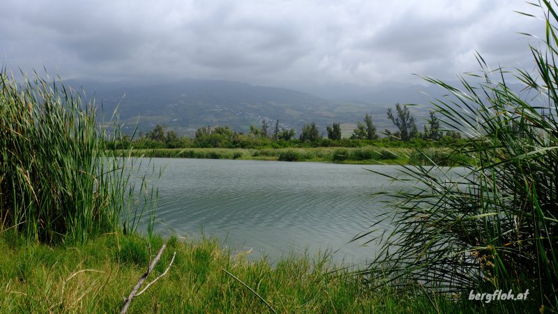 La randonnée débute au grand parking proche de l'étang. S'il est désert le matin, on le retrouve complet au retour de la randonnée car beaucoup de travailleurs viennent ici pour manger leur cari durant la pause méridienne. Avant de partir vers l'Etang Salé, on peut effectuer une courte visite au temple qui a été repeint à la fin de la Rue Valmy (Photo 2). On le distingue très bien malgré la grille qui le clôture. Au retour, profiter des belles vues sur l'étendue d'eau en direction du kiosque sur l'autre rive (Photo 1). Une courte balade peut s'effectuer en empruntant les passerelles en bois et en visitant l'autre rive de la petite ravine. On a, de cet emplacement de nouvelles vues sur l'ensemble de l'étang ou vers l'océan (Photo 7). Rejoindre ensuite le gué situé entre l'étang et la mer. Il est large et recouvert de gros galets qui évitent de se mouiller les pieds (Photo 8). Les pêcheurs sont déjà nombreux tout autour dès le lever du jour. Sitôt le gué franchi, profiter de nouveaux panoramas sur le Dimitile, la Chaine du Bois de Nèfles ou l'usine du Gol qui fume à longueur de journée (Photo 9). On peut emprunter les sentiers au plus près de l'eau ou marcher directement sur la piste sableuse qui se finira à la route nationale (Photo 11). La piste est presque rectiligne, bordée de sentiers ombragés souvent de chaque côté et on y rencontre de gros arbres (Photo 13). A mi-parcours de la première partie, la route devient parallèle à la voie rapide qui est très bruyante (Photo 14). Après avoir rejoint les parkings situés au pont et à la route du golf, poursuivre vers l'Etang Salé. Marcher au plus près de la piste cyclable durant près de 700 mètres avant d'emprunter un sentier de bonne qualité qui se dirige à gauche vers la plage de galets. Le sentier devient de plus en plus sableux et les petites dunes se multiplient. Les plaques indiquant les distances et couleurs de circuits viennent parfois à être ensablées au bord du passage (Photo 15). Le paysage varie peu. Le bord de mer est moins boisé et les dunes se recouvrent de longues lianes de la patate à Durand. (Photo 16). Ce sont ces dunes et agglomérats de galets qui ont petit à petit constitué l'Etang du Gol, enfermant les estuaires de 4 ou 5 ravines encore visibles sur la carte IGN. On se retrouve sur le sentier le plus employé pour venir de l'Etang Salé. Il est très sableux et bordé de galets qui délimitent très bien le parcours (Photo 18). Il faut dire que les galets ne manquent pas dans la région. La plage en est constituée à 100% (Photo 19). On les entend rouler inlassablement quand les fortes vagues viennent les remuer (Photo 21). Ca et là, de grands cairns circulaires égayent le paysage. Là encore, il n'a pas fallu chercher bien longtemps pour les construire (Photo 22). Le sable remplit doucement les chaussures et il ne faut pas penser qu'emprunter la piste équestre toute proche sera une meilleure solution. Le passage fréquent des chevaux remue encore plus le sable. Pourtant cette piste est différente du sentier car la végétation en met une partie à l'ombre, ce qui n'est pas négligeable dans cette région très chaude. Certaines courtes portions, légèrement envahies d'herbe rase, facilitent le cheminement car le pied ne s'enfonce plus. (Photo 23). Certains privilégieront aussi le sentier des pêcheurs qui permet de marcher au plus près des vagues. C'est la meilleure solution en hiver lorsque les baleines nagent au large. A la fin des galets, lorsque le sable est plus fréquent, les bois flottés recouvrent sur d'impressionnantes hauteurs (Photo 28). Le large sentier se termine entre galets et bois flottés et on rejoint la piste au plus près de point de départ. Partir sur la droite ou effectuer une nouvelle balade sur les berges, passer le gué et terminer cette boucle de près de 10 km au parking surchauffé.