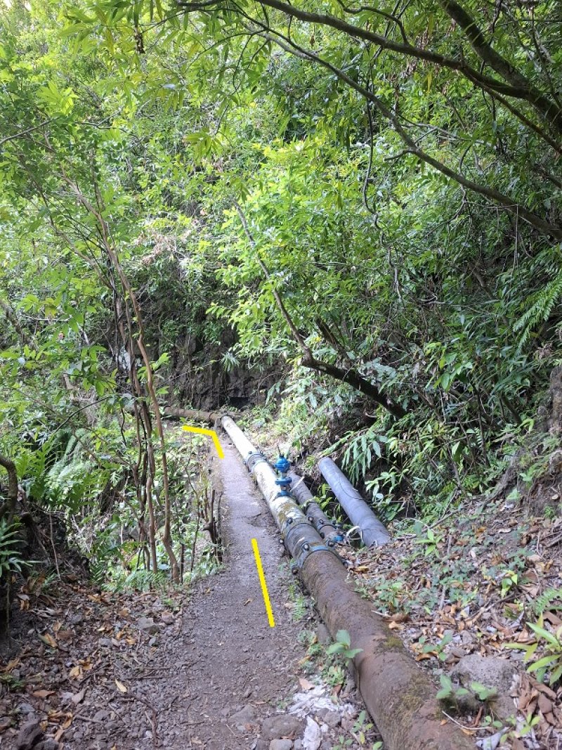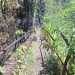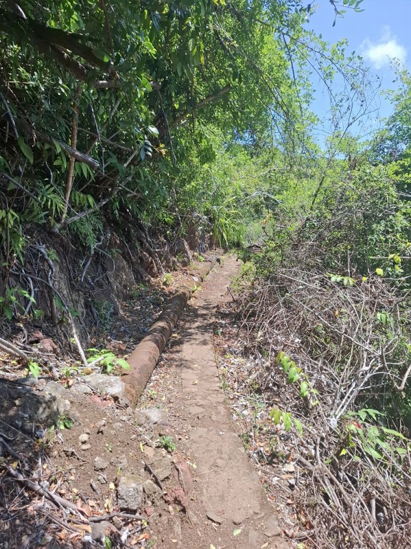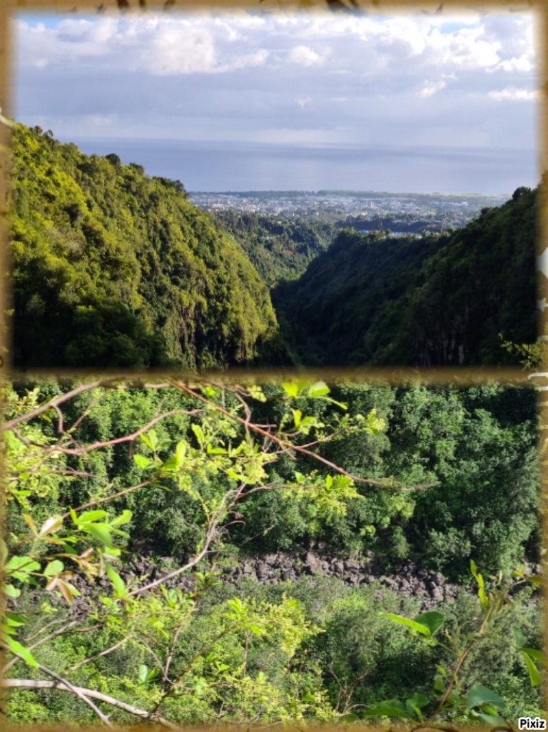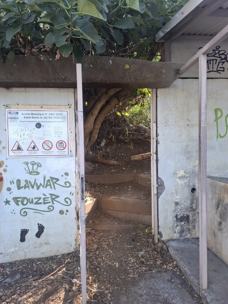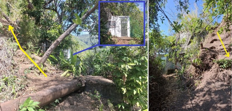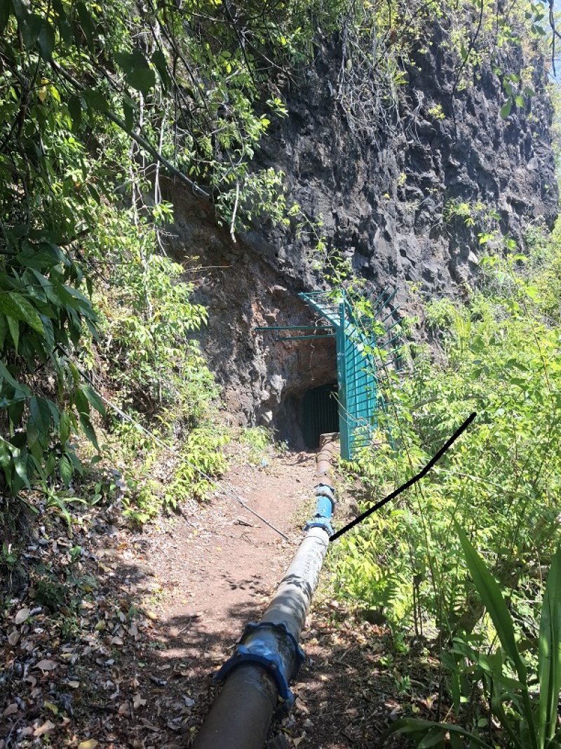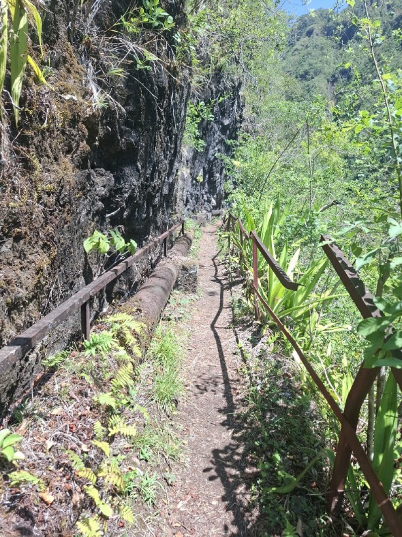 La randonnée débute au petit lavoir qui ne pouvait accueillir qu'une lavandière. Le sentier, un peu envahi de végétation (Photo 1) commence à même la porte et longe la courbe de niveau à travers quelques cases dispersées dans la nature. On profite, avant de partir d'un large panorama sur le chef-lieu et l'océan. La canalisation humide et glissante, percée par endroits et aussitôt réparée, longe le plus souvent le sentier (Photo 2). Pas de difficulté pour le moment. La troisième porte rencontrée depuis la rue est ouverte et invite à poursuivre. Il en va autrement lors de sa fermeture à en juger par les piques et barbelés qui l'entourent (Photo 3). Des trouées dans la végétation offrent des vues sur la vallée vers l'amont (Photo 4) ou vers Saint-Denis (Photo 6). La végétation protège du vide et des tunnels ont du être creusés dans les lianes papillon qui ont pris possession de la falaise (Photo 5). Laisser plus loin le sentier de gauche vers la passerelle qui était fixée à la muraille mais qui est devenue très dangereuse (Photo 1) pour prendre le sentier de droite qui amène à une petite passerelle (Photo 7) puis, plus loin, à un tunnel dans lequel passe la canalisation (Photo 9). La lampe frontale n'est pas obligatoire mais rassure, surtout les grands randonneurs qui pourraient se cogner. Le cheminement se poursuit, toujours aussi facilement, à plat en logeant le tuyau (Photo 11). On distingue très bien le fond de la Ravine du Chaudron dans le bas de la vallée (Photo 12). Certaines portions au-dessus des à-pics de la falaise sont protégées par des rambardes métalliques mais peuvent inquiéter certaines personnes (Photo 16). On s'approche du fond de la vallée et la haute cassure permet de deviner la cascade lorsqu'elle a peu d'eau (Photo 14). Plus loin, près du captage, le sentier est carrément remplacé par la tuyauterie sur laquelle il faut marcher (Photo 18). Attention car l'humidité sur le métal transforme certaines portions en patinoire et oblige à se pencher vers la falaise pour y poser les mains et serrer fortement le câble de sécurité. C'est à cet endroit qu'il ne faut pas amener des enfants. La courte randonnée n'est d'ailleurs pas classée en sortie familiale pour cette raison. Les derniers mètres, toujours aussi près du tuyau, sont assez vertigineux (Photo 19). On entend le bruit d'une chute en aval du barrage et on peut déjà imaginer la longue descente de la cascade du Chaudron. Franchir l'étroit barrage du captage et rejoindre l'autre rive pour atteindre la grande grotte au-dessus du bassin (Photo 22). Les éclats sur le sol et quelques "plocs" dans l'eau claire du bassin expliquent en partie les raison de la fermeture de ce circuit car, si on y rajoute les zones glissantes et celles vertigineuses, la balade peut vite se transformer en tragédie. L'endroit est enchanteur, surtout si un rayon de soleil rend l'eau turquoise et transparente (Photo 28). Les abords se grimpent assez facilement (Photo 27) pour bénéficier de beaux plans sur le bassin et sa cascade (Photo 26). Privilégier une fin de période pluvieuse pour s'y rendre car en temps normal, le filet d'eau est peu impressionnant. Hors saison des pluies, l'eau de la chute provient d'une résurgence au premier tiers de la falaise. L'endroit est tellement magnifique qu'on peut y rester longuement en choisissant cependant un endroit isolé des chutes de pierres, fréquentes. Le retour s'effectue par le même sentier.