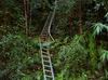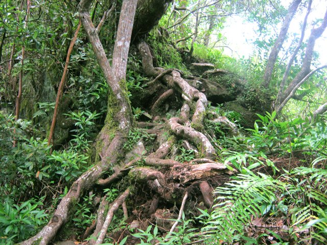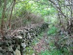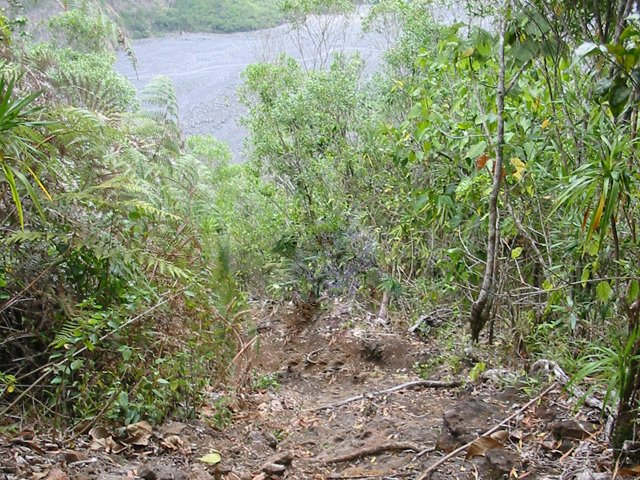 La boucle débute à la Plaine des Grègues mais peut tout aussi bien commencer n'importe où sur le trajet au croisement d'une route et du sentier. Le départ est facile à trouver car la Boucle des Margosiers est un classique de la Plaine des Grègues, connue de tous et bien signalée. Le large sentier monte dans les goyaviers puis s'élargit de plus en plus jusqu'à devenir une piste. Ne pas manquer, en s'approchant du rempart boisé, la plongée dans la vallée de la Rivière des Remparts sur un sentier très discret presque dissimulé dans la végétation constituée surtout de goyaviers (Photo 1). Il faut bien chercher des yeux ce départ et ne pas emprunter la piste cahoteuse de la fin du circuit des Margosiers. La descente est sportive et en forte pente comportant quelques lacets. La passerelle vermoulue a été changée en 2014 mais le bois résiste mal dans cette région assez arrosée (Photo 2). Le sentier est très étroit par endroits mais on ne le perd jamais de vue. Hélas, de plus en plus de vigne marronne envahit les abords. Les arbustes poussant sur le bord aident grandement à se maintenir lors des passages abrupts. Certains passages rocheux peuvent être glissants (Photo 1). D'autres, étroits et mal protégés par la végétation comportent quelques câbles de maintien (Photo 4). On arrive plus rapidement qu'on l'imaginait au fond de la vallée de la Rivière des Remparts. Voir le film de la remontée par la boucle qui l'emprunte dans l'autre sens. Sur la droite en descendant vers l'aval, on entend couler de l'eau et on aperçoit une des Trois Cascades laissant couler un filet d'eau qui disparaît doucement dans le sable (Photo 5). Partir vers la droite et emprunter 500 m de piste pour reposer un peu les jambes. La traversée de la vallée est supportable entre les galets et le sable qui emplit les chaussures (Photo 6). D'autres cairns permettent de mieux situer le départ du Sentier Corymbis qui débute par deux très hautes échelles (Photo 7). Un petit sentier part à gauche vers l'Îlet Rivière ; il faut éviter de le prendre et poursuivre vers la droite. La montée est souvent verticale et difficile, surtout sur les hautes racines et les gros cailloux. De nouvelles échelles sont salutaires pour franchir certaines portions rocheuses verticales (Photo 8). Impossible de monter les mains dans les poches ; elles sont toujours en train de chercher une racine où s'accrocher à une branche. La végétation est assez touffue et les points de vue sur la vallée assez rares (Photo 9). Certaines parties sont en forte pente où les roches se mêlent aux racines, rendant très sportive cette ascension (Photo 10). Une dernière volée de ces hautes marches amène enfin à un replat qui longe la falaise à travers un bois de nombreux jamrosas penchés vers le rempart (Photo 11). Le sentier passe devant une source d'eau fraiche et rejoint le village de Jean Petit après avoir franchi une faille artificielle dans les derniers mètres du Sentier Corymbis (Photo 13). Il faut ensuite suivre durant deux kilomètres la route ou la piste jusqu'au sentier Bérénice. Plusieurs itinéraires sont possibles et c'est la carte en main que la jonction devra se faire ou avec le GPS et la trace téléchargée. Le départ du Bérénice est difficile à trouver en venant de cette direction. On peut traverser les 30 mètres d'un champ de canne près d'un bosquet pour y arriver directement mais il faut alors savoir exactement où se situe le début. Dans le cas contraire, marcher jusqu'à la fin de la piste venant de la ferme et prendre à droite le sentier qui longe le rempart jusqu'au début de la plongée. La descente ne présente pas de difficulté car le sentier est de meilleure qualité que le dernier qu'on vient de monter (Photo 15). Il comporte le même type de difficulté mais de moindre importance (Photo 16). Là également les panoramas sont rares en raison de la végétation mais on peut voir la vallée de la Rivière Langevin dans les trouées au départ (Photo 17). Des murets sur le bord du sentier, entourant d'anciens champs pour la plupart abandonnés, indiquent la fin de la descente (Photo 19). Le sentier se termine par la traversée de la Ravine de Grand Coude, toujours à sec puis par quelques jardins protégés par des tôles ondulées. On est entouré de bananiers et de letchis avec de belles vues sur le rempart qu'on vient juste de descendre (Photo 20). Prendre immédiatement à gauche le Chemin Mallet qui rejoint presque à plat le village de Grand Galet qu'on traverse sans encombre. Dépasser le village et remonter vers Cap Blanc pour récupérer le premier sentier partant sur la gauche dans les bananiers. La pancarte qui indiquait l'emplacement du départ a disparu mais il suffit de guetter les sentiers qui partent vers la gauche juste avant la station de chlorage de l'eau. Les choses sérieuses recommencent car il devient de plus en plus étroit mais grimpe toujours autant que les précédents (Photo 21). Les mains se remettent au travail sur ce parcours qui est le plus difficile de la journée (Photo 22). Toujours pas de point de vue officiel mais seulement des trouées entre les branches pour voir en direction de Saint-Joseph (Photo 23). On trouve toujours la même végétation mais les zones rocheuses et glissantes ne sont pas secourues par des échelles (Photo 24). La fatigue commence à se faire sentir en arrivant à la première maison de Grand Coude. Heureusement, on suivra la route calmement et sans effort jusqu'à l'église du village pour repartir vers le rempart de la Rivière des Remparts. Plusieurs itinéraires sont possibles, par la route ou des pistes, et il suffit de bien regarder la carte et de marcher plein Ouest. Une portion est décrite sur la randonnée qui monte au Morne Langevin, une autre sur une boucle presque identique à celle-ci. Il suffit de choisir la plus facile, la plus rapide ou la plus agréable ; le seul but à atteindre étant le dép