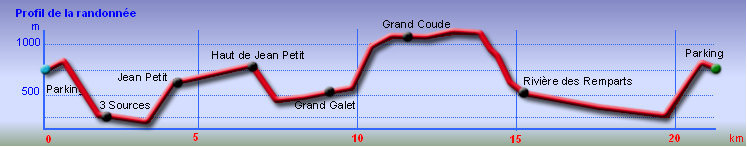 Cette randonnée propose une longue journée très sportive aux alentours de Grand Coude. La longueur du parcours n'est pas extraordinaire mais le dénivelé laisse des souvenirs car les sentiers sont très escarpés, raides et peu marqués par endroits. Deux sentiers abrupts seulement sur les cinq empruntés apparaissent sur la carte. Ils sont souvent fermés officiellement même si on les parcourt sans trouver de réels dangers. Il faut très rarement user du coupe-coupe pour dégager des branches qui se sont mises en travers. Le graphique du profil ci-dessous est une bonne indication de la journée qui attend le courageux qui tentera de l'effectuer en moins de 9 heures. Ce circuit, effectué en courant, deux fois dans la même journée, et dans les deux sens offrira 4000 m de dénivelé et un bon entraînement au Grand Raid. Dans le sens des aiguilles de la montre, certains de ces sentiers sont plus difficiles à repérer. La région de Grand Coude donne la possibilité de voir de belles étendues de culture du géranium et de magnifiques pieds de thé disséminés sur le plateau. Les brouillards ou la pluie étant assez fréquents dans cette région, il faut faire le maximum pour partir très tôt le matin.