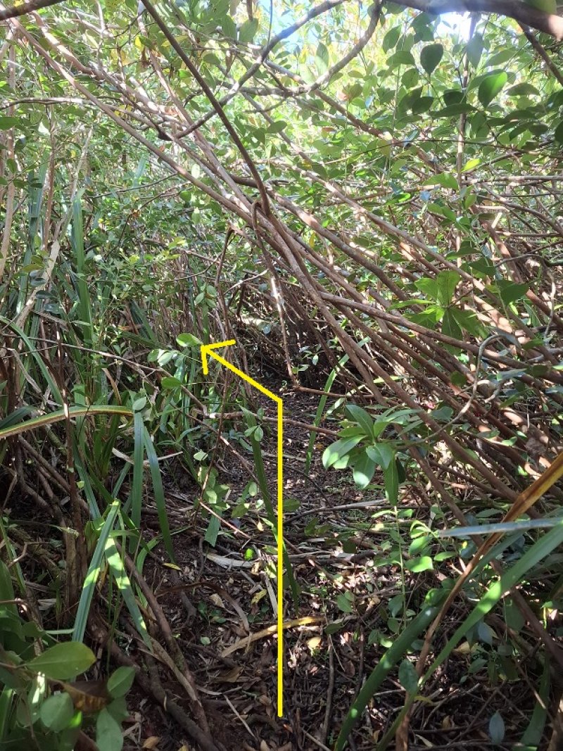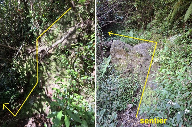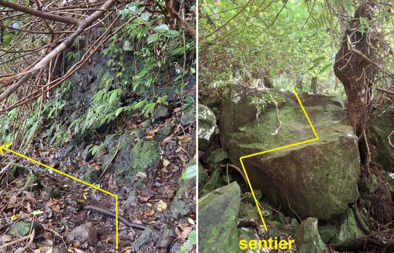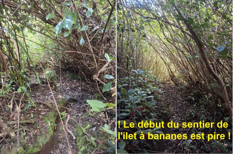 La randonnée débute à la Route de Bélouve et emprunte la Piste Forestière n° 3 fermée par une barrière. On peut également, afin d'éviter la piste, emprunter 100 m plus loin le Sentier de Takamaka, parallèle, qui traverse une magnifique forêt primaire mais il faudra compter le double de temps. Il vaut mieux le réserver pour le retour si la météo est bonne. Cette piste, en descente constante traverse une magnifique forêt de bois de couleurs d'où dépassent de très hautes fougères arborescentes (Photo 1). La marche s'effectue sur de la terre, des petits cailloux, de l'herbe, des ornières et parfois sur du goudron avec toujours de belles vues sur les pitons alentour (Photo 2). A la fin de la piste, 30 minutes plus tard, repérer le sentier herbeux qui débute sur la gauche dans les branles. Avant de l'emprunter, filer tout droit vers les installations EDF entourées d'une haute grille et surveillées par caméra. On y distingue le téléphérique qui permet aux ouvriers de se rendre au barrage, 400 m plus bas. Un coup d'œil sur la superbe vallée de la Rivière des Marsouins et le barrage en contrebas permet de repérer le lieu de destination de cet aller-retour sportif (Photo 3). Reprendre un court tronçon de piste et emprunter le sentier repéré plus tôt. Il traverse une zone plate et herbeuse bordée de branles avec de belles vues sur les remparts verdoyants bordant la Rivière des Marsouins (Photo 4). Il rencontre le sentier de Takamaka près d'un panneau d'avertissement et chemine tout d'abord entre les racines de grands branles verts moussus (Photo 5). La suite descend lentement vers la rivière sur des parties terreuses ou herbeuses, quelques marches et souvent de la boue (Photo 6). On parvient en une dizaine de minutes agréables à une première échelle orangée puis à nouveau panneau, début de la vertigineuse descente facilitée par 25 échelles. La première se situe près d'une arche végétale (Photo 7). De très bonne qualité et bien arrimées à la roche, ces échelles (Voir l'inventaire § ci-dessous) facilitent grandement la descente (Photo 8). Il est préférable, pour plus de sécurité, de les descendre face aux barreaux (Photo 9). Les doubles échelles sont fréquentes tant la pente est verticale sur de hautes portions (Photo 10). Certaines parties non sécurisées demandent plus d'attention surtout si le sol terreux est glissant (Photo 11). On a parfois de belles vues vers l'immense forêt de l'Îlet Patience (Photo 12) et sur la vallée où l'on distingue les installations EDF et même la trace du sentier qui y mène (Photo 13). Lorsque, 30 minutes plus tard, la dernière échelle est franchie, il faut rechercher sur la droite le début du sentier qui file vers l'Ouest, entre les poteaux de l'ONF (Photo 14). Les premiers mètres dans les milliers de goyaviers peuvent faire craindre le pire. Mais, très vite, on retrouve le sentier dans un état très correct vu le manque d'entretien. Jamais on ne se pose la question de la direction (Photo 15). Quelques buissons de vigne marronne peuvent faire craindre un envahissement mais, là également, on passe sans griffures (Photo 16). Un sécateur à la main pourra rassurer. Quelques passages sont parfois techniques, imposant de s'asseoir ou de se cramponner aux branches mais pas de passage scabreux (Photo 17). Tout le reste du parcours s'effectue en sous-bois agréables sur un sentier étroit avec la présence de jouvences (Photo 18). On repère par deux fois un sentier descendant vers la Rivière des Marsouins, certainement créé par le passage des pêcheurs. Plus loin, un panneau jaune de l'EDF se situe au croisement du premier sentier important partant sur la gauche. Le repérer pour le retour et poursuivre sur un terrain bien nettoyé (Photo 19). La vallée devient de plus en plus étroite. Plus haut, coule le Bras Chansons sur le Plateau Duvernay (Photo 20). La fin de la descente s'effectue sur un sol devenu plus pierreux (Photo 21). On se retrouve nez à nez avec une large grille fermant la zone réservée du barrage. On aperçoit au loin les infrastructures très élaborées de recueil des eaux derrière un immense champ de chouchous (Photo 22). L'entrée est interdite mais si le portail est ouvert, on peut pousser sur une cinquantaine de mètres pour admirer de belles cascades dont le débit est dirigé vers des canaux enterrés (Photos 23 et 24). Cet impressionnant chantier permet de récupérer toute l'eau tombant des montagnes et la diriger par un long tunnel vers l'amont de l'usine, au niveau du parking en fin de RD53, pour alimenter l'usine souterraine. Après avoir fait demi-tour, bifurquer sur la droite au panneau jaune. Le sentier rencontre très vite d'impressionnantes échelles. On entend couler la rivière tout près. Entamer la descente verticale, rassuré par la protection des arceaux métalliques (Photo 25). La deuxième échelle est plus courte et légèrement oblique (Photo 26). La fin de la descente se fait le long de rambardes jusqu'à la rive de la Rivière des Marsouins. Le lieu à lui seul mérite les efforts fournis pour l'atteindre. De larges rochers permettent de se reposer. Un vaste bassin entouré de petites chutes offre une eau limpide (Photo 27). L'endroit est paradisiaque et souhaitons que personne n'osera y laisser ses déchets. Il faut nager pour atteindre la cascade en amont dans une eau assez fraîche (Photo 28). Attention de ne jamais plonger directement dans une eau froide lorsque l'on vient de fournir un effort parfois important comme c'est le cas ici. Après une baignade, un casse-croûte ou tout simplement un agréable repos, il faut se préparer à affronter à nouveau les échelles en direction de Bébour à moins de continuer vers Saint-Benoît en passant par les autres installations de l'usine.