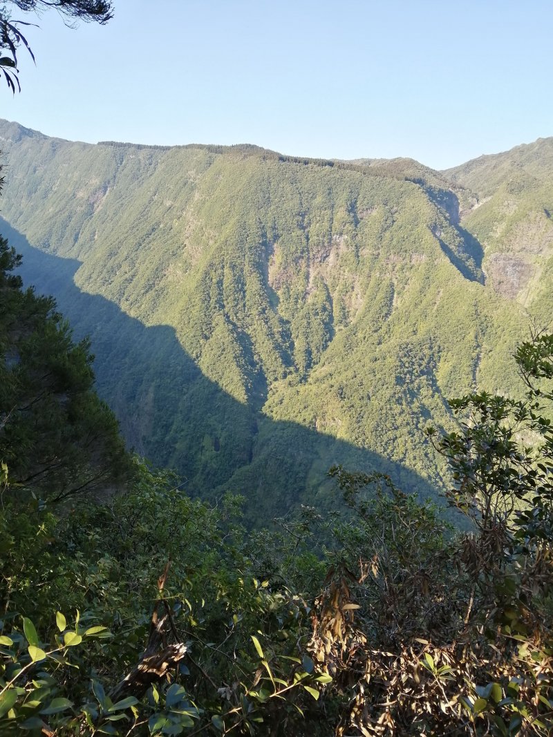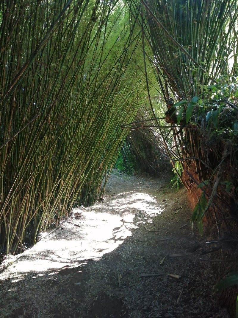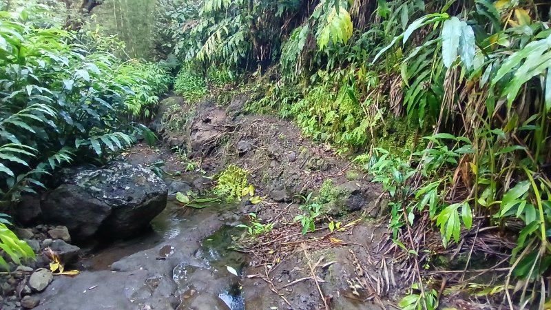 La randonnée débute au croisement de la route du Brûlé et de celle de la Cascade Maniquet. Le cheminement est très facile jusqu'à la cascade car effectué sur la route bordée de la forêt de cryptomerias (Photo 1). La route, en lacets, est en légère descente. Après le troisième virage, repérer sur la droite le sentier de la Cascade Maniquet. La descente au bassin est courte, sans trop de difficulté sur un sol parfois glissant et permet d'admirer une belle cascade, fine et élégante, très connue de la région des Hauts du Brûlé (Photo 2). La remontée est obligatoire. Poursuivre sur la route en franchissant le Grand Bras qui alimente la cascade (s'il y a de l'eau - Photo 3). Repérer, tout près du radier, le sentier de Prévallée partant sur la gauche. Si les délais le permettent, pousser jusqu'au bout de la route pour contempler la magnifique et sauvage vallée de la Rivière Saint-Denis à partir de l'aire de pique-nique vieillissante (Photo 4). On distingue très bien l'Îlet à Guillaume juste en face au milieu des camphriers. Revenir en arrière jusqu'au départ du sentier de Prevallée repéré au radier. Il franchit le Grand Bras au fond rocheux avant de pénétrer dans un bois d'eucalyptus avant de poursuivre sous les conifères (Photo 5). Il est parfois un peu boueux, surtout au début près du Grand Bras. Après une forte pente, il redescend lentement vers le Grand Bras qu'on traverse à nouveau. Les goyaviers représentent la majorité de la végétation entourant le sentier large, glissant et comportant quelques marches (Photo 6). Partir à droite en arrivant à la route puis prendre la direction de Mamode Camp. Bifurquer à la première intersection et rejoindre le parking de l'immense aire de jeu et de repos entourée de cryptomerias (Photo 7). Marcher jusqu'au panneau du parcours sportif qui n'a plus rien de sportif sans ses ateliers. Rejoindre ensuite le croisement des deux routes pour partir immédiatement à gauche en direction du Morne Saint-François, bien indiqué sur les poteaux de l'ONF. Marcher 1200 m dans les longoses et sous les cryptomerias en rencontrant de nouvelles tables de pique-nique ça et là (Photo 8). Ne pas manquer le sentier de raccourci avant un grand virage à gauche de la route. Ce sentier descend sous les grands arbres, franchit la toute jeune Ravine du Butor puis remonte rejoindre la route un peu plus loin. C'est reparti pour 900 m de béton en profitant de quelques points de vue vers la mer au-dessus des fougères (Photo 9). Malgré la randonnée sur route, le trajet verdoyant est très agréable (Photo 10). On peut également repérer le Morne reconnaissable à ses trois filaos qui dépassent (Photo 11). Le départ du sentier du Morne Saint-François est facile à trouver sur la droite après quelques virages. Il débute sous forme de piste puis très vite se transforme en large sentier sous les cryptomerias (Photo 12). Il se rétrécit au fur et à mesure de la descente ; des rondins et des marches facilitent par moment le cheminement dans les descentes un peu plus fortes. On parvient à un premier point de vue sur la Ravine des Patates à Durand. On distingue deux cascades provenant des ravines en face, dont une n-ième ravine Blanche (Photo 13). Vers l'amont c'est une autre cascade venant de la Ravine Grande Marmite qui coule dans la verdure (Photo 14). Le sentier passe parfois au plus près du rempart et peut incommoder les acrophobesL'acrophobie est la peur du vide sur de courts tronçons (Photo 15). La marche est toujours aussi facile jusqu'au morne. Une plateforme bétonnée, emplacement d'un très ancien kiosque, permet de larges points de vue sur le chef-lieu. Sur la gauche, le cœur de la ville et La Montagne sont en partie cachés par quelques arbres (Photo 16). Après avoir profité du panorama, rebrousser chemin jusqu'à la route et bifurquer à droite jusqu'à quelques cryptomerias (Photo 17). Retrouver, sous ces cryptomerias, le sentier qui rejoint les Hauts de Macassis en passant sous les goyaviers et dans les fougères. La descente est légère le plus souvent mais le sol peut être glissant s'il est humide (Photo 18). Continuer jusqu'à l'énorme eucalyptus et partir à gauche vers les cases de Macassis. Marcher une dizaine de mètres sur la route puis partir à gauche, sous un gros filao, sur le sentier Laverdure. Il plonge en quelques mètres vers le gué de la Ravine Bois d'Oiseaux entouré des premières touffes de bambous. Ce sentier, qui aurait aussi pu s'appeler "la verdure", car c'est bien la couleur qui domine sur les 4 kilomètres, serpente sous les cryptomerias, goyaviers et bambous sur un sol moussu (Photo 19). Les travaux entrepris en 2021 ont vite redonné l'éclat qu'il avait perdu depuis une décennie (Photo 20). Même sans travaux, le sentier est toujours visible (Photo 21). Le sentier effectue de plus en plus de lacets serrés pour franchir les pentes de la Ravine du Butor qu'on ne tarde pas à traverser à nouveau (Photo 22). Une partie de la traversée jusqu'au Brûlé s'effectue sous les cryptomerias où il est parfois facile de s'égarer (Photo 23). Les portions les plus agréables sont sous les bambous qui représentent ici la plus grande implantation de l'île (Photo 24). Les portions les moins intéressantes sont celles où les goyaviers poussent si serrés qu'on ne peut envisager de quitter l'itinéraire (Photo 25). Les longoses, quand elles sont mouillées, sont désagréables car elles détrempent tous les vêtements (Photo 26). Une fois la multitude de virages terminés, le bruit des chiens, de la musique à tue tête, des voitures indiquent qu'on se rapproche du Brûlé. Le sentier, très fréquenté, est alors de très bonne qualité même s'il demeure glissant (Photo 27). Ne pas manquer, parmi tous les carrefours, celui qui mène vers la dernière descente pour franchir le Bras Mahot sur une passerelle qui sera bientôt dévorée par la végétation (Photo 28). Emprunter l'e