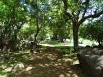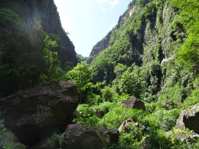 Le sentier débute à la passerelle qui enjambe la ravine (Photo 2). Un nombre impressionnant de chaussures jetées sur les fils électriques participent à l'accueil des randonneurs (Photo 1). Le "shoes tossing" est commun dans le monde en général et à La Réunion en particulier. La passerelle de la Ravine Divon permet de tricher un peu en lançant les chaussures depuis le plancher, permettant ainsi de gagner trois mètres. Le sentier suit le lit qui est assez large pour un cours d'eau aussi court (Photo 3). Quelques portions de terrain sont recouvertes d'herbe rase (Photo 4), tondue par les chèvres venues des habitations de Bouillon par des sentiers escarpés qu'on devine sur la gauche. Le sentier passe souvent au plus près de l'eau, ce qui permet de surprendre un poisson nageant entre les racines des plantes poussant au fond (Photo 7). Sur la gauche, de hautes barres rocheuses abritent quelques grottes (Photo 6). Le sentier est le plus souvent large et bien entretenu (Photo 8). La falaise, de l'autre côté, est plus haute et verticale, impossible à franchir (Photo 9). Il faut passer par de petits gués pour aller de temps en temps d'une rive à l'autre en suivant le plus naturellement possible le sentier pris en rive droite au début. La végétation est souvent constituée de lianes courant sur le sol comme des treilles de chouchous ou les lianes antigone (Photo 11). Une falaise verticale percée de plusieurs grottes domine ce bassin ; l'une d'entre elles comporte plusieurs vestiges de visites fréquentes (Photo 13). Il faut à nouveau traverser quelques fois la rivière en suivant la trace facile à deviner. Le trajet passe plus loin entre de grosses touffes de bambous (Photo 16). La progression continue en longeant une importante invasion du bas du rempart par des chouchous (Photo 17). Le sentier entame une montée plus forte et s'approche d'un bassin, entouré de taros et de papyrus, alimenté par une minuscule chute (Photo 18). C'est la fin de la randonnée pour tous. Il est possible, sans courir de grands risques de poursuivre sur des traces de plus en plus difficiles à voir dans la végétation en direction de l'amont. Le sol est surtout recouvert de grosses roches surchauffées par le soleil (Photo 19). En escaladant les rochers, on atteint le haut du bassin (Photo 20). Le sentier a disparu et la meilleure solution consiste à raser la falaise en rive gauche pour cheminer en direction du pisse en l'air qu'on aperçoit à quelques mètres (Photo 21). Une source dans la falaise se déverse en fines gouttelettes qui viennent alimenter la ravine (Photo 22). Poursuivre au-delà de ces éclaboussures relève de l'aventure car la vallée devient étroite et les plantes recouvrent les roches, laissant des zones cachées où il ne fait pas bon tomber. Le retour s'effectue par le même itinéraire jusqu'aux bambous. Repérer certaines zones rocheuses bordées de belles pelouses incitant à l'arrêt (Photo 23). Les rochers sont équipés et il est fréquent d'y rencontrer des grimpeurs à l'entraînement. Après le Bassin Long, obliquer sur le sentier ombragé qui chemine en rive gauche (Photo 25). De nouveaux emplacements calmes et ombragés se présentent (Photo 26). On s'approche de nouveaux spots de grimpe avant de parvenir à des vestiges de canal bouché par la terre (Photo 27). Des marches sur le rocher indiquent la présence d'un sentier qui finit désormais en propriété privée. Le sentier, large et bordé de pierres, s'élargit pour une promenade facile jusqu'au dernier gué (Photo 28). La fin du trajet emprunte l'itinéraire du début jusqu'à la passerelle.