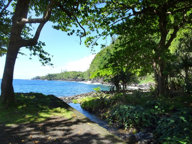 La randonnée débute au petit village de Bois Blanc près de l'arrêt principal de bus. Se rapprocher de l'arrêt et de la petite route en haricot. Le sentier débute juste là et rejoint la mer sur un terrain couvert de pierres de laves moussues et de feuilles de vacoas (Photo 1). Il arrive à un croisement de sentiers. Celui de droite mène en direction du Quai de l'Eglise. Prendre à gauche et traverser la Ravine de Bois Blanc sur un sol très humide et glissant. Poursuivre en longeant le littoral constamment arrosé par les vagues (Photo 2). Le sentier, assez large et ombragé sous les pandanus, passe entre les habitations et l'océan. Quelques bananiers indiquent la proximité du village (Photo 3). On rejoint très vite l'aire de repos et la cocoteraie de Bois Blanc où quelques kiosques (et les moustiques) attendent les pique-niqueurs (Photo 4). Traverser la cocoteraie et franchir plus loin la Ravine Ferdinand puis attaquer la courte mais forte pente qui rejoint en quelques lacets et marches le bord du rempart (Photo 5). Il est bordé de vanille poussant sur des pieds de pandanus (Photo 6). Beaucoup de fougères et de bambous occupent les bords du sentier (Photo 7). Sur la droite, dans les trouées, on devine souvent l'Anse des Cascades qu'on rejoindra après une visite au Gros Piton (Photo 9). Prendre à gauche au prochain croisement de sentier et rejoindre les cannes à sucre poussant le long de la RN2 (Photo 10). Un petit sentier, bien indiqué par un poteau de l'ONF, part en direction du sommet dans les herbes, les goyaviers et les poivriers (Photo 11). On rejoint très vite le sommet d'où l'on bénéficie de superbes panoramas sur l'océan (Photo 12). Un long belvédère attend les curieux, amateurs de splendides panoramas (Photo 13). Un panneau explique que ce piton était le point d'observation des éruptions depuis des générations. Une table d'orientation sommaire donne la position de quelques sommets (Photo 14). Après s'être régalés du paysage, partir par la piste et effectuer le tour complet du sommet par la piste. On contourne ainsi l'antenne relais qui domine le piton (Photo 15). La piste est courte et il serait dommage de ne pas l'utiliser, ne serait-ce que pour profiter différemment des panoramas verdoyants (Photo 16). Après cette courte boucle qui ne prend que quelques minutes, reprendre le sentier et poursuivre celui rencontré au croisement. Il est large et descend par quelques lacets vers la route de l'Anse des Cascades (Photo 17). Une fois à la route, partir un peu à gauche et emprunter le sentier qui descend à la rencontre de celui de Sainte-Rose par de très nombreuses marches. La visite de l'anse en partant sur la droite ne prendra qu'un quart d'heure si on ne connait pas cet endroit charmant. Un raccourci permet de descendre plus vite mais la route est courte. On arrive près d'une cocoteraie sur la gauche comportant des dizaines d'arbres dont les grands troncs semblent mieux résister aux cyclones (Photo 18). C'est sans doute dû à la souplesse du tronc et à l'énorme pied qui le maintient. Une piste cimentée traverse toute la zone afin de permettre aux fauteuils roulants de passer plus facilement (Photo 19). Il ne faut que quelques minutes pour rejoindre une des cascades en utilisant ces pistes (Photo 20). Ne pas manquer de se rapprocher de la plage de galets de l'anse bordée de filaos (Photo 22). Une fois la visite terminée, repartir sur le sentier littoral qui débute par une belle pente sous les vacoas afin de contourner une falaise basaltique (Photo 23). De là-haut, on domine la mer et les roches battues par les vagues (Photo 24). Puis le sentier ondule au gré de la côte et redescend au plus près de l'océan du côté de la Pointe des Bambous où il est possible de se rapprocher au plus près pour y trouver une modeste arche dans le basalte (Photo 25). On aperçoit déjà la coulée de 1977 du côté de Piton Ste-Rose mais il faut se préparer à bifurquer (Photo 26). Le sentier est très agréable dans les fougères sur un sol souvent caillouteux (Photo 27). I faut pourtant le quitter en empruntant le très discret sentier du Quai de Sardine qui repart à gauche en direction du Gros Piton. Quand il est bien entretenu, il n'est pas très large mais est agréable à utiliser (Photo 28). On rejoint en marchant presque à plat la petite route de l'Anse des Cascades. A moins de revenir à l'Anse des Cascades pour un repas au restaurant ou un pique-nique sous les cocotiers, reprendre le sentier pris à l'aller et rejoindre Bois Blanc par le même itinéraire.