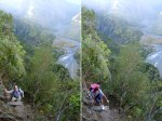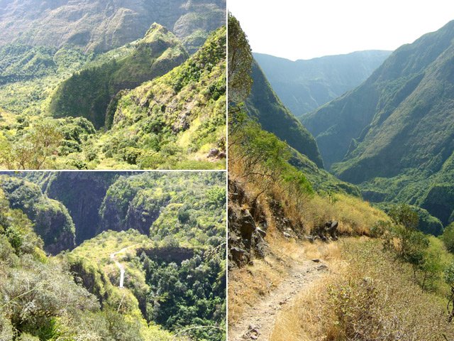 La randonnée débute à l'église de Dos d'Ane dans les hauts de la Possession, emprunte un court tronçon de route en descente, longe quelques habitations puis rejoint très rapidement le rempart de la Rivière des Galets en partant sur la gauche. On débute presque à plat en longeant la courbe de niveau mais très vite les premières difficultés se font sentir. Les paysages sur la vallée ou les montagnes de tous côtés sont très agréables le matin lorsque le soleil commence à les faire apparaître (Photo 1). Le Piton Cabris et le Gros Morne occupent déjà une bonne part du panorama (Photo 2). La descente est parfois vertigineuse sans être dangereuse, protégée par des câbles sur les rochers glissants ou facilitée par des échelles (Photo 4 et 5). Bien se souvenir de ces passages car ils seront effectués en montée en fin de boucle de plus de 8 heures. On rencontre à nouveau quelques parties plates mais sur de courtes distances. On distingue de mieux en mieux la Crête d'Aurère, le Piton Cabris et le fond gris de la Rivière des Galets (Photo 6). Les paysages sont magnifiques de tous côtés, tant vers l'îlet Alcipe (Photo 7) que vers les premières pentes d'escalade du Piton Cabris (Photo 8). Plus loin on domine l'îlet Albert qui est assez bien entretenu et constamment arrosé grâce à la source qui coule au-dessus (Photo 9). Une fois l'Ilet Albert atteint une bonne heure après le départ, les difficultés vont diminuer. On traverse à gué le Bras de Sainte-Suzanne sur de gros rochers qui peuvent être humides le matin de bonne heure. On laisse la piste qui remonte la rive gauche du Bras de Sainte-Suzanne et on attaque la remontée de la Rivière des Galets. On marche sur la piste sableuse et plate desservie par les taxis avant de trouver des portions de sentiers qui suivent la rivière ou la traversent sur des gués assez solides. Après 2000 mètres de ces millions de cailloux (Photo 10), on laisse sur la gauche le sentier qui remonte vers Aurère à partir de la Porte et on s'approche, toujours en marchant le long de la rivière, d'un barrage de récupération de l'eau qui est dirigée par de longs tunnels en direction de la côte ouest (Photo 11). Le barrage se contourne par un assez long tunnel (Photo 12) avant de retrouver à nouveau le fond de la rivière rempli de galets en direction des Lataniers. Remarquer au passage du Bras d'Oussy, en regardant les deux falaises abruptes sur la gauche, la passerelle qui les relie et qu'on empruntera dans moins de 3 heures (Photo 13). On peut escalader les rochers pour profiter du grand bassin de la fin du torrent qui finit ici sa course. Le cheminement ne pose guère de problème dans ces gorges et on rejoint rapidement une bifurcation de deux sentiers aux alentours de la Source des Hirondelles, là où se rencontrent la Ravine Grand Mère venant de l'îlet des Orangers et la Rivière des Galets. On quitte le lit de la rivière pour filer en direction de Grand Place en profitant de nouveaux panoramas en direction du Piton des Calumets (Photo 15). Le sentier de gauche, qu'on utilise, montera rapidement d'une centaine de mètres avant de s'adoucir vers le cimetière de Cayenne. Celui de droite, qu'on délaisse, se poursuivra sur 7 ou 800 mètres le long de la rivière avant de monter à son tour après avoir franchi la passerelle métallique située sur le sentier venant de Grand Place pour rejoindre les Lataniers (Photo 17). Il est possible, après étude de la carte, de choisir l'un ou l'autre de ces itinéraires pour arriver au même endroit. La montée par le sentier plus fréquenté est difficile mais de courte durée. On croise à droite le sentier venant de la passerelle puis plus loin celui qu'on reprendra au retour après avoir quitté Cayenne. Les points de vue sur la pyramide très pointue du Piton des Calumets sont de plus en plus présents (Photo 18). On a du mal, vu d'ici, d'imaginer le trajet qu'il faut employer pour l'escalader. Il faut alors prendre la direction de Grand Place et bifurquer à droite pour couper la Ravine Fontaine sous les tuyaux qui transportent l'eau aux cases et se retrouver déjà parmi les premières fleurs de ce superbe petit îlet. Le village vaut à lui seul une visite (Photo 19. La petite chapelle accueille les fidèles des îlets proches grâce à une cloche située à l'extérieur et provenant des thermes détruits par un effondrement des parois du Bronchard en 1913 (Photo 20). Profiter un moment du calme et de la beauté de ce petit îlet qui dispose même de gîtes. Pour éviter de reprendre le chemin inverse, le retour empruntera le sentier du Piton Tortue afin de franchir la passerelle du Bras d'Oussy. Filer tout droit au lieu de partir à gauche sur le chemin de l'aller. Ne pas oublier, 300 mètres après le croisement vers la Lataniers, de rendre une visite respectueuse et émouvante au cimetière ou reposent les habitants des îlets environnants (Photo 22). Le sentier, indiqué par un panneau en bois, est très court. Celui qui monte lentement est facile jusqu'au col du Piton Tortue. La descente s'effectue dans une végétation pauvre laissant penser parfois à une savane avec points de vue nombreux sur les vallées du Bras d'Oussy ou de la Rivière des Galets (Photo 23). Plus bas, quelques passages vertigineux pourront incommoder certains, surtout que le sol à cet endroit n'inspire guère confiance tant il est sableux et glissant (Photo 24). L'endroit est un peu vertigineux mais sans danger depuis sa remise en état, surtout que de solides rambardes ont été rajoutées. On rejoint très vite la passerelle qu'on voyait depuis le col (Photo 25). Depuis la rambarde, la vue plongeante sur le bras, 50 m en dessous, est impressionnante (photo 26). Plus loin, dans la remontée on a encore de belles vues sur la passerelle, le sentier vertigineux et le canyon de la Rivière des Galets qu'on rejoindra bientôt. Le sentier devient très agréable et descend graduellement vers la 