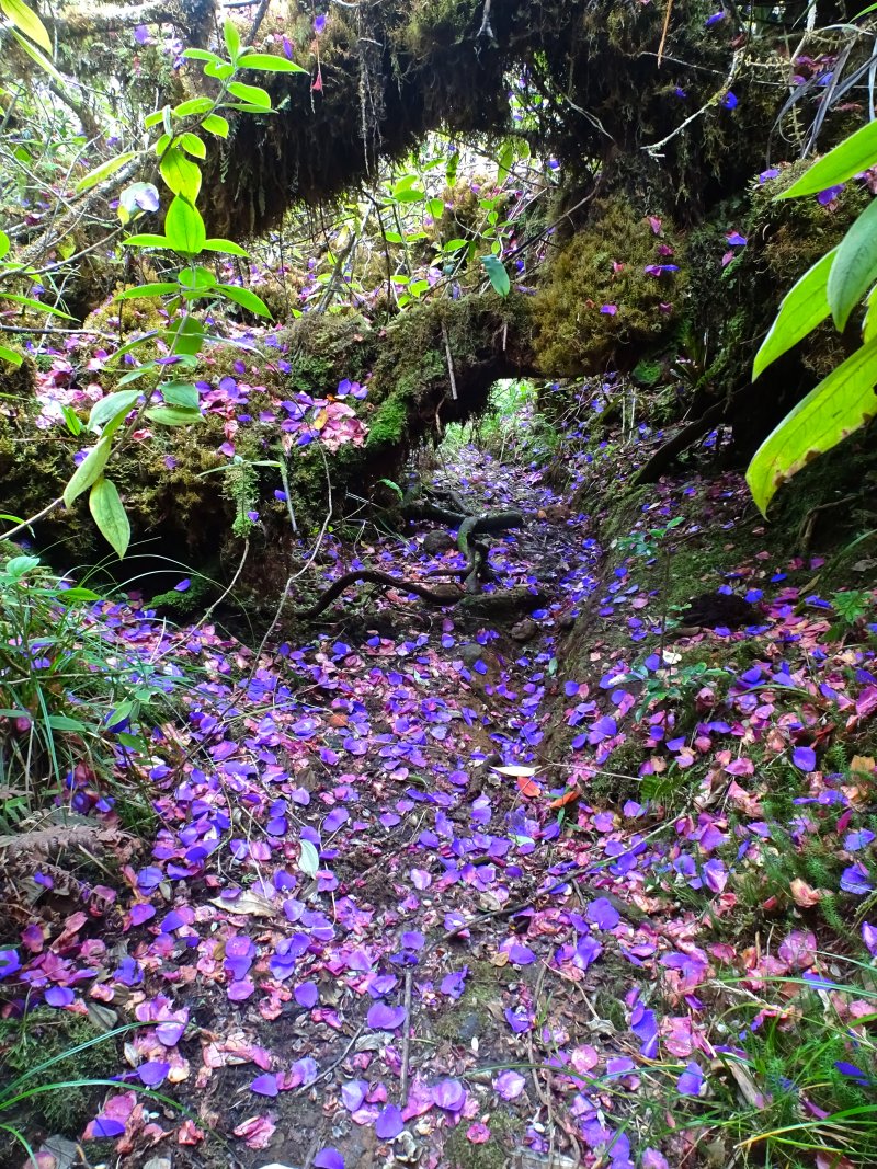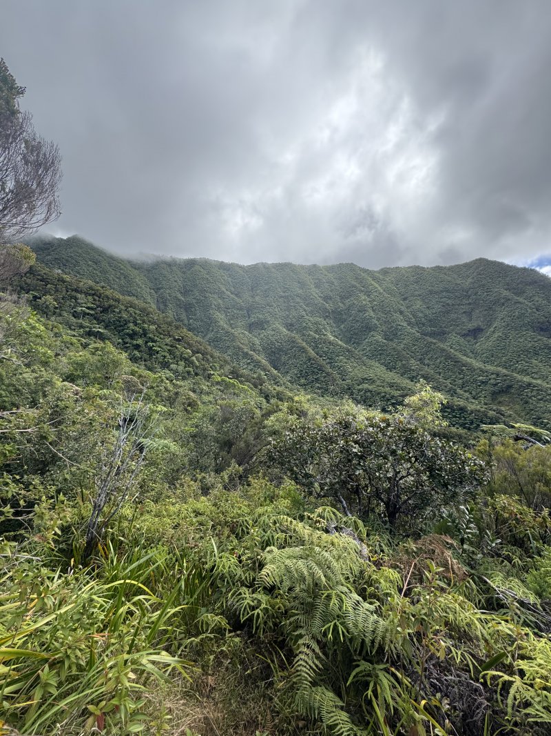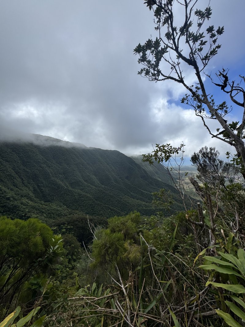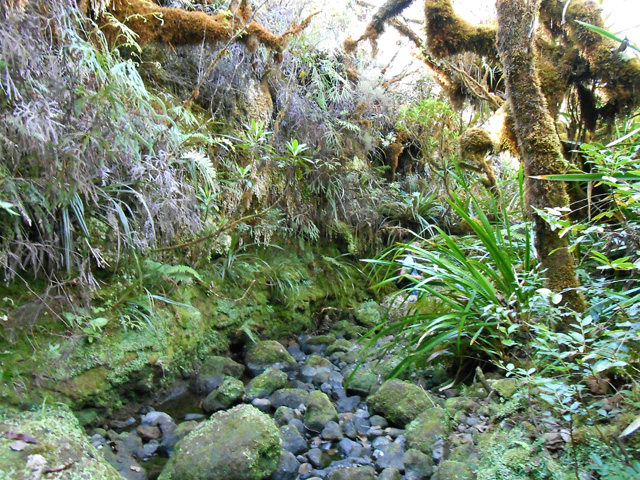 La randonnée débute comme pour effectuer le trajet du sentier du Bras Cabot en suivant une courte piste puis un sentier en dents de scie le long des prairies de la Plaine des Palmistes, au milieu des goyaviers (Photo 1). Après cette étape de plus en plus envahie par la végétation, le sentier oblique à gauche pour entamer une montée le long du rein. La grimpée est sportive mais abordable par une longue série de lacets qui permettent quelques vues en direction de la Plaine des Palmistes ou vers le Pic des Sables (Photo 3). Le sentier, assez peu utilisé, est parfois envahi de toutes les plantes habituelles de ces contrées humides (Photo 4). Parmi toutes ces plantes, ce sont les fanjans qui l'emportent le plus souvent sur les bois de couleurs (Photo 5). On en trouve même au plus près du sentier parmi les arbres qui commencent à se couvrir de mousses (Photo 6). On se retrouve, après 45 minutes de montée, près des installations bétonnées de recueil et de distribution des eaux (Photo 8). A la source, éviter le sentier de gauche pour privilégier celui de droite qui descend dans le lit d'un affluent de Petit Bras Patience. Une fois le bord du rempart atteint, débuter la traversée du plateau de l'Îlet Patience en laissant à gauche le sentier du captage du Bras Magasin. A partir de là, on pénètre dans le paradis des mousses propres aux lieux humides et on le les quittera plus (Photo 9). Le sentier est de moins en moins marqué mais toujours visible. On se retrouve à franchir un gué de la Ravine Biberon dont les eaux se jettent dans le vide deux kilomètres plus loin (Photo 10). La progression s'effectue presque à plat au milieu des ces fouillis de branches moussues (Photo 11). Le sentier des sources du Bras Cabot se présente parfois sous la forme qu'il avait il y a quelques années, c'est-à-dire large et plat (Photo 12). Hélas, ce n'est plus le cas depuis bien longtemps et il faut chercher la trace dans les sabres et les fougères (Photo 13). Les portions boueuses sont fréquentes mais on rencontrera plus loin des ravines pour rincer les chaussures (Photo 14). Franchir plus loin le Premier Bras d'Annette et ralentir le pas aux alentours du point 1419 à l'approche du Second Bras d'Annette (voir coordonnées ci-dessous). Le sentier plonge vers la ravine en utilisant déjà les racines ou branches latérales. L'humidité est palpable, les mousses omniprésentes mais le sentier reste toujours visible (Photo 16). On a l'impression que les mousses se sont encore multipliées et il est très difficile de deviner les espèces d'arbres rencontrées (Photo 17). Il faut prendre son temps pour dénicher les dizaines d'orchidées, les champignons, les variétés de mousses ou zoizo la vierge qui vient voir de très près les nouveaux intrus. Le sentier débouche sur le Bras d'Annette et on imagine que la balade des mousses s'arrêtera là (Photo 18). Une rubalise accrochée à une branche ou quelques traces sur les pierres là où la mousse n'a pas résisté à la chaussure de randonnée indiquent qu'on peut poursuivre (Photo 19). Certains passages encombrés de branches, racines et lianes doivent se passer à l'instinct en cherchant au sol la mousse absente, signe d'un passage récent (Photo 20). A la ravine, peu de traces de sentier. Il faut alors marcher dans le fond en guettant les sentiers qui évitent les parties dangereuses (Photo 23). On peut ainsi cheminer de fond de ravine en sentier vers l'aval dans des portions plus faciles qu'on imagine (Photo 24). Certains franchissements sont faciles sur un fond de ravine propre (Photo 25), d'autres, plus encombrés, demandent un minimum de gymnastique (Photo 26). Poursuivre ainsi en utilisant ces ravines au fond parfois très rocheux pour se rapprocher du rempart dominant le Grand Etang (Photo 27). Pourquoi ne pas tenter d'atteindre les captages sur la rivière ou le haut des Cascades du Bras d'Annette qui se jettent dans l'étang. Pour cela il faut prévoir une journée dédiée à cette sortie et ne pas faire comme nous en allant voir de plus près l'état du sentier de Bras Cabot au-delà de la Ravine Pavée, du Bras Vermouth ou du Bras Magasin, entreprise qui demande désormais plusieurs heures. S'inspirer, pour continuer, de la carte de Martial postée en juillet 2019 et arriver ainsi, après plusieurs autres heures d'effort, aux captages en très bon état.