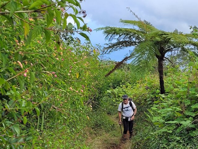 La randonnée débute sur la route Forestière des Cryptomerias au croisement avec la piste du Bois de Nèfles. Le cheminement est toujours aisé, en descente légère constante sur un sol tout d'abord couvert d'herbes (Photo 1). Sur la gauche, quelques prairies ponctuées de grands arbres accueillent encore quelques bovins mais, faute d'entretien, se couvrent déjà de quelques vignes marronnes (Photo 2). Franchir la Ravine Jardin avant d'effectuer ou non un court détour dans la forêt de cryptomerias. Dans ce cas, obliquer à droite à la première piste fermée d'une barrière et entamer une légère montée en lacets au milieu des longoses (Photo 3). On se retrouve sur une agréable piste dans une mer de longoses d'où dépassent les cryptomerias. Ne pas manquer, à la fin des conifères, le sentier de gauche qui longe la lisière et descend vers la piste de Bois de Nèfles (Photo 4). Le sentier est étroit et peu utilisé. La pente est assez forte. Le sous-bois est de plus en plus recouvert de galaberts qui ont détrôné les longoses (Photo 5). On retrouve la piste assez terreuse sur quelques hectomètres (Photo 6). Elle descend en pente très légère avant d'entamer une série d'une demi-douzaine de longs lacets. Les abords sont envahis mais on distingue pourtant facilement l'océan, la ville de Saint-Paul et celle du Port (Photo 7). La piste se transforme en une agréable route étroite si l'on oublie la végétation qui la borde (Photo 8). Il faut beaucoup d'imagination pour se représenter un champ ou un pâturage quand on longe d'inextricables buissons de vigne marronne (Photo 9). Heureusement, quelques prairies demeurent et semblent épargnées pour le moment (Photo 10). D'autres fois, ce sont les galaberts qui ont envahi les anciens champs et bien malin qui pourrait traverser (Photo 12). Des fonds de petites ravines sont recouverts de longues lianes de chouchous dont les fruits, que l'on voit pendre, ne seront jamais cueillis (Photo 13). Attention, plusieurs chemins plus ou moins bien entretenus coupent les virages de la route mais sont généralement en propriété privée ; rester sur le béton afin d'éviter tout litige. On se retrouve bientôt sur le Chemin Féoga que l'on emprunte vers la gauche. Quelques habitations ou fermes bordent la route qui ondule de ravine en ravine. Ne pas manquer l'oratoire original sur la droite à l'entrée de quelques habitations (Photo 14). C'est en réalité une série d'oratoires ayant chacun ses ex-voto en remerciement de vœux exaucés. Ne pas manquer, après l'oratoire, le petit château d'eau sur la droite. Une piste débute juste en face, fermée par une chaîne. C'est la fin de la Piste Louis Emile venant des premières pentes du Maïdo. La chaîne a été installée pour ralentir le vol de bois dans les propriétés en amont. C'est un des nombreux parcours VTT sillonnant les flancs du Maïdo. Un bâton de randonnée rassurera pour passer la chaîne en prenant garde aux chiens plus bruyants que méchants qui arrivent de la maison toute proche (Photo 15). La pente sera plus rude pour remonter les 400 mètres descendus sur de longs lacets plus au nord. On longe tout d’abord les prairies dans la poussière laissée par les engins et vélos (Photo 16). On profite encore de beaux panoramas sur l'océan. Plus haut, la pente s'accentue en suivant les champs de canne à sucre (Photo 17). Quelques panneaux rappellent l'emploi sans doute régulier de la piste Louis Emile par les vététistes (Photo 18). La piste cesse à la fin des champs et se transforme en sentier gardant la même pente (Photo 19). Si jusque là on avait régulièrement rencontré partout des touffes de plantes invasives, on se retrouve désormais en plein au cœur. Sur la gauche, les anciens champs sont verdoyants et fleuris d'une plante non comestible, le galabert ou lantana (Photo 2). Il y en a partout quand ce ne sont pas les vignes (Photo 21). Le sentier, grâce aux vélos, est toujours agréable malgré la pente (Photo 22). Certaines parties sont creusées par les pneus et le sol peut être glissant par temps pluvieux (Photo 23). Plus loin, le sentier effectue un grand virage vers la droite sur une belle portion herbeuse (Photo 24). Puis la forêt de cryptomerias débute sans transition. La pente est assez forte sur l'épais tapis de branchettes tombées lors des derniers coups de vent (Photo 25). Plusieurs traces faites par les V.T.T se présentent. Prendre à droite puis effectuer une longue boucle sous les grands arbres (Photo 26). La fin de la montée peut s'effectuer sur un des sentiers ou sur la piste elle-même ne présentant aucune difficulté (Photo 27). Après ce kilomètre ombragé, la piste se termine à la RF des Cryptomerias. Partir à gauche et rejoindre sans difficulté le véhicule en profitant des derniers mahots ou bois maigres pas encore anéantis par les invasives de tout poil et de toutes épines (Photo 28).