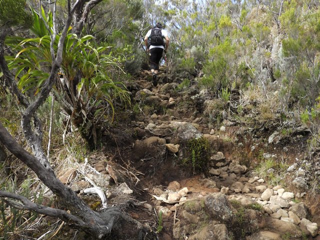 La randonnée débute à Hell Bourg, près de la mairie annexe et suit un chemin entre quelques cases (Photo 1), filaos et touffes de bambous avant de franchir une petite ravine, affluent du Bras des Demoiselles puis de traverser une aire de pique-nique sous les cryptomerias. Le sentier, le plus souvent bétonné, débute un peu plus loin et monte tout d'abord régulièrement dans les plantations domestiquées ou sauvages de chouchous. Il se poursuit sur des marches en pierre bordées de murettes pouvant comporter des câbles de maintien puis sur des cailloux (Photo 5) avant de grimper plus fortement sur des marches bétonnées pour rejoindre le Gîte de Bélouve. Certaines portions comportent des lacets courts et raides, d'autres sont plus agréables. Le sentier se termine à une rambarde en bois près du gîte. Ne pas quitter les lieux sans avoir rejoint le belvédère et jeté un regard vers Hell-Bourg laissé moins de 90 minutes avant. D'autres panoramas seront possibles au fur et à mesure de la montée après avoir franchi la forêt primaire. Plusieurs itinéraires, depuis le gîte, permettent de retrouver le sentier du Piton des Neiges mais la piste qui longe le rempart est plus courte et très agréable. Cette piste, bordée de bois de couleurs et fougères se termine à une installation comprenant une case technique, une grande antenne et un belvédère. On pénètre ensuite dans la belle zone boisée de forêt primaire très humide sur un sentier ou alternent racines (Photo 7), boue, terre, marches en pierres ou en bois. Quelques passages de ravines imposent de redescendre puis de remonter par de courts raidillons glissants. Des passerelles humides facilitent certains passages (Photo 8). Les points de vue sur le Cirque sont moins nombreux qu'on pourrait l'imaginer en voyant la carte (Photo 9). Plus loin, les bois de couleurs et les tamarins diminuent et le sentier, remis en état en 2016, continue ensuite dans les grandes bruyères couvertes de barbes de Jupiter en direction du Cap Anglais. Il faut à nouveau franchir des ravines mais les échelles et les innombrables marches sont plus agréables que la boue de la forêt primaire (Photo 10). On retrouve pourtant cette boue à plusieurs endroits plus plats que les autres. Les points de vue se font plus nombreux sur le cirque et la forêt de cryptomerias de Terre Plate. L'arrivée sur un plateau permet de voir le chemin restant à parcourir en direction du Gîte. Le Gros Morne est à peine caché par les arêtes pointues et blanchies du Cap Anglais (Photo 12). Quelques planchers de caillebotis ou nombreuses marches en bois amènent enfin à la croix de fer du Cap Anglais. Le sentier plonge sur la droite en direction de Terre Plate. Poursuivre vers le sommet en filant tout droit. La Caverne Mussard est très proche du sentier mais les graffitis et les blocs qui peuvent s'en détacher incitent peu à s'y reposer (Photo 15). Les marches salutaires du dernier kilomètre disparaissent et sont remplacées par des milliers de pierres de lave très désagréables car elles encombrent le plus souvent le milieu du sentier et obligent à regarder plus ses pieds (Photo 18) que les immenses panoramas vers la Fournaise et la Plaine des Cafres. La montée se fait moins rude, les cailloux s'espacent et on aperçoit de loin le Gîte de la Caverne Dufour qui sert de repère. Il faut, avant de le rejoindre, passer quelques ravines profondes mais sans difficulté particulière. Une fois le gîte atteint, en fonction de l'heure, choisir de monter au Piton des Neiges ou d'attendre le lendemain matin, très tôt.