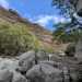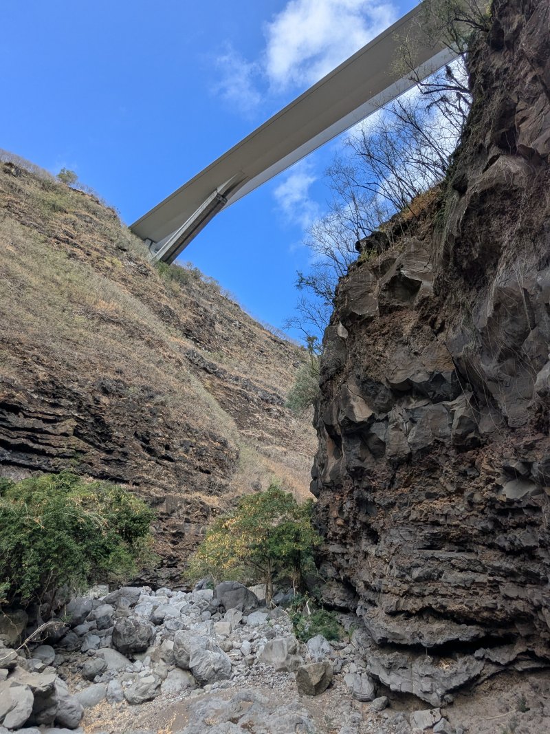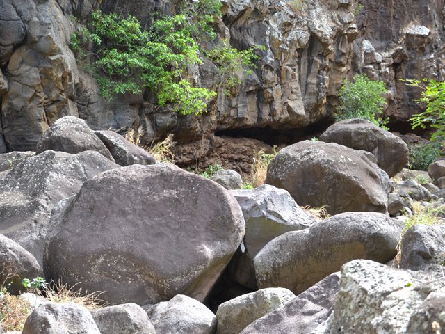 La randonnée débute au village de la Grande Ravine, sur l'ancienne route qui reliait Saint-Leu à la Saline. La jonction avec la ravine est rapide dans les herbes et épineux sur une trace qui diminue en largeur d'année en année. On remarque très vite les piles du pont emportées par un cyclone en aval du pont actuel ainsi que les vestiges de l'ancienne route sur la falaise en face. La portion la plus désagréable, d'une cinquantaine de mètres en amont du vieux pont, est recouverte de tous les cadavres de poules, canards ou pintades de la basse-cour située au dessus. Sans doute, une fois mortes de maladie, finissent-elles dans le fond de la ravine, jetées là par l'habitant des lieux, espérant peut-être les revoir voler avant d'atteindre le fond ! Le pont actuel, en pierres de taille, est encore en très bon état (Photo 1). Il est possible de s'approcher de l'estuaire et des rochers entourant la Passe des Trois Bassins (Photo 2). Le cheminement, de rocher en rocher, peut débuter entre les remparts pour le moment en pente douce (Photo 3). Les acacias noirs ont envahi toutes les rives et même le fond de la ravine quand ils trouvent de quoi implanter les racines (Photo 4). Certains ont atteint des tailles imposantes, sans doute bien implantés ou assez loin des rares crues de la région (Photo 5). Le fond est en général recouvert de gros rochers ou galets usés par l'érosion mais on rencontre également des fonds basaltiques trop plats pour que les roches y demeurent (Photo 6). La pente est faible, les rochers toujours présents mais le cheminement s'effectue régulièrement jusqu'à l'approche du pont de la Route des Tamarins (Photo 7). Plus on monte et plus la vallée se rétrécit au moment ou la route l'enjambe (Photo 8). On parvient à l'aplomb de ce très long pont, une œuvre d'art architectural en une seule arche (Photo 9). Long de 188 m, cet ouvrage exceptionnel domine les rochers du fond de 170 m. Lorsqu'on roule sur cette voie rapide, on peut regarder vers l'amont de la ravine et apercevoir ces falaises recouvertes d'épineux qui deviennent de plus en plus verticales (Photo 10). La pente s'intensifie mais sans plus. Les roches sont de plus en plus grosses. On rencontre ça et là dans la falaise de grosses cavités ou grottes naturelles créées par l'érosion des couches tendres de gratons issus des éruptions. (Photo 12). Plus impressionnant, cette cavité issue de l'effondrement de la voute d'un tunnel de lave dans laquelle s'écoule l'eau lorsque la ravine coule (Photo 13). Cette eau est d'ailleurs très rare dans cette région de l'Ouest. On y rencontre quelques flaques envahies de lentilles d'eau où des têtards se dépêchent à muer avant qu'elles ne soient totalement asséchées (Photo 14). Le tangue rencontré ce jour là semble souffrir du manque de nourriture et de boisson (Photo 15). Certaines cavités plus hautes dans la falaise sont laissées aux alpinistes et aux pigeons qui aiment bien venir y nicher et roucoulent à l'arrivée du marcheur (Photo 16). Les escalades deviennent de plus en plus fréquentes mais sans danger (Photo 17). Il faut constamment chercher entre les blocs le passage qui imposera le moins d'effort. Le plus gros inconvénient est la chaleur du basalte si on est parti tard. Certains tunnels sont assez hauts pour qu'on puisse y pénétrer (Photo 18. Une grotte en rive droite est si importante qu'on pourrait y bivouaquer à plusieurs (Photo 20. Mais qui aurait l'idée de venir camper pour une nuit en ces lieux désertiques ? Les cassés et bassins sont rares mais tous franchissables après avoir repéré des yeux le meilleur passage (Photo 21. Plus loin, la ravine se rétrécit jusqu'à devenir un canyon sur une courte distance (Photo 22). Preuve que les cyclones sont rares : on traverse une zone où les lianes griffes de chat (dolichandra unguis cati) ont réussi à coloniser les rochers (Photo 23). Ne pas manquer le bel affouche dont les racines ont pris possession des rochers qui l'abritent (Photo 24). Un dernier bassin bordé de basalte se passe en rive droite sans hésitation (Photo 25). 90 minutes après le premier pont, on parvient au pied d'une haute muraille infranchissable (Photo 26). On remarque une superbe fin de tunnel, sur les flancs de la falaise près des traces de la cascade, que nous laisserons aux alpinistes encordés qui viendront par le haut (Photo 27). Pour admirer la haute chute en eau ainsi que le bassin, il faut privilégier le lendemain d'une journée pluvieuse (Photo 28). Mais il faut faire vite car l'eau s'infiltre dans ces multiples tunnels et la ravine revient vite à sa sécheresse habituelle. Le retour s'effectue par le même itinéraire.