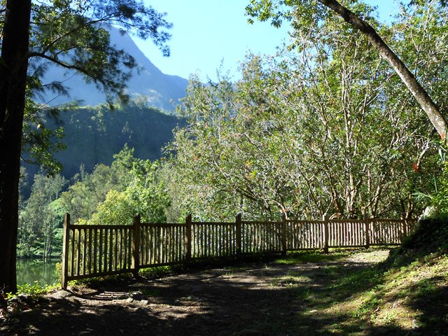 Mare à Citrons, Mare à Martin, Mare à Vielle Place : Quelque chose laisse à penser que la région est humide ! Quand on a aperçu en roulant les dizaines de cascades et qu'on arrive à la Mare à Poule d'Eau on a la confirmation que le Cirque de Salazie regorge effectivement d'eau. Pourtant, l'humidité est plus supportable que celle des forêts humides à moins de 5 Km à Bélouve ou aux Bras des Lianes. L'écrin de verdure entourant la Mare à Poule d'Eau vaut à lui seul le déplacement. Si on y rajoute les magnifiques aires de pique-nique disséminées dans les sous-bois, une ruine curieuse présentant un escalier solitaire, des champs de chouchous à perte de vue, de grosses touffes de bambous, de magnifiques panoramas sur le Gros Morne, la possibilité de pêcher des tilapias ou de contempler des poules d'eau on a alors toutes les raisons d'y aller quelques heures se reposer d'une semaine chargée. Cette très facile randonnée s'adresse particulièrement aux familles qui veulent profiter de beaux paysages, marcher un peu sans fatiguer les marmailles et se reposer autour d'un repas pris sur une table propre et ombragée.