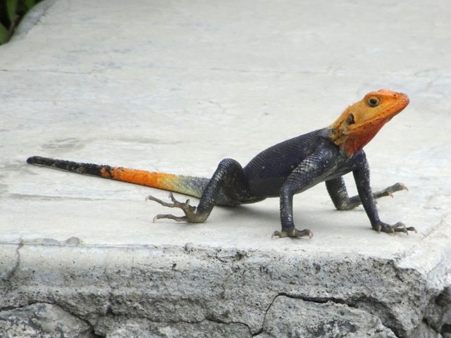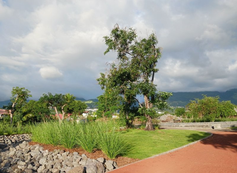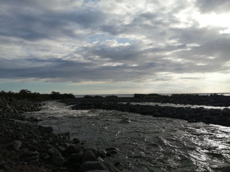 La randonnée débute à la fin du Chemin de la Liberté, départ de la piste vers Deux-Bras et Mafate. De gros galets empêchent le passage des véhicules mais pas des vélos et piétons. La piste est large, totalement plate, bordée d'herbes de toutes parts et de quelques chocas verts et bois noirs (Photo 1). On a l'impression de marcher dans une savane africaine avec en plus le bruit de la circulation (Photo 2). On passera près de cinq murs en béton, destinés à ralentir les crues violentes de la Rivière des Galets en cas de cyclone, avant d'arriver au premier pont (Photo 3). Il est possible de marcher sur les ouvrages lorsqu'on passe à proximité. En face, la falaise donne une idée de la couche d'alluvions transportées par la rivière depuis Mafate en quelques milliers de siècles (Photo 4). Heureusement, il n'y a pas que des herbes sèches sur le bord de la piste ; des lianes corail viennent rajouter une touche de rose à ce jaune ambiant (Photo 5). Juste en face, dépasse la minuscule colline du Piton Défaut qui se fait également grignoter par les crues (Photo 8). La région du Port et de Saint-Paul est très chaude et ensoleillée ; il peut pleuvoir au village de la Rivière des Galets alors qu'on cherche désespérément de l'ombre en longeant la rivière (Photo 9). On rejoint rapidement un grand parking près d'un terrain de sport. Le bruit des voitures sur la voie rapide se fait de plus en plus entendre. Un portail marque le début d'une piste qui descend dans le lit de la rivière. On peut la suivre pour passer sous les deux ponts ou saisir directement le sentier qui part sur la droite et rejoint directement l'autre côté de la nationale. De là, plus aucune difficulté car le chemin, large et caillouteux longe ou se confond avec le sommet de la digue sur près de 3 kilomètres (Photo 11). Il est très difficile de marcher sur un circuit plus rectiligne que celui-ci à La Réunion (Photo 13). Le seul virage de la descente se situe entre les deux ponts lorsque la digue oblique pour mieux canaliser les crues vers la mer (Photo 14). S'il n'y pleut pas, les points de vue sur Dos d'Ane peuvent être agréables (Photo 16). On domine la rivière qui peut être tumultueuse après de fortes pluies (Photo 17). A l'inverse, quand le niveau de l'eau est très bas, on remarque que les cailloux sont blanchis par le soleil et les dépôts séchés. On remarque, dans les tas de cailloux ou les murets qui longent la piste, de gros lézards orange (l'agame des colons) certainement échappés ou relâchés et qui ont réussi à se reproduire dans cette zone. Les chemins et zones sèches alentour sont recouverts d'herbes qui poussent rarement très haut car la sécheresse est souvent de mise dans la région du Port (Photo 21). La seule difficulté, qui n'en est pas une, consiste à rejoindre le lit de la rivière en descendant le barrage de béton qui n'est pas trop glissant et propose de gros galets noyés dans l'ouvrage créant des aspérités et de petites marches. Après avoir dévalé ces 10 mètres, le jeu consiste, sans trop se mouiller les pieds, à trouver le meilleur moyen de rejoindre la plage (Photo 23). La carte ci-dessous propose un circuit marqué de quelques cairns sans doute à l'attention des pêcheurs car la région n'est pas très renommée pour ses randonnées. On arrive à la plage, mi-galets, mi-sable sur laquelle se jettent les eaux qui ont traversé tout Mafate et qui se sont bien calmées. Une partie pénètre doucement dans le sable et les galets (Photo 24) tandis que l'autre coule en petit torrent jusqu'aux vagues (Photo 25). Depuis le large delta, la vue porte jusqu'au Cap de la Marianne (Photo 26). La partie terre-mer est finie quand on peut marcher sur les galets mouillés par le ressac (Photo 27). On peut donc s'asseoir sur un gros galet pour voir passer les voiliers (ou porte conteneurs !) ou attendre le coucher du soleil pour de belles photos s'il y a des nuages (Photo 28). Dans ce cas, il faudra avoir pensé à la lampe frontale pour le retour. On peut donc faire demi-tour par le même itinéraire ou rejoindre rapidement le beau sentier de bord décrit dans la randonnée qui fait le tour de l'Etang Saint-Paul (cette carte) puis rejoindre le cœur de Saint-Paul pour un retour en bus par exemple.