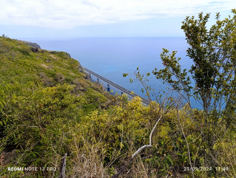 En bien meilleur état que celui de Saint-Gilles, le Moulin Cader de la Montagne (Kader à Saint-Gilles !) présente encore quelques vestiges qui ont tout de même sérieusement souffert des ans et des dégradations. Une partie des ruines est même habitée et il sera difficile de récupérer les bâtiments. Mais ce vieux moulin destiné à broyer les feuilles de chocas pour en faire des ficelles n'est pas le clou de la sortie. En effet, le sentier passe parfois au plus près du rempart des falaises de la Route du Littoral et offre ainsi de beaux panoramas sur l'océan. On aperçoit le viaduc de la Nouvelle Route du Littoral, impressionnant, qui étend son long ruban de béton à une quinzaine de mètres au-dessus de la mer. La circulation y est dense alors que l'ancienne route est désormais abandonnée. Les points de vue sont fréquents depuis le sentier lui-même et il est possible de se rapprocher du bord du rempart par les petites sentes de cordistes. Il faut alors faire attention où placer les pieds car de gros câbles ont été installés au sommet afin de maintenir en place les tonnes d'acier destinées à protéger la route des chutes de pierres. Le sentier, le plus souvent pierreux, est toujours en bon état, parfois large, parfois étroit, jamais dangereux même en haut de falaise. En certaines saisons, les herbes peuvent y être hautes. Il effectue tellement de méandres pour éviter roches et troncs que la trace GPS est plus lissée que le parcours lui-même.
