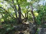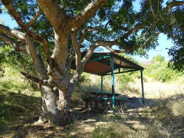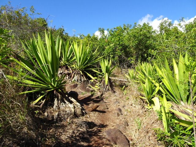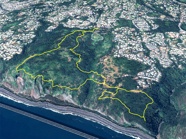 La randonnée débute près de la déchetterie de la Montagne où plusieurs emplacements permettent de stationner. Le dimanche, si le parking est vide c'est qu'il n'y a pas de tirs d'airsoft (Photo 1). S'il est impossible se stationner, partir tout de même mais obliquer à gauche au premier croisement pour éviter la zone de jeu. Le sentier débute par une friche qui peut rebuter sur une dizaine de mètres. Très vite, il devient un classique de la région entre faux poivriers, tournesols mexicains ou envahissantes (Photo 2). Contourner la déchetterie, traverser la discrète Ravine Bailly. Au croisement partir sur la droite. Marcher sur un sentier étroit, envahi de pierres et de fougères jusqu'à une zone couverte de rochers. Plusieurs sentiers partent en tous sens. Prendre à droite celui qui descend en pente douce dans le bois de filaos (Photo 3). La marche est facile dans les chocas jaunes, les fougères, les jeunes filaos et les avocats marrons qui tentent de coloniser l'espace. Après 10 minutes de sous-bois, le sentier parvient à des savanes jaunies où le sentier se suit sans hésitation (Photo 4). Il traverse des zones dénudées ou rocheuses, longe la Ravine Bananiers et se rapproche du rempart sur un sol très caillouteux (Photo 5). On pense bifurquer à gauche pour longer la falaise mais le sentier plonge sans avertissement le long du rempart. Il est étroit, terreux donc glissant (Photo 6). Prendre garde aux racines, aux pierres qui dépassent ou parties sableuses et glissantes car le rempart est assez pentu. On profite des premières vues sur la NRL. Le sentier alterne descentes et montées parfois fortes pour éviter ravines ou précipices. On aperçoit de plus en plus de filets qui protègent la route très fréquentée en-dessous (Photo 7). Les mains s'avèrent parfois utiles pour franchir des raidillons plus sérieux (Photo 8). Le sentier navigue dans le rempart, juste au-dessus des falaises verticales. Il part un peu dans tous les sens en raison des nombreuses aspérités du terrain. Lors de certains contournements de petites ravines, il domine la mer et la NLR qu'on peut admirer depuis quelques rochers servant de belvédère. Les premiers câbles font leur apparition au sol. Les vues vers la Possession sont les plus intéressantes de la boucle. On a sous les yeux la Route du Littoral qui ondule au gré de la falaise et, quelques dizaines de mètres en pleine mer, le long ruban rectiligne de la Nouvelle Route du Littoral (Photo 9). On comprend aisément en regardant l'ouvrage pourquoi l'on parle de facture à 10 chiffres et de plus grand chantier du pays. Pour les meilleures vues, il faut quitter un peu le sentier pour se rapprocher au plus près des filets fixés au bord de la falaise. Attention de ne pas y amener les enfants car il est facile de se prendre les pieds dans les anneaux en acier. Poursuivre sur le sentier qui comporte de plus en plus de ces câbles maintenus par des "clous" de 2 mètres de long, enfoncés dans le sol avec une vingtaine de cm qui dépassent. Même s'ils sont peints en jaune pour mieux les repérer, attention à une chute sur ces pointes qui ne plieraient pas sous le choc (Photo 10). Le sentier file au sud pour mieux franchir la Ravine Bailly. Les lianes papillon sont de plus en plus présentes par endroits et boucheront le sentier rapidement (Photo 11). Les arbres se raréfient et sont remplacés par des savanes herbeuses d'où émergent trois kiosques couverts de tôles rouges, dont une idéalement située sous un grand tamarin (Photo 12). On se voit mal transporter sa glacière depuis le restaurant du départ mais il faut savoir que l'on est tout près de la fin de la route du Moulin Cader. Poursuivre vers l'ouest, franchir une passerelle et marcher jusqu'à la prochaine intersection. En partant tout droit on rejoint Moulin Cader. Sur la droite, les frères Pausé ont aménagé un sentier agréable qui repart en effectuant de grands virages pour se rapprocher du rempart. Le sol est autant encombré de pierres que depuis le départ mais le cheminement s'effectue sans effort. Il se poursuit à plat sous les faux poivriers qui accueillent à un moment une table non abritée (Photo 14). On rencontre ça et là de beaux arbres, principalement des tamarins des bas reconnaissables aux gousses laissées au sol (Photo 13). Le sentier se rapproche de la vallée de la Grande Ravine. Une sente sur la droite permet de profiter, après 10 mètres de marche, d'un dernier point de vue sur la route du Littoral (Photo 15). Tout près, le sentier traverse une des plus grosses touffes de liane carréeCisse à Quatre angles – Cissus Quadrangularis L. Plante succulente grimpante qui ressemble à un fin cactus comportant des segments carrés d'une dizaine de cm. Elle peut facilement atteindre 6 mètres de long. Elle s'agglutine fréquemment dans cette région de l'île. de la Réunion. Elle a envahi toute la zone et un tunnel végétal a été creusé afin de poursuivre la randonnée (Photo 16). Une nouvelle table de pique-nique siège sous un énorme tamarin qui mérite à lui seul une halte (Photo 17). On parvient très vite au belvédère construit à l'époque pour admirer la cascade des Hirondelles. Depuis, la barrière a vieilli et les branches cachent la vue. Une pente légère amène à la DZ bétonnée puis au parking terreux de fin de route de Moulin Cader. Un détour pour visiter le moulin n'a plus guère d'intérêt puisqu'une partie est occupée. A la fin du parking, pénétrer sous le couvert de la végétation, passer devant un panneau annonçant la direction du Moulin Kader (avec un k, contrairement au nom du hameau). Partir à droite sur les cailloux et sous les tamarins (Photo 18). On retrouve très vite la passerelle et les kiosques rouges. Prendre à droite au premier embranchement et entamer une montée sur un terrain de savane bien dégagé qui abritait une piste (Photo 19). Laisser la piste qui se poursuit à droite et partir sur 