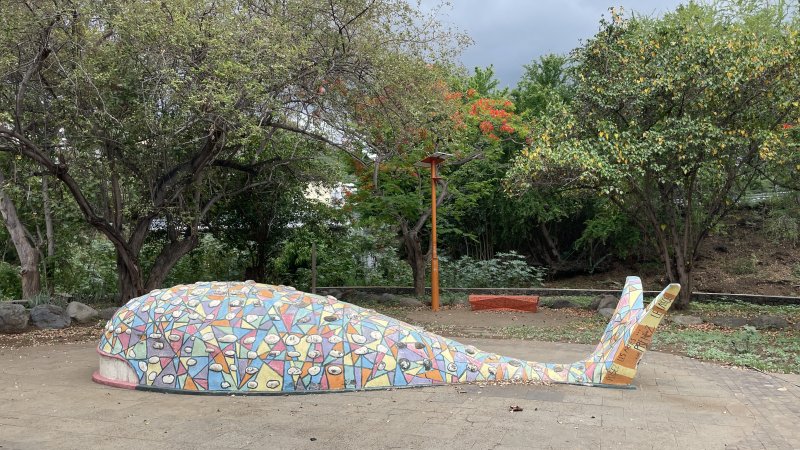 La randonnée débute à l'entrée du Théâtre de Plein Air de Saint-Gilles à partir de la D10. Il vaut mieux stationner le long de la route avant d'emprunter à pied la petite route menant au théâtre. On parvient à une barrière d'où il est facile d'évaluer le chemin à parcourir en repérant Saint-Gilles droit devant (Photo 1). Le panneau situé au départ donne des indications sur les barrages et systèmes de transport de l'eau au XIXème siècle (Photo 2). Avant d'entamer la descente par la large piste empierrée, repérer le sentier partant en direction de la colline. Il est étroit, peu entretenu, mais se suit sans difficulté jusqu'au sommet encombré de roches entourant les installations des antennes (Photo 3). En dominant l'océan de 125 m, on bénéficie depuis les rochers de belles vues sur la région, le théâtre, la Ravine Saint-Gilles ou les vergers (Photo 4). On remarque également le port entouré des habitations blanches de la ville (Photo 5). Rejoindre le point de départ. Il est possible de commencer la descente en allant repérer le kiosque pour le casse-croûte du retour, accessible aux handicapés (Photo 6). Rejoindre alors le circuit principal bordé au début d'une longue barrière en bois (Photo 7). Le chemin, très fréquenté, est large et propre. Il frôle une petite grotte occupée par un "Ti bondié" et se poursuit en descente légère sur un sol de plus en plus caillouteux (Photo 8). Le balisage, parfois un peu effacé, est représenté par des caméléons verts qui ont donné leur nom au sentier (Photo 9). Même tôt le matin, la chaleur peut déjà être importante. On profite de larges panoramas sur la vallée étroite de la Ravine Saint-Gilles (Photo 10). Puis le chemin empierré descend de plus en plus vite sur une forte pente. On le trouve un peu raide au retour mais il est heureusement assez court (Photo 11). On parvient assez vite à de grosses touffes de bambou après avoir franchi une petite passerelle. Avant de poursuivre, on peut partir sur la gauche vers un ancien sentier botanique abandonné. Repérer les quelques panneaux encore en place et continuer ou non vers l'amont de la rivière en suivant un sentier en rive droite. Il passe à un moment dans un ancien canal de transport de l'eau sur un sol très caillouteux. On est très proche de la ravine et de son agréable bruit d'eau courante (Photo 12). Marcher ainsi jusqu'au petit barrage de recueil de l'eau à l'époque où de nombreuses usines sucrières avaient besoin du précieux liquide (Photo 13). Faire demi-tour jusqu'au jardin Bottard en retrouvant les bambous. Il reste des manguiers un peu partout. Des panneaux donnent l'occasion de souffler un peu en lisant les explications ou un poème (Photo 14). Continuer en rejoignant le premier gué constitué de grosses roches pouvant être glissantes après la pluie (Photo 15). On laisse donc le jardin Bottard et ses manguiers poussant à travers les roches pour marcher vers Saint-Gilles (Photo 16). Le petit cours d'eau devient de plus en plus paisible dans les cultures (Photo 17). Les taros et grandes herbes occupent également les berges (Photo 18). On parvient bientôt à un nouveau gué, plus glissant, qui se franchit en quelques secondes (Photo 19). La fin du sentier est toujours aussi facile entre d'anciennes plantations et jardins cachés derrière les haies abritant de vrais caméléons (Photo 20). L'eau stagne presque dans la ravine sur le sol de plus en plus plat (Photo 21). Le pont enjambant la Rue du Général de Gaulle indique la fin proche de la portion sur sentier (Photo 23). Profiter des dernières fleurs rencontrées tout au long du parcours (Photo 24). Les derniers mètres sont bordés de quelques panneaux (Photo 25) avant de remonter vers une aire de repos comportant quelques bancs. Au centre, une grosse baleine bigarrée accueille chaque jour des dizaines d'enfants grimpant sur son dos (Photo 26). Il est possible à cet endroit de faire demi-tour et revenir en direction du théâtre. Si l'on souhaite visiter Saint-Gilles, se diriger vers le port par des allées bordant la berge ou par les routes pour atteindre les ilots que l'on rejoint par des ponts et des escaliers (Photo 27). A la saison, les bateaux chargés de touristes ou de plongeurs partent en direction des baleines ou dauphins nageant au large. Si la chaleur n'est pas trop forte, flâner dans les rues de la petite ville balnéaire et rejoindre par exemple la case Chez Loulou pour y déguster une de leurs spécialités (Photo 28). Il est possible de poursuivre la visite vers la Vierge à une centaine de mètres de là. Le retour emprunte le même itinéraire, un peu plus difficile en raison de la pente sur les marches en pierre.