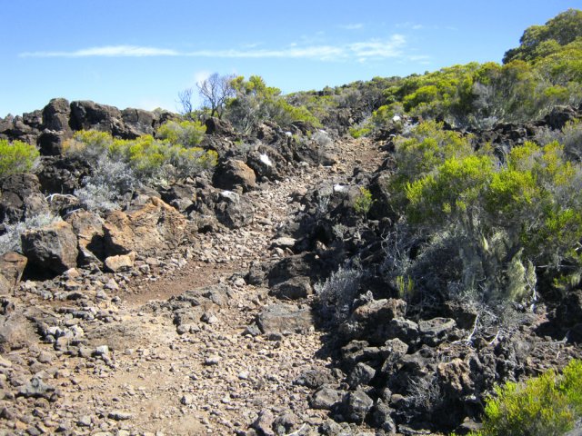 La randonnée débute à la Route Forestière des Tamarins par un sentier pentu dans les herbes, bordé de panneaux rappelant la vie des esclaves marrons en évoquant la présence du Roi Phaonce (Photo 1). Il traverse une plantation de tamarins et monte en pente assez forte mais régulière à travers les acacias noirs et branles verts. Le sentier partant sur la gauche en direction de la Ravine de la Chaloupe est de plus en plus difficile à repérer. En se retournant, on peut profiter de larges vues sur la pente boisée et même jusqu'à l'océan en direction de Saint-Gilles et du lagon (Photo 2). Plus haut, le sentier coupe la ligne déboisée des 1800. La végétation a repris possession des lieux après les incendies du siècle précédent mais quelques pieds de branles et tamarins, squelettiques, dépassent encore des fougères et des nombreuses roches qui dépassent (Photo 3). Le sentier se couvre parfois de cailloux, devient étroit ou plat, se partage en deux parties avant de se reformer, longe des parties rocheuses ou permet par moments de beaux points de vue vers le lagon de l'Ermitage. Certaines roches créent de belles natures mortes dans ce paysage verdoyant (Photo 4). Plus on monte et plus les panoramas s'élargissent en direction du Grand Bénare (Photo 5). Le sentier frôle les premières centaines de mètres de la ravine de la Chaloupe qui a pris sa source au pied du Piton Rouge (Photo 6). Quelques raidillons un peu plus techniques amènent doucement au pied du Piton Rouge en marchant sur de bonnes couches de petites et grosses pierres (Photo 7). Tenter un écart pour visiter la Caverne du Piton Rouge en s'aidant de la carte car elle est peu visible à partir du sentier (Photo 8). Un panneau indiquait correctement le petit sentier qui permettait de s'en approcher sans hésitation mais il n'a pas résisté au temps. Toujours dans les parages, impossible de manquer le dyke surmonté de sa croix qui a poussé au milieu de rochers éparpillés au pied du piton (Photo 9). Attention, le fait qu'on y trouve une croix n'indique pas pour autant qu'on peut y monter facilement. Un endroit dénudé servant d'aire de pique-nique aux courageux qui pourraient monter ici avec une glacière est aménagée au pied. Une autre aire comportant des cercles de pierres ne peut se manquer avant l'ascension (Photo 10). Le sentier qui permet d'atteindre le sommet du Piton Rouge est court, glissant mais aisé (Photo 11). Du sommet, on a un superbe panorama sur toute la région et on peut imaginer les guetteurs du Roi Phaonce qui attendaient et voyaient arriver de loin les chasseurs d'esclaves. Quelques sculptures de Gilbert Clain ont été érigées en hommage à ces "évadés" qui tentaient de vivre dans cette région froide et désertique (Photo 12). Elles ne sont pas érigées au sommet mais elles sont tout de même faciles à dénicher en suivant les petits sentiers qui s'en approchent. Avant de continuer en direction de la Glacière, effectuer une incursion vers le sud-est (non prévu sur la carte ci-dessous) afin de rejoindre la Grotte du Roi Phaonce (Photo 13). On emprunte, comme partout ici, un sentier assez large et recouvert de cailloux de lave. Il est assez plat jusqu'à la grotte où vivait le Roi Phaonce (mais beaucoup de légendes ont circulé sur sa vie et peut-être ne s'y est-il même pas assis à l'ombre !). Une cavité plus importante se visite également au plus près du Petit Bénare. Le tas de cailloux à côté peut faire penser à une tombe et la grotte semble bien petite pour abriter des intempéries fréquentes à cette altitude (Photo 14). Réserver la visite au Petit Bénare pour une autre randonnée puis faire demi-tour par le même itinéraire jusqu'au sentier de la Glacière. Le sentier est toujours aussi caillouteux mais beaucoup plus plat dans une végétation de plus en plus rabougrie en raison du climat à cette altitude (Photo 15). On coupe une bonne dizaine de jeunes ravines dont l'imposant cassé de la Ravine des Colimaçons. Plus loin, on franchit le gué à sec du Bras Sud de la Grande Ravine qui offre, 200 mètres en amont de magnifiques falaises et bassins qui se visitent sans danger. Comme les pentes sont faibles et le sentier large, on atteint rapidement un premier puits de stockage de 5 ou 6 mètres de profondeur. Fait de pierres sèches, il servait de stockage de la glace recouverte de sciure de bois pour la conserver plus longtemps. Le sentier comporte quelques parties rocheuses un peu plus techniques (Photo 16). La marche reprend pour trouver un croisement qui part à gauche vers la Route des Tamarins et à droite vers la Glacière. L'aller-retour est très rapide mais incontournable. Ne pas manquer, dans les alentours, les nombreuses cavités qui retiennent l'eau (Photo 18 et 19). La Glacière est une curiosité (Photo 20). On imagine facilement la taille de la grotte naturelle avant son aménagement, son creusement et sa fermeture par des murailles pour garder la fraîcheur nécessaire à la conservation de la glace (Photo 21). Plusieurs panneaux permettent d'en savoir plus sur l'exploitation de cette denrée prisée des riches au 19ème siècle. La simple idée de récolter de la glace à cette altitude doit faire prendre conscience que le climat de l'hiver austral peut descendre à des températures relativement basses et inciter a bien se vêtir. Une période très froide au 19ème siècle justifiait plus qu'à notre époque cette envie de glaçons. Héla, le lieu, très visité depuis le Maïdo par un itinéraire facile sur piste, est un véritable dépotoir doublé de toilettes publiques !! Le sentier de retour, celui du Grand Bénare, ressemble comme un frère au précédent emprunté dans la montée (Photo 22). La végétation est presque identique ainsi que la pente qu'on effectue toujours en descente. Un autre puits très proche de la Grande Ravine comporte les mêmes caractéristiques que le premier (Photo 23). Le sentier traverse des zone