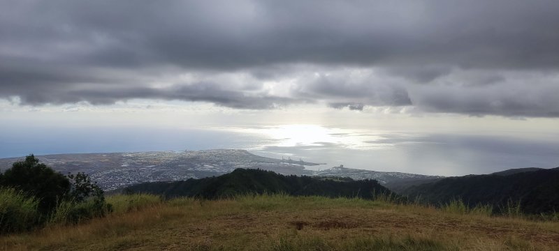 La randonnée débute, comme souvent, à l'église de la Rivière des Galets dont les alentours proposent plusieurs places de stationnement. En passant près de l'usine d'embouteillage, rejoindre la Rue de Mafate, pleine d'ornières et de petits dos d'ânes. Passer un parc canin et quelques cases avant de filer vers la Rivière des Galets qu'on retrouve au premier gué et à la piste empruntée par les taxis mafatais. Repérer, parallèle à la rivière, le sentier qui débute sous les poivriers, passe près d'une réserve d'eau entourée de grillage, longe une ravine profonde qui débute par un tunnel de lave et franchit une tuyauterie. Après le tuyau, le sentier caillouteux monte fortement en quelques lacets vers le haut de la colline (Photo 1), puis dans des herbes (Photo 3). Il descend ensuite sur un sol caillouteux, remonte encore plus rudement vers un des anciens pylônes en pierre qui soutenait le câble blindé (Photo 6). Il traversait jadis la rivière pour alimenter le port en électricité depuis la 1ère usine hydroélectrique installée sur l'ancien canal Lemarchand du côté de l'ilet Savannah. Puis il longe le rempart pour des vues magnifiques sur la Rivière des Remparts et l'entrée de Mafate avant d'arriver à la Rue de la Roche Glisse (Photo 5). Une échelle bleu clair attire le regard avant d'arriver à la rue (Photo 7). C'est là que se trouve une petite grotte abritant quelques vierges. Bifurquer sur la droite et remonter la rue jusqu'au terrain de football sur la droite. Longer le terrain et repérer le sentier qui débute en face de la cage de but (Photo 8). Il est de plus en plus court car les constructions poussent ici comme des champignons. Un peu plus haut, il finit à une route. A partir de là, suivre les flèches peintes au sol pour rejoindre un long escalier bordé de nombreuses plantations (Photo 9). Le reste de la montée alterne portions de routes, larges sentiers aménagés parfois en escaliers (Photo 10) ou en frôlant quelques lopins qui seront vite vendus aux promoteurs (Photo 11). Au croisement de plusieurs routes, prendre à gauche et repérer les premières pancartes "Sentier de Bord" (Photo 13) qui seront très utiles par la suite pour repérer les diverses et nombreuses bifurcations. Le sentier monte à travers les lianes papillon de plus en plus nombreuses qui ne tarderont pas, avec le temps, à le boucher. Des bambous bordent le nouveau sentier rectiligne qui longe des propriétés (Photo 14). Il devient à nouveau caillouteux avec de hautes marches (Photo 15). A la prochaine route, bifurquer sur la gauche, marcher jusqu'au croisement, prendre la route de droite, longer les cannes à sucre et obliquer dans le champ à un virage de la route sur un sentier qui traverse la plantation. Après une zone de poivriers et fougères, on rencontre une case en tôle sur la droite du sentier. Profiter du point de vue sur la vallée de la Rivière des Galets (Photo 16) et poursuivre en direction de l'oratoire (Photo 17) en longeant à nouveau des cannes (Photo 18). Prendre à droite à l'oratoire et poursuivre en direction de Dos d’Âne sur un sentier de plus en plus agréable en pente douce qui se rapproche du Ranch (Photo 19). Les chevaux éparpillés sur une terre inculte semblent tristes et n'hésitent pas à s'approcher de la clôture. C'est à ce moment qu'ils apprécient les marcheurs qui leur tendent quelques herbes cueillies auparavant. Il faut dire aussi que le contraste est saisissant entre les hautes herbes du chemin et le désert de l'enclos. Les galaberts et les fougères l'emportent dans une région en friche comportant ça et là des signes de quelques cultures anciennes (Photo 20). On rencontre une première bifurcation sur la gauche partant vers le Chemin Ratinaud (Photo 22). A un oratoire, une nouvelle bifurcation vers la gauche rejoint la route de Dos d’Âne. A la troisième en Y un peu plus loin, prendre à droite pour rejoindre le village et longer la paroi rocheuse en profitant de quelques points de vue sur la Rivière des Galets (Photo 23). De l'autre côté de la large vallée de la Rivière des Galets, on remarque le rempart de Sans Souci puis la coupure très visible de la Canalisation des Orangers (Photo 26). Le sentier se transforme en piste puis en route aux premières cases (Photo 27). On peut poursuivre entre les cases sur la piste bétonnée jusqu'à l'église du village avant de continuer vers une autre direction (Lataniers, Cap Noir, Roche Écrite ou Deux Bras) ou tout simplement reprendre le chemin inverse vers la Rivière des Galets. Dans ce cas, et pour varier les paysages, prendre alors à droite vers le lieu de décollage des parapentes aux alentours du sentier qui entre dans Mafate pour bénéficier de belles vues sur la Ravine à Marquet et sur le Port.