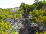 La randonnée débute sur la Route Forestière des Tamarins, près du départ du sentier du Piton Rouge. Ce sentier, très fréquenté, est le plus souvent caillouteux sur une pente moyenne mais régulière jusqu'au Piton Rouge. Il débute par une forte pente après avoir lu les panneaux sur le Roi Phaonce (Photo 1). Il se poursuit dans les acacias noirs sur ce qui fut une large piste rectiligne. A partir de la Ligne des 1800, la pente devient beaucoup plus calme avec même des portions plates pour franchir des ravines jamais en eau (Photo 2). Marcher jusqu'au petit cairn situé à l'altitude 2000 sur la droite du sentier. Comme souvent, les cairns disparaissent ou grossissent en fonction de l'humeur des randonneurs. Si le cairn est invisible, bien repérer sur la carte l'altitude de 2000 m. On bifurque alors à droite sur un petit sentier peu marqué dans les herbes (Photo 3). On retrouve très vite de belles portions faciles à suivre à travers les branles verts (Photo 4). Parfois, dans les zones couvertes d'herbe ou de fougères, les traces de passages sont plus discrètes mais les cairns rassurent sur la direction (Photo 5). Le chemin alterne donc multiples passages faciles ou moins aisés mais souvent indiqués par les petits tas de pierres. Après 500m à marcher plein sud, commencer à bifurquer vers l'est pour entamer un tour du piton qu'on distingue très bien sur la gauche. La trace contourne ou traverse des ravines et arrive au col entouré de brandes ou de quelques zones dénudées où la marche est beaucoup plus facile. On peut atteindre le sommet, très proche, également sans effort en passant n'importe où car il y a sur les flancs de nombreuses zones dégagées. Du sommet, on a de larges vues sur l'océan et sur les pentes du Maïdo (Photo 6). Une fois redescendu par le même itinéraire, repartir vers le nord puis contourner le piton en rencontrant de belles zones dégagées où la marche est une véritable balade (Photo 7). Le retour au sentier du Piton Rouge peut s'effectuer par le même itinéraire ou passer n'importe où dans les brandes à condition de viser vers le nord afin de ne pas trop s'éloigner du sentier du Piton Rouge. Le franchissement de la Ravine de la Fontaine s'effectue sans difficulté même si les passages sont moins instinctifs (Photo 8). Une nouvelle trace se remarque sur la droite alors que l'on est sur le sentier pris à l'aller. L'emprunter sans hésiter car il est très facile à suivre (Photo 9). Retrouver le sentier officiel du Piton Rouge et entamer la montée, à travers les brandes et les hautes herbes, ponctuée d'arbres incendiés mais encore debout (Photo 10). La montée sur le sentier officiel peut reprendre. La pente est plus forte par endroits. Le sol est tantôt recouvert de nombreux cailloux qui font souffrir les chevilles, tantôt creusé (Photo 11). Le Piton Rouge, qu'on avait en point de mire depuis le début, grossit de plus en plus (Photo 12). Ne pas manquer l'écart de quelques mètres pour atteindre la Caverne du Piton Rouge assez dissimulée dans la végétation sur la droite du sentier. Poursuivre sur les cailloux en direction du dyke situé au col du Piton Rouge (Photo 13). Délaisser plusieurs sentiers partant à gauche à l'assaut du piton. Après avoir rejoint le dyke et sa croix (Photo 14), entamer la montée au piton sur une trace assez rectiligne. Ces 15 minutes à rajouter à cette boucle permettent de profiter d'un panorama à 360° sur toute la région et repérer le parcours effectué ou à venir. Il donne également la possibilité de s'approcher des sculptures de Gilbert Clain sur la pointe ouest du piton. Une fois de retour au pied du Piton Rouge, ne pas poursuivre vers la Caverne du Roi Phaonce et le Bénare mais partir plein nord vers la ravine des Colimaçons (Photo 16). Arrivé au ravin, partir sur la gauche en longeant le bord ou à proximité en guettant les cairns qui rassurent (Photo 17). La descente de la ravine encaissée donne lieu à de multiples arrêts pour admirer les anfractuosités, les étroits canyons ou les bassins d'eau sombre (Photo 18). Le canyon, qu'il soit étroit ou large est toujours difficile d'accès sans matériel d'escalade (Photo 19). En s'approchant prudemment du bord, on se retrouve près d'un cassé important qui peut accueillir de belles cascades par temps de pluie (Photo 20). Sur la berge où poussent de petits branles verts, le sentier qui n'en est pas un, est facile à suivre à moins de tout simplement longer le bord du ravin au plus près (Photo 21). En suivant les cairns on est assuré de marcher toujours sur un sol propre comportant un minimum de végétation (Photo 22). En fin de parcours, les fougères s'intensifient au moment où il faut rejoindre une ravine herbeuse en les traversant sur une forte pente (Photo 23). Cette petite dépression, facile à suivre, permet un beau point de vue sur le dernier cassé important de la boucle (Photo 24). Depuis un km, on remarque au fond de la ravine des tuyaux destinés à recueillir l'eau des bassins situés en amont. On retrouve un de ces tuyaux longeant le ravin et le sentier (Photo 25). On devine la Route Forestière des Tamarins un peu plus bas. Le sentier est alors de plus en plus visible à travers acacias et fleurs jaunes (Photo 26). Il oblique légèrement vers la gauche, s'éloigne de la Ravine des Colimaçons et traverse une prairie naturelle où le cheminement est plus discret (Photo 27). La dernière descente sur piste se termine à la route bétonnée à quelques mètres du départ du sentier des Colimaçons. C'en est fini des branles, des cairns, des magnifiques canyons et le retour emprunte près de 4 km de la Route Forestière des Tamarins. Le transit pourtant obligatoire est facile. Il offre de beaux points de vue sur la côte et traverse de belles zones de verdure ponctuées de tamarins des hauts (Photo 28).