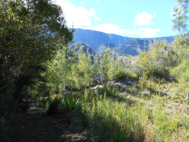 on ne sait désormais plus comment s'en débarrasser. Ce conifère, rare à la Réunion a également souffert des cyclones. Le sentier continue en corniche avec à droite la Ravine Dijoux et à gauche le Bras Rouge. Le sentier passe parfois au plus près du précipice (Photo 28). Un tuyau de transport d'eau puis une source sur la gauche annoncent la proximité du carrefour vers la Chapelle qu'on laisse sur la gauche. Le reste du circuit s'effectue sur le trajet emprunté le matin.