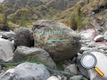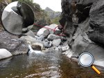 En cours de descente, la rivière est barrée par de gros rochers qui peuvent intimider. Repérer en rive gauche deux rochers blancs. C'est derrière celui le plus à gauche qu'une corde est fixée et aidera à la descente. Elle se voit très bien quand on a franchi l'obstacle (cette photo) alors qu'il faut la chercher depuis le haut.