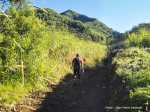La randonnée débute réellement à 900 m d'altitude mais les difficultés de stationnement imposent de se garer plus bas ou venir en bus. L'astuce consiste à chercher un emplacement à partir du Tapage et de se mettre le long de la route lorsqu'on trouve une place. L'intérêt de stationner plus bas permet de mieux connaître le village du Tapage et celui de la Ligne Chevalier. Après ce kilomètre de goudron entre cases et jardins fleuris, on emprunte une piste de terre bordée de hautes cannes fourragères (photo 1). On repère la Butte Fougères qu'on rejoindra en une demi-heure. La piste se rétrécit et se transforme graduellement en sentier où les hautes herbes ont tendance à le boucher graduellement, heureusement pour une courte distance. Le kiosque, encore marqué sur la carte, a totalement disparu dans la vigne marronne. La grimpée est très agréable, jamais difficile malgré de nombreux lacets (Photo 2) et permet de plus en plus de points de vue sur la vallée du Bras de Cilaos, le Dimitile ou le village du Petit Serré encore à l'ombre pour plus d'une heure (photo 3). Certains passages dans la terre rouge friable peut occasionner des glissades sans danger (Photo 4). La végétation est assez pauvre entre fougères, branles ou chocas (Photo 5). En se retournant, on se régale également des vues sur le Tapage ou la côte vers Saint-Louis et Saint-Pierre (photo 6). Le sentier passe parfois assez près du vide mais la végétation sécurise (Photo 7). Au sommet, un oratoire marque la fin de l'ascension (photo 8). Le sentier est toujours aussi correct à travers les bois de couleurs, branles verts et fougères (photo 9). La descente s'effectue agréablement en longeant parfois des barres rocheuses (Photo 10). Les panoramas sur Cilaos se multiplient et l'on distingue très bien toute la région du Pavillon et la route très sinueuse entourant le Bras de Cilaos (Photo 11). Il descend doucement vers une grande forêt de cryptomerias qu'on aperçoit devant en direction du Piton Cabris (Photo 12). Tout le flanc du piton est recouvert de ce conifère, tout comme du côté de la Fenêtre et du Mapou qu'on distingue très bien (Photo 13). La forêt arrive très vite. Prendre à droite et laisser le sentier de gauche qu'on retrouvera en fin de boucle. Les arbres sont déjà très nombreux et on a parfois l'impression que la nuit tombe (Photo 14). Les racines apparentes peuvent créer des difficultés par temps humide (photo 15). Chaque randonneur tente de marcher là où il y a le moins de racines et ces centaines de passages ont créé parfois un sentier de plusieurs mètres de largeur. De racine en racine, on arrive enfin à une zone sans cryptomerias et le sentier passe à deux mètres d'un kiosque situé au sommet du piton (Photo 16). La descente débute sans transition après la halte casse croûte au kiosque. De hautes marches imposent de faire un peu attention même si les abords dangereux sont sécurisés par des câbles ou des rambardes (Photo 17). Les panoramas sur l'ensemble du cirque de Cilaos durant la descente sont extraordinaires (photo 18). On a devant les yeux 180 degrés du cirque et on distingue à la fois le Grand Bénare, le Dimitile, tous les îlets du Cirque et la ville de Cilaos (Photo 19). La remontée à la Fenêtre est courte, pentue et comporte beaucoup de lacets terreux, sous forme de marches ou de roches (photo 20). On passe deux paliers constitués de courts lacets abrupts. On peut y faire une seconde halte afin d'admirer une dernière fois ce magnifique cirque. Un nouvel oratoire situé dans une petite grotte bordant le sentier annonce la fin proche de la montée à la Fenêtre (Photo 21). L'arrivée à la Fenêtre passe par un grand belvédère très visité, situé à la fin de l'interminable route forestière venant des Makes et portant le nom de Rue Montplaisir (Vu la pente, ne pas confondre avec mon plaisir !). Prendre à droite la première piste dans les très hauts cryptomerias et entreprendre le début de la montée vers le Grand Bénare. Bifurquer à gauche au premier croisement sur une belle piste herbeuse bordée d'arums (photo 23). Ce sentier se termine dans un virage de la RF proche d'un réservoir d'eau. On a retrouvé pour un temps un vieux bois de cryptomerias pour une marche facile (Photo 24). Prendre à droite le sentier parallèle au Bras Mapou puis, un peu plus loin, descendre à travers les pentes de Fleurs Jaunes sur un sentier parfois technique, un peu glissant et comportant quelques lacets (Photo 25). Dans des trouées de la végétation, on peut admirer la belle région des Makes, de Montplaisir, de la Chaine du Bois de Nèfles (photo 26). On rattrape la RF 58 qu'on emprunte à gauche sur une courte distance. Très vite, on trouve le croisement avec la RF 11 des Makes près d'une zone de loisirs "acrobranche". Il est possible de partir à droite en longeant la route. Préférer un retour par la gauche. Marcher en direction de la Fenêtre et trouver, dans le premier lacet vers la gauche, le sentier de raccourci qui descend vers le Bras Patates. Il comporte de multiples sentiers créés par les vététistes et se termine à l'aire de pique-nique fleurie (Photo 27). Emprunter aussitôt le sentier du Bras Patates bien indiqué par un panneau. Plusieurs possibilités de rejoindre le sentier officiel ont été aménagées par l'association. A noter les efforts d'aménagement du départ du sentier de Bras Patates qui, sur plus de 200 m, est fleuri de la route jusqu'au bas du talweg. Descendre et franchir la ravine puis prendre à droite pour remonter en direction de la Plaine du Bois de Nèfles sur un sentier d'abord herbeux puis terreux et en lacets jusqu'au croisement (Photo 28). Au premier croisement, bifurquer à gauche pour retrouver la forêt de cryptomerias laissée en début de boucle. Après avoir retrouvé le sentier remontant au Piton Cabris dans la nuit du sous-bois, la fin du parcours emprunte le même itinéraire jusq
