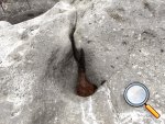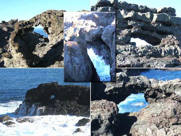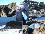 Ce souffleur, situé trop loin de la bordure océane, recoit la vague qui emprisonne l'air dans une cavité intérieure. L'air comprimé sort alors par ce minuscule trou en émétant un bruit de canon qui peut surprendre lorsqu'on est en train de rêvasser en regardant l'horizon. Pour le trouver, repérer la grande arche (photo en haut à droite de l'image précédente) et attendre sagement à 15 mètres au Nord que le son puissant attire l'oreille avant l'oeil. La cavité mesure une quarantaine de centimètres.