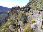 La randonnée débute au parking du Pas de Bellecombe ou au gîte du Volcan, un peu plus en aval. Profiter des premiers panoramas depuis le long belvédère proche du parking (Photo 1). De l'autre côté, le Piton des Neiges dépasse des remparts entourant le Fond de la Rivière de l'Est (Photo 2). Pas de difficulté jusqu'à la porte métallique qui interdit l'accès à l'enclos en périodes éruptives malgré les nombreux cailloux qui roulent sous le pied. La descente jusqu'au Formica Leo est courte et sans danger en donnant l'occasion de beaux panoramas sur l'enclos, le Formica Leo et la face Ouest de la Fournaise (Photo 4). Quelques lacets à hautes marches (Photo 3), très bien protégés du vide, permettent d'atteindre le pied du rempart en moins de 15 minutes. Un sentier part sur la gauche en direction du Kapor. Un autre, un peu plus loin, contourne le Formica Leo par la droite et se dirige vers le point de vue des cratères Rivals. La majorité du flot de randonneurs se dirige vers le Piton de la Fournaise, droit devant (Photo 6). Rares sont ceux qui partent sans effectuer la courte escalade du Formica Leo, ce "monticule" datant de 1753 et qui s'use inexorablement à force de passages. Peut-être un jour faudra-t-il en interdire l'accès pour le conserver en état. Ou peut-être finira-t-il comme la Chapelle de Rosemont en juillet 2018, d'abord entouré par les laves avant d'être submergé. Le cheminement sur la lave est très facile malgré quelques creux et bosses sans danger (Photo 8). On pourrait sans doute marcher n'importe où mais il est conseillé de suivre les multitudes de points blancs régulièrement peints au sol. Ils s'avèrent très utiles en cas de brouillard. Très rares sont les plantes qui tentent de survivre dans ce milieu hostile (Photo 9). A mi-parcours entre les deux pentes, on distingue la dernière coulée qui a laissé une longue couche de gratons gris et noirs (Photo 12). Le sentier, recouvert par ces gratons a été dévié sur la droite afin de les éviter. On parvient, toujours aussi facilement à un croisement de sentiers. A droite, un passage pour rejoindre le sentier vers les Cratères Rivals, à gauche vers le Dolomieu. Une pente plus accentuée débute à ce croisement et ne comportera que quelques rares portions plates jusqu'au sommet. La pente n'est jamais très forte et convient à tous. On longe toutes sortes de coulées qui se sont échelonnées sur des décennies (Photo 17). Les laves sont très différentes, passant des gratons acérés et fragiles aux laves cordées ou aux puits insondables dans lesquels il ne vaut mieux pas glisser (Photo 23). On profite sur la gauche des points de vue plongeants sur les Grandes Pentes, les nombreux petits cratères des dernières éruptions, le rempart du Piton de Partage jusqu'au nez Coupé de Sainte-Rose (Photo 20). On distingue même les vagues de l'océan sur la côte vers Bois Blanc ou Sainte-Rose. Après une bonne heure de grimpette suivie d'une petite descente (Photo 26) et d'une nouvelle montée, on arrive au bord du gouffre et on essaye de s'imaginer qu'en 2006 la lave avait presque atteint le bord du Dolomieu (Photo 27). Ce sont près de 50 millions de m3, d'une surface de 1000 m sur 700 m qui sont descendus 300 m plus bas, comblant le vide laissé par les laves évacuées. On remarque les failles en bordure de rempart qui dissuadent d'escalader les roches pour des photos ou selfies. Le retour utilise le même itinéraire le long des tâches de peinture blanche. La remontée au Parking représente pour certains la principale difficulté de la journée mais dure moins de 20 minutes. Il suffit de prendre son temps, quitte à s'arrêter toutes les 20 marches. Les panoramas sur l'enclos et le Formica Leo servent d'excuse.