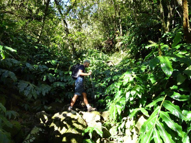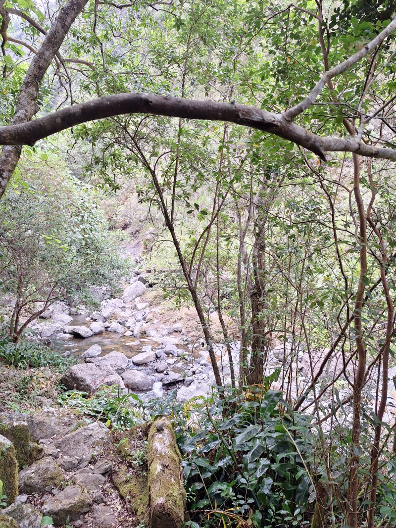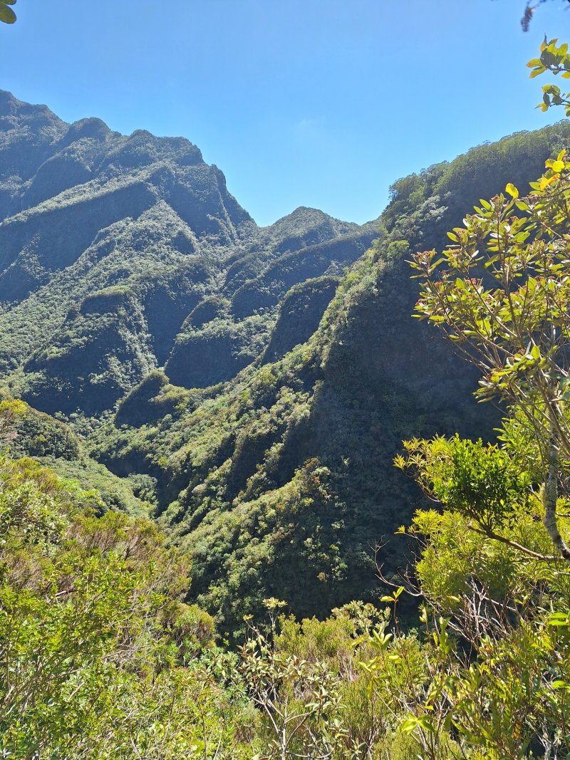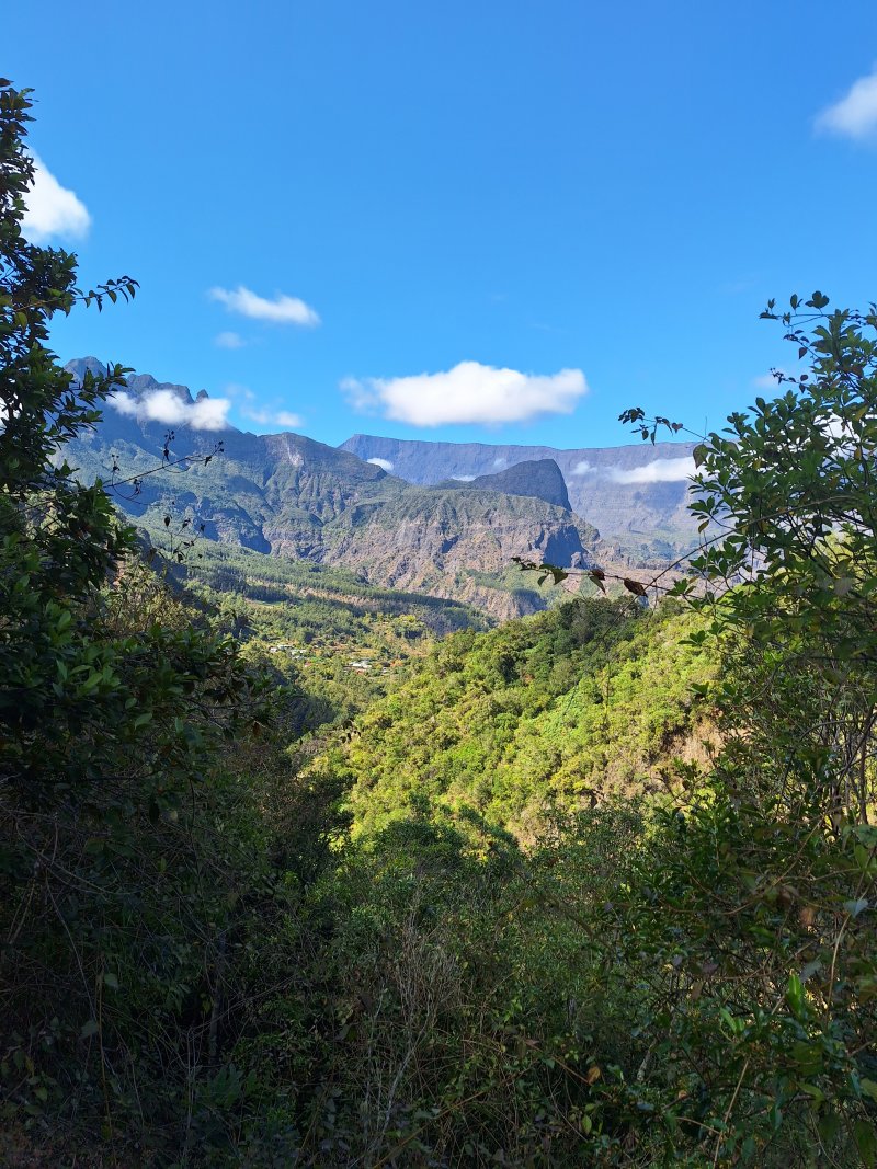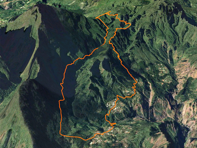 La randonnée débute au parking du sentier Augustave car il est plus agréable de retrouver le véhicule à la fin de la boucle plutôt que d'emprunter la route pour le rejoindre alors que la fatigue commence à se faire sentir. Au petit matin, cette portion de route de 1000 m est éclairée par les premiers rayons qui rendent le parcours fort agréable en profitant des points de vue sur le Cirque de Salazie ou le Gros Morne (Photo 1). Après un lacet serré, le sentier Scout débute sur la droite près d'un panneau (Photo 2). Il est toujours agréable et facile dans une végétation constituée de bois de couleurs, fougères arborescentes et branles (Photo 3). Rien à voir avec le début du sentier Augustave totalement envahi de longoses. Le sentier ondule au gré du relief pour éviter cinq ravines dont le Bras Bémale qui se retrouve rapidement en eau lors des grosses averses. Il faut près de 30 minutes à longer ce sentier sécurisé par endroits et passer les gués rocheux pour parvenir au pied du long escalier qui remonte à Deux Fesses (Photo 4). Il peut impressionner mais il est large et sécurisé d'une longue main courante. Le passage de deux Fesses s'effectue sur une arête étroite dominée par l'imposant Morne de Fourche (Photo 5). On bénéficie alors des premiers points de vue vers Aurère et le Piton Cabris et attention au vide sur la gauche si l'on veut apercevoir le fond du canyon de la Grande Ravine. Le sentier rejoint rapidement le plateau de la Sale, une portion assez plate, donc boueuse parfois, ou encombrée de racines (Photo 6). Un oratoire sur la droite se situe au début d'un sentier abrupt descendant vers la Ravine Savon. Poursuivre dans l'agréable sous-bois jusqu'au rein qui débute la longue descente vers l'Îlet à Malheur (Photo 7). L'arête est plus étroite qu'à Deux Fesses mais l'endroit est totalement recouvert de végétation, dont de grands filaos. Les panoramas sur le Piton Cabris sont grandioses (Photo 8). Les filaos cessent pour un temps et le sentier descend de plus en plus dans les bois de couleurs, branles et goyaviers (Photo 9). Le parcours est parfois technique sur les nombreux lacets, très hautes marches en pierre ou racines en travers. Il faut près de 45 minutes pour atteindre enfin le captage Grimaud, fin des plus grosses difficultés. A partir du réservoir, vide depuis très longtemps, la descente s'effectue principalement entre de gros filaos sur un sentier de qualité couvert d'aiguilles (Photo 10). Cette belle forêt est de plus en plus envahie de longoses, bringeliers et surtout galaberts. La pente est moyenne et l'on arrive rapidement aux premières cultures de 'Îlet à Malheur les Hauts (Photo 11). Le terrain s'assagit aux alentours du sentier partant sur la gauche, sous les filaos, en direction de Grand Place. Le sentier domine un peu l'îlet à Malheur et l'on profite ainsi de beaux points de vue sur les habitations ou le Piton Cabris (Photo 12). Ne pas hésiter à effectuer un petit détour vers le cimetière ou un arrêt à l'épicerie proche de l'église et de l'école. Le paisible îlet est calme, fleuri, donnant immédiatement envie d'y revenir passer une nuit (Photo 13). Une forte descente caillouteuse traverse la Ravine Carreau Chouchou qui mérite bien son nom tant cette liane occupe tout le terrain. Une halte s'impose sur la passerelle dominant l'impressionnant canyon du Bras Bémale (Photo 14) avant d'entamer l'assez raide montée vers Aurère. Elle débute sous les filaos par de nombreuses marches avant de se poursuivre sur un sentier très caillouteux dans les chouchous (Photo 15). Comme le premier îlet, Aurère est un très agréable village à 900 m d'altitude, desservi par plusieurs sentiers plus ou moins fréquentés. Près de l'école et du grand réservoir, prendre à droite, marcher plein nord en profitant des magnifiques panoramas sur la Vallée du Bras Bémale (Photo 16). Prendre la direction du bois de filaos qui domine l'îlet et le traverser sans aucune difficulté (Photo 17). Le sentier débouche sur le Petit Rein, à la fin des filaos (Photo 18). Prendre tout son temps pour traverser ce nouveau rein un peu étroit, surtout sableux et glissant (Photo 19). Profiter du paysage à gauche vers la vallée du Bras des Merles et à droite sur celle du Bras Bémale qu'on va bientôt longer. Le sentier oblique à angle droit et longera pour longtemps le flanc de la Crête de la Marianne en suivant une canalisation. Il est presque plat, pas très large, souvent sécurisé quand il est en corniche (Photo 20). C'est une agréable balade reposante permettant de souffler de la montée à Aurère (Photo 21). Le sentier effectue une boucle du côté de la Source Oiseaux, juste en face du Piton Bémale (Photo 22). Le sentier, toujours aussi étroit et en corniche, bien sécurisé le long des barres rocheuses, frôle des ouvrages bétonnés puis parvient à la passerelle sur la ravine de la Marianne. Les barres rocheuses se multiplient puis on arrive à un premier balcon très bien aménagé pour éviter un passage assez vertical (Photo 23). Le bois est touffu, le sentier encombré de gros rochers et d'arbres magnifiques. Après quelques dents de scie, on parvient, 10 minutes après le premier balcon, en vue du clou de la remontée vers Bord Martin (Photo 24). Nouveau balcon mais comportant cette fois une rude ascension afin de franchir la haute falaise (Photo 25). L'ouvrage, de bonne facture, bien protégé du vide par des rambardes qui diminuent l'impression de vertige, se franchit aisément en admirant toute la vallée du Bras Bémale en aval. Le plus difficile reste à faire. La montée débute vraiment en longeant toujours le petit tuyau (Photo 26). La grimpée traversera à plusieurs reprises le Bras Bémale (Photo 27), franchira de longs pierriers, passera près de belles cascades ou utilisera une demi-douzaine d'échelles et passages artificiels sur un terrain comportant de plus en plus de longoses à mesure