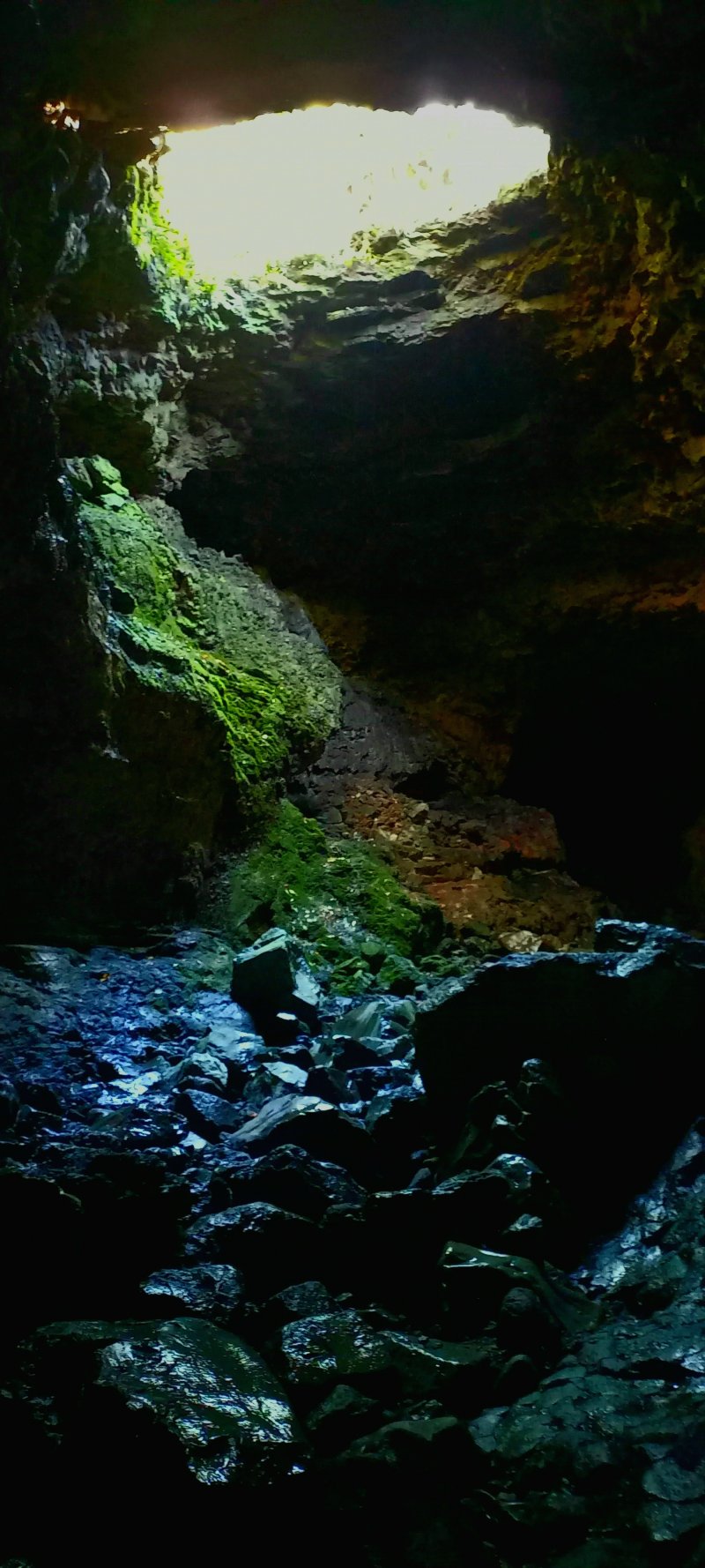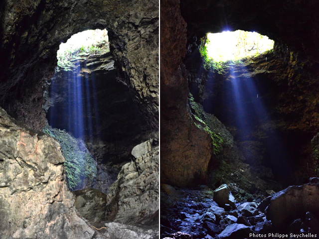 La sortie débute au plus près du rempart de la Rivière des Remparts, cette caldeira presque verticale qui isole l'îlet de Roche Plate de la zone du Volcan. Le sentier, constitué de marches nombreuses en bois et en pierre est assez étroit et en forte pente dans les branles qui le bordent (Photo 1). Il comporte d'assez nombreux lacets, des parties vertigineuses protégées de rambardes ou isolées du vide par la végétation (Photo 2). Le haut de la vallée de la Rivière des Remparts est totalement recouverte d'une belle forêt de bois de couleurs visitée uniquement des braconniers et des spéléologues à la recherche de nouveaux tunnels (Photo 3). La descente dure moins d'une heure pour rejoindre les superbes mapous et autres énormes arbres qu'on trouve dans la zone humide à la fin du sentier (Photo 4). L'endroit porte d'ailleurs le nom de cet arbre très présent à l'aire discrète que tout le monde utilise pour se reposer ou se ravitailler. Les premières grottes se situent à la fin de la descente et sont faciles à repérer. Quand on arrive à la pancarte en bois qui indique les directions, prendre à gauche le petit sentier arrivant très vite à l'effondrement qui paraît inaccessible. Longer la paroi sur quelques mètres sur de gros rochers moussus et descendre dans le lit de la rivière. La descente est très délicate et les racines indispensables pour se maintenir. Le premier tunnel est situé immédiatement sur la droite. Attention aux gros rochers lisses, humides ou moussus, en permanence arrosés par les gouttelettes tombant du plafond (Photo 5). Le tunnel lui-même est moins beau que ceux plus récents qui se visitent dans le Grand Brûlé. Le cadre, en revanche, surpasse largement. C'est le début d'une originale balade sportive dans un monde minéral peu connu puisque difficile d'accès. La lampe devient souvent indispensable pour apercevoir la suite de la galerie ou admirer quelques anciennes coulures accrochées au plafond (Photo 6). Les portions courtes sont naturellement éclairées par les rayons du soleil mais la lampe permet de surveiller où poser le pied (Photo 7). Profiter de l'effet de lumière qui passe par les ouvertures faites dans le plafond par les effondrements successifs (Photo 8). On peut ainsi se promener à l'ombre et à la fraîcheur pour se rapprocher d'une superbe arche naturelle surmontée par une trouée de la voûte (Photo 9). On a du plaisir à parcourir le fond du torrent à sec même s'il n'y a pas de tunnel (Photo 10). La pente devient un peu plus forte et s'approche d'une merveille de la nature représentée par le tunnel qui file vers le bas, surmonté d'une arche et d'une trouée où s'infiltrent les rayons (Photo 11). On retrouve ces lumières irisées à plusieurs endroits à condition de passer à la bonne heure, quand le soleil est haut (Photo 12). La descente prend fin à l'approche d'une profonde cavité creusée par une cascade, équipée par les professionnels mais infranchissable au randonneur. Il faut donc remonter à la surface, mais sans regret, car peu de gens peuvent admirer ces paysages uniques. Il est possible de remonter la ravine Citron Galet en amont du sentier mais on ne trouvera plus de ces tunnels. Reprendre le discret sentier pour retrouver l'ombre des mapous ou grands tamarins des hauts. Le sentier se poursuit vers Roche Plate, d'abord plat et humide avant de descendre de plus en plus en alternant les portions terreuses, basaltiques, caillouteuses (Photo 14 et Photo 18). On distingue très bien sur les photos satellites d'énormes cavités sur la gauche du sentier lorsqu'on descend. Elles ont toutes été visitées et de très discrètes sentes envahies de végétation permettent de s'en approcher au plus près. Attention de bien regarder où on met les pieds car la cassure arrive sans avertir et une chute serait fatale malgré la végétation qui a envahi ces énormes trous de plus de 20 mètres de diamètre (Photo 15 et16). Une astuce pour repérer ces minuscules sentiers : ils sont à peine visibles mais comportent presque tous un caillou de lave pour en marquer le début. Il est tout à fait normal que les professionnels ne créent pas de sentier officiel ou ne posent pas de cairns qui attireraient tout un chacun de passage dans le coin. Ces visites s'effectuent donc au gré de chacun. La carte ci-dessous marque trois de ces emplacements reconnus ; deux très visibles, un autre un peu plus bouché par la végétation. Les voir tous nécessiterait plusieurs heures supplémentaires. On reprend donc la descente jusqu'à la cascade de la Ravine Citron Galet, facile à repérer s'il y a de l'eau car elle coule à deux mètres du sentier avant de plonger dans une cavité sans fond et dangereuse (Photo 19). Si elle est à sec, comme ici, trouver le seul vrai départ de sentier sur la droite depuis le début de la descente (la cascade est marquée réglementairement d'un trait bleu sur la carte IGN). Prendre garde pour passer le haut de la chute puis remonter la ravine jusqu'à l'entrée d'un tunnel (Photo 20). Visiter ce nouveau havre de fraîcheur proposant également des trouées dans le plafond en partie bouchées par la végétation (Photo 21). L'endroit, plus court que les précédents, offre les mêmes lumières que plus haut (Photo 23). Le haut du tunnel est barré par une cascade et une pente forte s'il n'y a pas d'eau (Photo 24). Il faut donc rebrousser chemin jusqu'à la cascade du départ. Pourquoi ne pas rajouter un peu d'aventure supplémentaire en bifurquant à droite à la cascade et en rejoignant la ravine après avoir traversé une partie de la forêt de bois de couleurs. Les rives ne sont pas toutes abruptes et on rejoint facilement les galets après une centaine de mètres. Il suffit alors, après avoir flâné à la recherche de nouvelles curiosités, de prendre en rive gauche pour rejoindre le sentier en traversant une végétation facile à franchir. On peut désormais rejoindre le poi