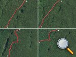 Un coup d'œil rapide à la photo satellite de la zone montre une multitude d'autres trous, cavités, effondrements, entrées de tunnels ou longues failles d'effondrement. Le trait rouge représente le tracé du sentier en direction de Roche Plate. Chaque cavité a été souvent explorée par des équipes de canyoneurs curieux de mieux connaître le sous-sol. S'ils peuvent s'en approcher pour descendre au fond, le randonneur peut également s'approcher pour en voir le bord. La seule difficulté réside dans l'art de retrouver la trop discrète sente utilisée quelques fois pour leur exploration. Ne pas oublier le caillou !! Les curieux responsables ne manqueront pas d'en découvrir d'autres.