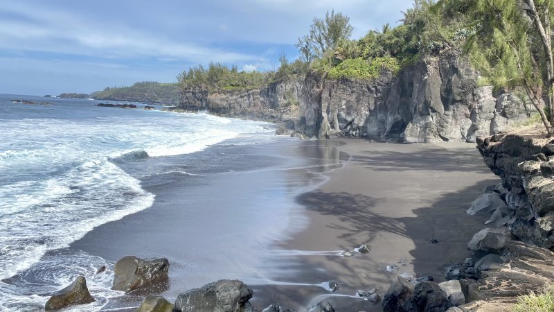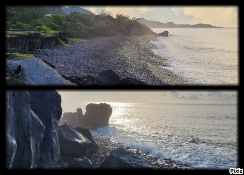 Parcours familial : La randonnée débute au parking situé près de la déchèterie de Saint-Joseph. En raison de la présence de chantiers, la meilleure solution consiste à partir sur la Rue de la Ligne François Martin et trouver, au tout début, le sentier qui part sur la gauche. Après une très courte descente, prendre la piste partant à droite. Cette piste, en bon état et entretenue, longe la rue puis bifurque sur la gauche dans les poivriers et le hautes herbes (Photo 1). Elle tourne ensuite à droite dans les hautes herbes vers la plage avec de nombreux pieds de ricin dans la végétation (photo 2). On parvient rapidement à la plage qu'on peut apprécier depuis le sentier bordé des pancartes d'interdiction. La petite falaise domine la plage très agréable et la Petite Île à l'horizon (photo 3). Si la mer est calme et basse, utiliser la rampe formée par les basaltes et laves pour descendre jusqu'au sable gris. Repérer les falaises équipées par les grimpeurs qu'on peut parfois voir à l'œuvre (photo 4), les cavernes plus ou moins profondes et les coquillages agglutinés sur les roches à quelques mètres de la mer. Si la mer n'est pas trop forte ou qu'elle est basse, la bande de sable est assez large pour rejoindre la suite de la plage (Photo 5). Des grottes plus profonde se trouvent facilement en longeant la falaise (Photo 6). Remonter par le même circuit et entamer la balade vers Saint-Joseph sur le sentier de bord. Il est totalement plat et bordé de grandes herbes au départ. En se retournant, on a de très belles vues sur l'ensemble de la plage et les falaises jusqu'à la Petite Île. Il pénètre ensuite dans un tunnel végétal constitué par les branches de poivriers (photo 8) puis descend en direction du radier bétonné sur la ravine Dominique (photo 9). Deux petits sentiers qui se rejoignant permettent de remonter après la ravine (photo 10). On remarque, de l'autre côté, la falaise qui se fissure et dont les roches ne resteront pas longtemps en place par forte houle (photo 11). Ne surtout jamais grimper sur ces roches pour faciliter leur chute. Le sentier, large et terreux repart en direction de Saint-Joseph dans les herbes. Sur la gauche, on profite de larges panoramas sur les collines environnantes qui dominent les prairies et champs du Lycée agricole (photo 13). Quelques filaos poussent sur le bord mais souffrent du vent et des embruns. Dès que la falaise s'effrite et que les racines sont exposées au sel, les arbres meurent et tombent à l'eau (photo 16). Les lavangères couvrent d'assez grandes surfaces en bordure de falaise (photo 15). Il est vrai qu'elles supportent mieux le sel que les filaos. Le sentier se rapproche au plus près du bord sans devenir dangereux (photo 14). Il s'en éloigne parfois pour s'approcher des champs (photo 17). Le sentier, large et sec est toujours agréable dans les herbes (photo 20). Des petites sentes utilisées par les pêcheurs sont sûres et peuvent être empruntées par les marcheurs. Il faut traverser de larges plaques de laves et de terre avant de parvenir à une minuscule ravine venant du cimetière (photo 21). Elle se traverse sur une petite passerelle en planche et la balade se poursuit vers la ville en s'approchant de la plage de galets qui a remplacé la falaise (photo 22). Marcher jusqu'à une ancienne aire de pique-nique dans l'herbe qu'on reconnait aux anciens socles bétonnés de kiosques (photo 23). La sortie familiale peut très bien s'arrêter là et repartir vers le départ pour rejoindre la plage de Petit Sable pour profiter de son sable gris mais pas de ses vagues dangereuses à plusieurs titres.