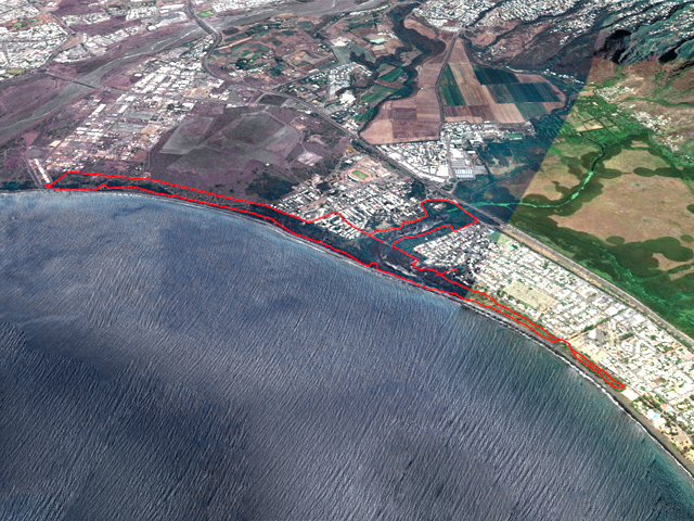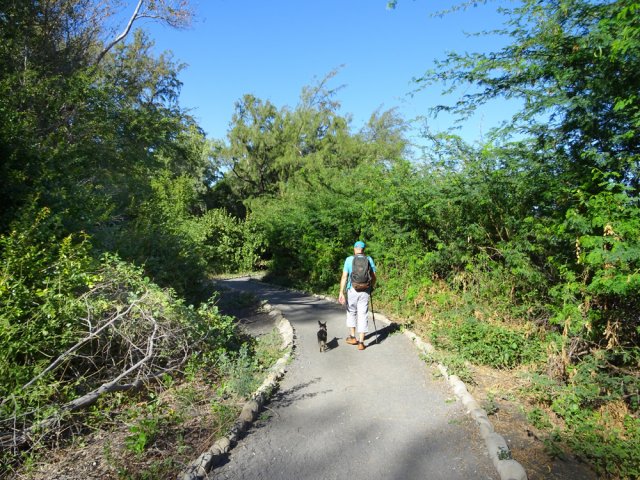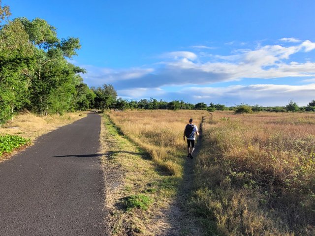 La randonnée débute au parking situé en bordure d'étang à la fin de la Rue de la Croix. Il est vaste, ombragé et très fréquenté toute l'année par les sportifs et même par quelques familles utilisant les emplacements vieillissants d'aires de pique-nique presque abandonnées. Entamer la boucle par la piste partant en direction de l'étang et du pont métallique qu'on devine dans la trouée (Photo 1). C'est l'ancienne voie de chemin de fer qui reliait Saint-Pierre à Saint-Denis, transformée en piste après enlèvement des rails. La longue passerelle métallique au plancher de bois traverse l'Etang Saint-Paul. Repérer, avant le pont, le sentier descendant à droite vers les berges en rive gauche. Les curieux désirant rajouter 2 km à la boucle effectueront le tour complet des queues de l'étang en rejoignant la Chaussée Royale. Un agréable sentier bordé de galets longe l'étang, se transforme en sentier étroit dans les traînasses, rejoint une rue près d'un lotissement que l'on contourne en suivant un grillage avant de retrouver la Chaussée Royale (Photo 2). Partir à gauche sur 400 m de rues en franchissant le pont de l'étang puis le rond-point de Savannah avant de rejoindre le bord de l'étang envahi de jacinthes d'eau (Photo 3). Des emplacements pour pêcheurs et barques de fortune confirment la présence de poissons dont 4 espèces d'anguilles (Photo 4). Il est très facile de longer l'étang dans la prairie qui le borde ou de se promener dans la cocoteraie abritant une dizaine de taphiens de Maurice, des chauve souris grises et blanches d'une envergure de 40 cm passant une grande partie de leur journée pendues sous les feuilles des grands arbres. Solitaires, elles se remarquent pourtant assez aisément en prêtant attention (Photo 5). L'opération amusera assurément les enfants tout en donnant un côté ludique à cet écart des sentiers battus. Quitter les chiroptères et poursuivre en franchissant une petite passerelle (Photo 6). On rejoint en quelques enjambées le parcours venant de la passerelle. Ne pas hésiter à en franchir une partie pour bénéficier de splendides panoramas sur l'étang et les prairies d'altitude au-dessus de Bois de Nèfles (Photo 7). Poursuivre vers le nord en prenant le chemin verdoyant entre les habitations (Photo 8). Il se termine au milieu des fleurs à la Rue Jacquot qu'on emprunte en partant vers la mer. Remonter vers le nord en longeant le collège sur une agréable petite route ombragée et fleurie (Photo 9). On rejoint plus loin la route circulaire effectuant le tour de la Plaine Chabrier après la zone de la gendarmerie. Afin d'éviter de trop marcher sur route, ne pas hésiter à entreprendre la traversée par un sentier bien marqué sur la droite (Photo 10). Le terrain est plat, la végétation rare et les herbes séchées ne cachent pas le passage (Photo 11). Les joggers en ont fait leur circuit de footing et la traversée s'effectue sans surprise (Photo 12). On devine la présence de gros plots en béton qui, à l'époque, maintenaient les câbles tendus de tous côtés pour tenir l'antenne verticale. On bénéficie souvent de larges panoramas sur les montagnes en direction de la Possession ou de Mafate. Une fois la route retrouvée, marcher sur la petite route jusqu'à la barrière fermant l'accès à la base ULM de Cambaie. Quelques mètres après cette barrière, un large sentier file en direction de la plage que l'on devine déjà au bruit des galets roulés par les vagues. Là aussi, pas de question à se poser sur la direction (Photo 13). Les épineux deviennent de plus en plus touffus à l'approche de la plage. Longer galets et sable en suivant les milliers de traces de pas ou de pneus (Photo 14). Trouver la première piste à un panneau du conservatoire du Littoral ayant beaucoup souffert. Quitter le sable gris remplissant les chaussures pour emprunter une piste ombragée où d'importants travaux de défrichages ont été entrepris (Photo 15). La balade s'effectue sous les tamarins d'Inde à quelques mètres de la plage (Photo 16). Elle frôle aussi le talus bordant les galets en offrant quelques beaux points de vue sur le Cap Lahoussaye et le tunnel de la tranchée couverte de Saint-Paul (Photo 17). On s'approche à nouveau de la route circulaire de la Plaine Chabrier mais un sentier permet de l'éviter au plus près du littoral. Quitter la route pour pénétrer sous le couvert des filaos afin de retrouver les pistes fréquentées des sportifs dans le Parc de la Poudrière (Photo 18). Là encore, la marche est un réel plaisir s'il ne fait pas trop chaud (Photo 19). Ce large sentier se poursuit jusqu'à l'embouchure de l'étang d'où l'on peut apercevoir le pont métallique emprunté en début de boucle (Photo 20). Un panneau très intéressant donne des informations de qualité sur la création de l'étang ou sur la faune et l'on apprend la différence entre diadromie, amphidromie et catadromie ! On y découvre également qu'une batterie militaire a été découverte sous le sable de l'embouchure. L'endroit se prête idéalement à une halte reposante (Photo 21). Le sentier repart en direction du pont mais il est très facile de poursuivre sur une trace entre galets et acacias (Photo 22). L'aspect du gué entre mer et étang change continuellement au cours d'une année ; passage les pieds mouillés en période pluvieuse ou gros tas de galets après les fortes houles (Photo 23). Entamer une boucle sur le parcours sportif qui a perdu nombre de ses spots d'exercices mais reste en très bon état (Photo 24). Constamment bordée de galets alignés, la piste est usée par les passages (Photo 25). Il est possible de revenir au point de départ au grand virage sud mais un autre endroit mérite une dernière balade. Rejoindre le trottoir, traverser la petite ravine en marchant vers Saint-Paul et entamer une nouvelle boucle très bien entretenue, identique au parcours sportif (Photo 26). En arrivant près du CREPS, faire