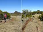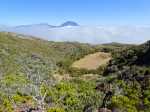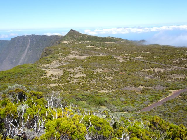 La randonnée débute à l'aire de repos très connue du Nez de Bœuf où les emplacements sont nombreux. Il est préférable de grimper immédiatement au sommet de Nez de Bœuf tant que la météo est clémente. Le sentier débute au plus près de la route par une courte mais forte montée. Il suit la crête séparant la route du volcan et l'aire de pique-nique. Plus loin, en arrivant sous les petits tamarins, on coupe le sentier se dirigeant vers les Trous Blancs. Poursuivre jusqu'au sommet du Nez de Bœuf par une pente moyenne comportant quand même quelques courts raidillons. Seuls les 30 derniers mètres méritent un peu d'attention à cause du vide et du sol glissant (Photo 1). Une fois sur la plateforme cimentée du sommet, il est difficile de songer à la descente car les paysages alentour sont à couper le souffle. Les plus impressionnants donnent vers la Vallée des Remparts et Roche Plate (Photo 2), les plus champêtres vers les prairies de la Plaine des Cafres (Photo 3), les plus sauvages sur la plaine qui entoure le Nez de Bœuf (Photo 4). On peut même profiter de cette halte pour imaginer la randonnée que l'on va effectuer en devinant le nom des petits sommets. Entreprendre la descente sans glisser jusqu'au croisement du sentier des Trous Blancs. Bifurquer à droite, descendre par le GRR2 vers la petite plaine accueillant l'aire de repos. La traverser avant de franchir la route du Volcan et d'emprunter le sentier qui mène au Lac Argamasse (Photo 5). Que l'on prenne le sentier ou la piste récemment rénovée, il faudra rapidement prendre à droite dans les branles verts puis poursuivre sur un sol creusé le plus souvent par les nombreux passages. Le sentier est soit étroit dans les branles et ambavilles, soit creusé dans le sol, soit large et sableux (Photo 6). Il traverse plus loin un joli bois de petits tamarins et de branles blancs pour une agréable marche à l'ombre (Photo 7). Les points de vue sont omniprésents et il faut s'habituer à ne pas quitter des yeux le Piton des Neiges et les autres plus grands sommets de l'île. On traverse quelques clairières au sol herbeux ou rocheux. Laisser une bifurcation de sentiers puis poursuivre jusqu'à une courte portion rocheuse. Ne pas manquer le discret sentier partant sur la gauche dans les branles verts au pied des roches recouvrant une partie du sentier (Photo 8). Si on le manque, ce n'est pas grave puisque le sentier principal mène également au lac. Il comporte quelques marches par endroits en grimpant sur le flanc sud du cratère entourant le lac (Photo 9). Il rejoint un peu plus loin le sentier venant du Chalet des Pâtres par le Piton Rouge et le Piton des Herbes Blanches. Partir à droite et entamer la descente vers le Lac Argamasse, tari en cette période de sécheresse (Photo 10). Longer le sentier entre le lac et la végétation. Trouver un des trois sentiers étroits montant vers le sommet à travers la végétation touffue, la trace se distingue encore bien (Photo 11). On bénéficie des plus beaux panoramas sur la Plaine des Palmistes (Photo 12) et sur le lac lui-même. Les amateurs poursuivront sur la trace qui longe la ligne de crête, sinon, faire demi-tour puis descendre vers le lac. Il est possible d'en faire le tour en prenant garde de ne pas glisser ou s'embourber dans le marécage qui entoure la petite étendue d'eau (Photo 13). Reprendre vers l'Est en direction du Piton Textor, impossible à manquer avec ses grandes antennes installées à son sommet (Photo 14). Quelques parties terreuses, rocheuses et des lacets courts permettent d'atteindre sans difficulté le sommet couvert d'antennes. Rejoindre la piste, prendre à gauche puis suivre le grillage de clôture pour arriver à la zone de décollage des parapentes et aux superbes vues sur la Plaine des Palmistes. L'itinéraire contourne le grillage et le petit mur d'enceinte puis pénètre dans une végétation facile à passer. Il rejoint plus bas la large plaine herbeuse entre les Pitons Textor et de Caille. Franchir la ravine et marcher en direction du Piton Doré sur un sentier très agréable dans les petites herbes. On longe les flancs du Piton de Caille qui baissent au fur et à mesure de la progression. On a encore les antennes comme repère en marchant sous quelques petits tamarins (Photo 15). Quand le terrain est presque plat, trouver sur la droite un sentier discret débutant dans la végétation. Il est parfois très bien marqué, parfois difficile à suivre mais on distingue devant soi les première pentes descendant vers la prairie qui en occupe le fond. Prendre à droite dans la végétation, traverser un petit bois de tamarins puis trouver le meilleur passage pour atteindre le sommet (Photo 16). Les randonneurs peu habitués aux hors sentiers devront toujours chercher les passages créés par les bovins même s'ils ne viennent plus sur le piton, mais une grande partie de la montée s'effectue sur une trace très visible. On passe au plus près de grands tamarins qui n'ont pas résisté aux incendies de 2013 mais créent de belles natures mortes (Photo 17). On peut sans danger parcourir l'ensemble de la crête et se régaler des nouveaux panoramas offerts depuis les 2184 mètres du sommet et des vues sur le centre du cratère recouvert d'herbe (Photo 18). Après avoir effectué un long demi-cercle à suivre l'arête, repérer au pied du Piton de Caille la route passant au sud (Photo 19). Redescendre à l'instinct en visant cette route forestière qui relie les prairies du Piton de l'Eau. On peut passer n'importe où sans danger, que le sol soit dénudé ou recouvert de courte végétation (Photo 20). On arrive près d'une ancienne carrière d'extraction ou le long d'une petite ravine avant de rejoindre la piste. Marcher sur le sol poussiéreux sans crainte de voir passer un véhicule (Photo 21). Rejoindre la route du volcan ou traverser la prairie pour rejoindre le petit sentier qu'on devine dans la montée au Piton de Sable. La tr
