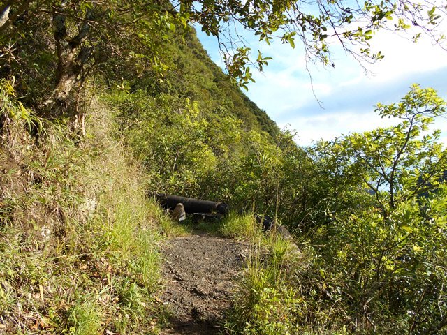 La randonnée débute au bord de la Route Forestière de la Plaine d'Affouches qu'il aura fallu suivre durant plusieurs kilomètres avec le véhicule mais sur un sol correct et carrossable, ne comportant que de rares nids de poules. On ne peut pas manquer le sentier venant du Colorado, bien visible, à gauche de la RF, à ses 1000 mètres d'altitude. Plusieurs places de parking sont prévues pour d'éventuels départs depuis ce point. La portion de route qui suit est longue et poussiéreuse (Photo 1) mais traverse d'agréables paysages permettant également de beaux panoramas de tous côtés (Photo 2). Dans les virages proches du rempart, on a sous les yeux une bonne partie du trajet à effectuer sur piste (Photo 3). Plus on monte et plus le Gros Morne dépasse à l'horizon (Photo 4) tandis qu'on s'éloigne du port aperçu à l'horizon (Photo 5). A l'approche du kiosque d'Affouches, repérer la crête du rein qui descend en direction de l'Îlet à Guillaume (Photo 6). C'est là qu'on rencontrera les échelles pour franchir les parties difficiles. A partir du kiosque, se méfier des cailloux qui peuvent tomber de la falaise après la barrière. Un sentier a été créé pour ce contournement. Pour cela, partir à droite après le kiosque, monter un raidillon et marcher en direction du Piton Fougères. Emprunter ensuite le sentier à gauche au premier croisement puis rejoindre la route par quelques marches dans une végétation fournie. Les "risque-tout" qui veulent encore passer par la route se méfieront des mini-éboulis, surtout en période humide qui facilite le détachement des pierres. La route forestière devient de plus en plus tortueuse, rajoutant du kilomètre sans augmenter l'effort car elle est assez plate. Après plusieurs lacets sur la piste qui devient de plus en plus herbeuse (Photo 7), on traverse le Bras Guillaume et la piste oblique vers le rempart qu'on devine derrière la forêt de cryptomerias (Photo 9). Moins d'un km plus loin, on rencontre le sentier de la Roche Ecrite dans un lacet au milieu d'une végétation comportant de très hauts fanjans (Photo 10). La Roche Ecrite se rejoint en partant à droite mais la distance est encore grande pour parvenir au gîte. Prendre à gauche vers l'Îlet à Guillaume et traverser la forêt de cryptomerias bien plus ombragée que ce que l'on vient de parcourir (Photo 11). La forêt de bois de couleurs prend le relais mais les goyaviers ont débuté leur colonisation (Photo 12). La pente n'est jamais très forte, des lacets serrés en diminuent la sensation (Photo 13). La forêt devient plus clairsemée et le sentier emprunte une crête assez étroite. Heureusement des échelles et des rambardes aident et protègent ces passages même si les arbres et arbustes diminuent la sensation de vertige (Photo 14). Les échelles, de bonne qualité, aident également à franchir les passages les plus abrupts (Photo 15). Hormis les goyaviers, on traverse de belles forêts aux essences variées rendant très agréable cette randonnée (Photo 16). La pente forte est régulière. Elle permet d'embrasser du regard la vallée du Bras Guillaume et celle de la Rivière Saint-Denis (Photo 17). Un sentier très ancien descendait dans la vallée du Bras Guillaume mais il devient très difficile à repérer (Photo 18). Le sentier est bordé de branles verts et bien sûr de goyaviers. Plus bas, ne pas manquer d'écraser quelques feuilles de camphriers pour l'odeur agréable de leur sève. Un panneau sous les arbres annonce l'Îlet à Guillaume très proche (Photo 19). Une petite halte respectueuse au cimetière toujours bien entretenu (Photo 20) précède l'arrivée à l'îlet à Guillaume dont il ne restera bientôt plus de vestiges car la végétation reprend ses droits. Des fouilles récentes tentent d'étudier le lieu de manière scientifique (voir § ci-dessous). Quelques vestiges sont heureusement trop lourds pour quitter le lieu dans un sac à dos (Photo 21). Contourner la case pour rejoindre le rempart à l'arrière où une esplanade herbeuse peut donner l'occasion d'un casse-croûte agréable sous les cryptomerias. Le sentier qui descend vers la passerelle comporte des portions qui longent des murets mis à mal par les racines de jamrosats (Photo 22). Plus bas, il est parfois encombré de plantes mais reste visible. Ralentir le pas pour éviter une possible glissade car les jouvences cachent des cailloux glissants. La passerelle vieillit lentement et des panneaux interdisent son utilisation (Photo 23). Une déviation, sous la passerelle, permet de suivre un peu le Bras Guillaume (voir § ci-dessous) avant de reprendre le sentier officiel le long de la canalisation. La remontée vers le Colorado est régulièrement remise en état pour entretenir les installations (Photo 24). Des traces de soudure montrent que la chute d'une grosse pierre peut faire de gros dégâts. Eviter cet itinéraire en cas de fortes pluies qui sont presque toujours à l'origine des chutes et glissements de terre ou de cailloux. Le tuyau est toujours visible en bordure de sentier (Photo 25). Il comporte quelques parties bétonnées pour protéger le transport de l'eau (Photo 26). La pente est rarement forte et la marche assez rapide. Le petit calvaire sur la gauche ainsi que les filaos marquent la fin de la montée le long de la canalisation. Il suffit alors de prendre totalement à gauche, de pénétrer dans un tunnel sombre créé par la végétation dense. Ensuite, longer le rempart qu'on vient de gravir pour rejoindre la route forestière sur le sentier des Goyaviers, très fréquenté et agréable, bordé de fougères et brandes classiques poussant entre 700 et 1000 m (Photo 28).