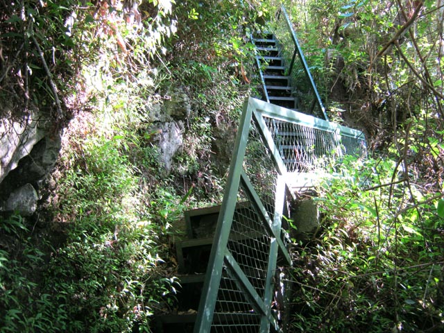 L'îlet à Guillaume est abandonné depuis fort longtemps mais il est parfois nettoyé et permet d'effectuer d'émouvants pélerinages. La case tient encore sur ses murs de tôle mais pour combien de temps ? Paradoxalement, le cimetière situé à la fin de l'allée bordée de cryptomerias est bien réhabilité et très propre. Le sentier qui vient du Colorado a été remis en état et la longue passerelle au-dessus de Bras Guillaume s'évite désormais par une déviation traversant la rivière à gué. Le sentier qui vient de la RF de la Plaine d'Affouches est également en très bon état, bien signalisé et entretenu. Que les arachnophobes se préparent à la descente envahie d'énormes bibesEnormes araignées qui peuvent atteindre 8 à 10 cm d'une patte à l'autre. dont les toiles bouchent parfois le sentier. Le passage s'effectue à un moment sur l'arête mais ne comporte pas de danger particulier. On a, depuis une des échelles, une très belle vue sur la modeste cascade du Bras Guillaume qui n'a beaucoup d'eau qu'en période pluvieuse. Le passage le plus risqué sur la route du Kiosque d'Affouches a été contourné par un sentier qui démarre sur le sentier du Piton Fougères. Il évite ainsi, par un court détour, les multiples éboulis sur la RF qui peuvent s'avérer dangereux. La randonnée, très agréable dans ce sens, devient plus sportive dans le sens inverse, surtout à cause de la montée située après l'Îlet à Guillaume (voir profil).